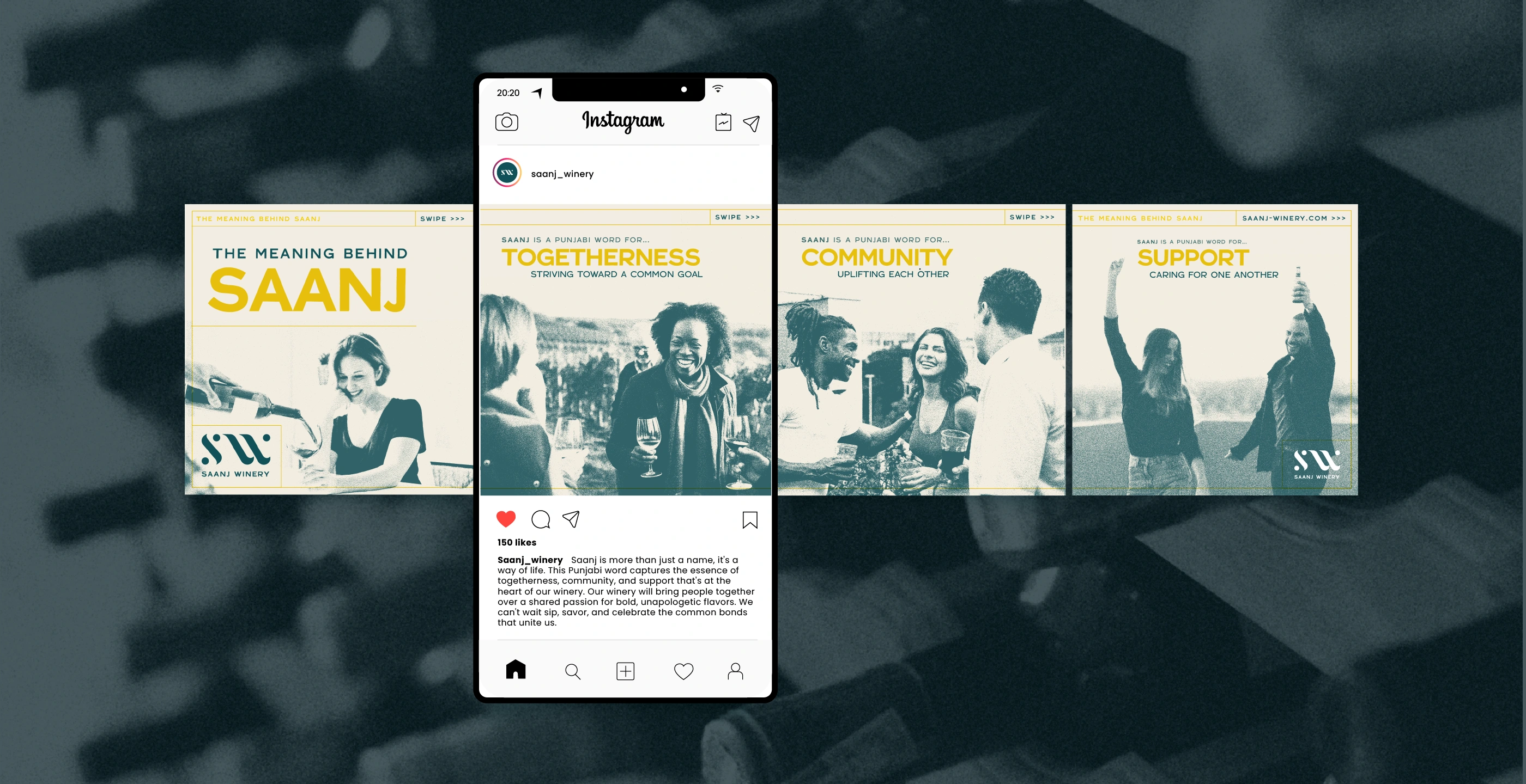 The name "Saanj," a Punjabi word meaning "coming together to uplift the community," became a cornerstone of our design process. It inspired us to create a brand that not only represented the founders' cultural heritage but also embodied their mission to uplift the community and connect through wine.