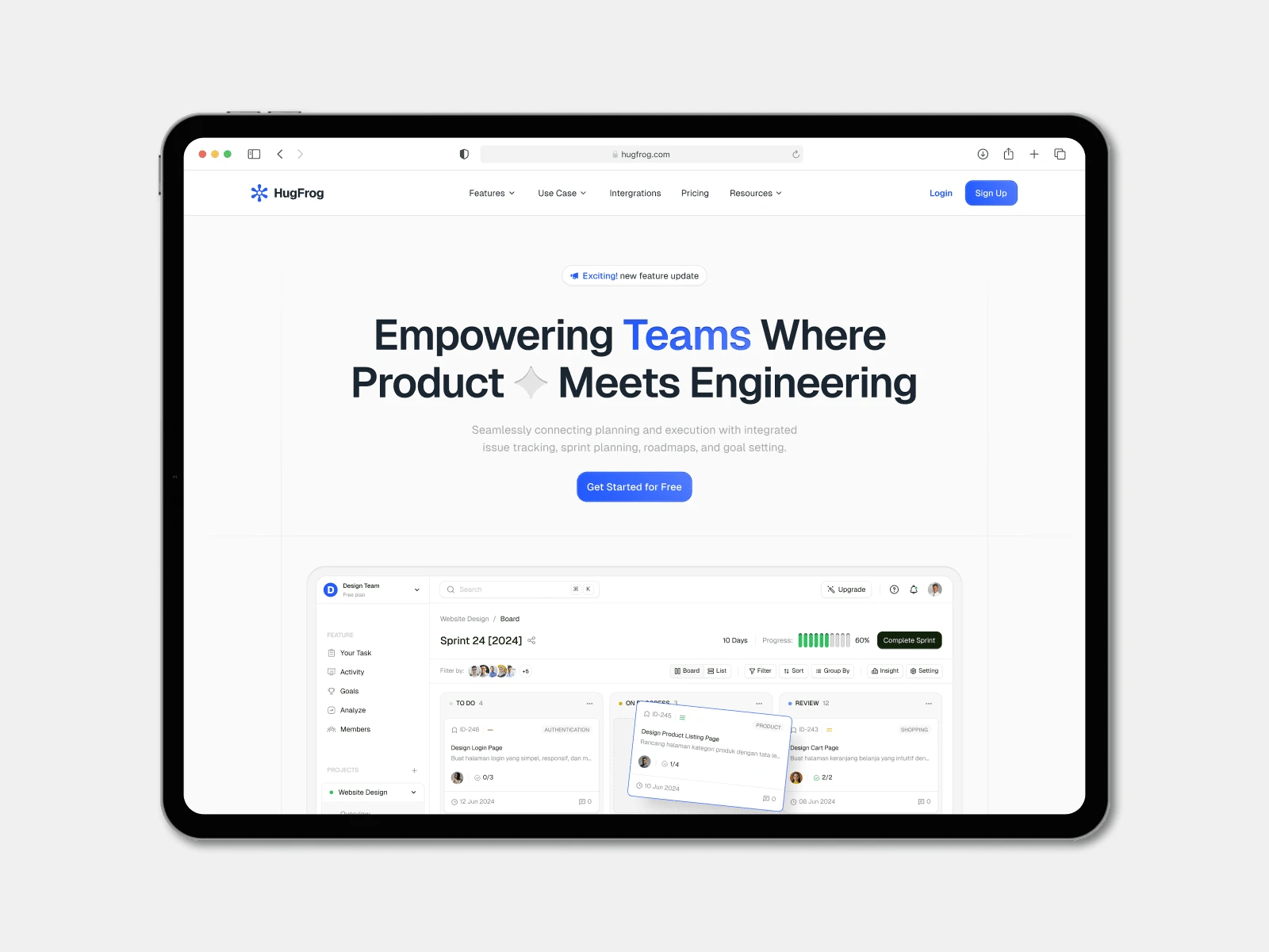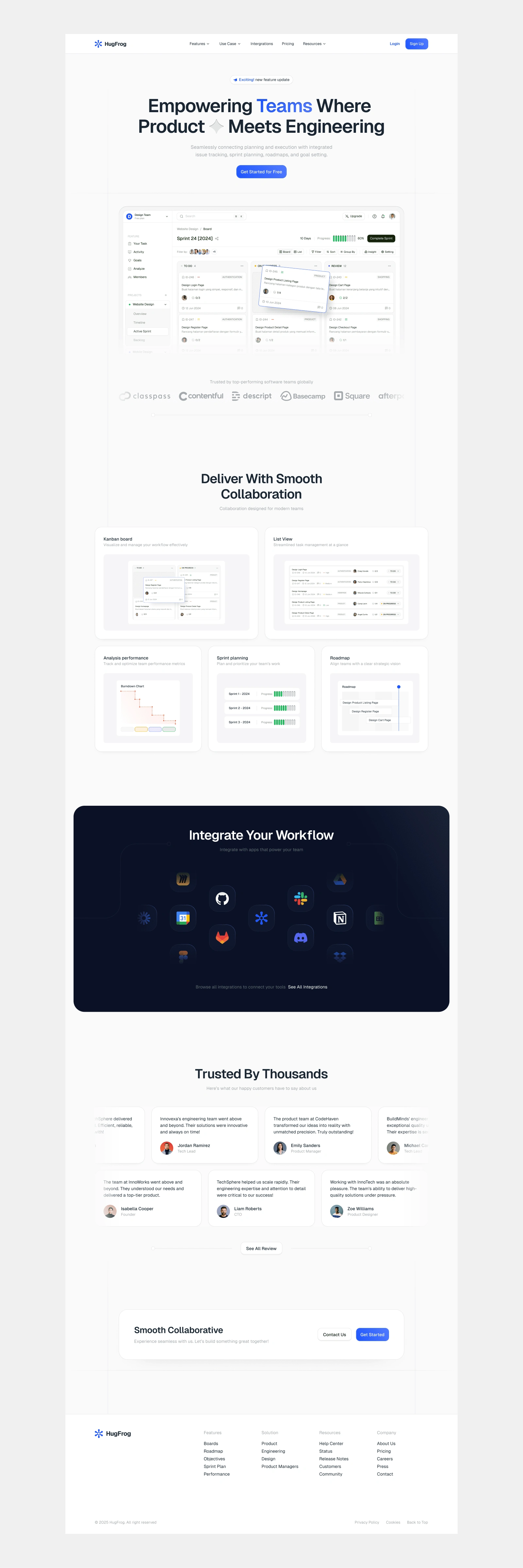 Design and Developed a modern and intuitive landing page for HugFrog, a platform that seamlessly connects product planning with engineering execution. The design emphasizes clarity and user engagement, effectively showcasing HugFrog's features and benefits to potential users.