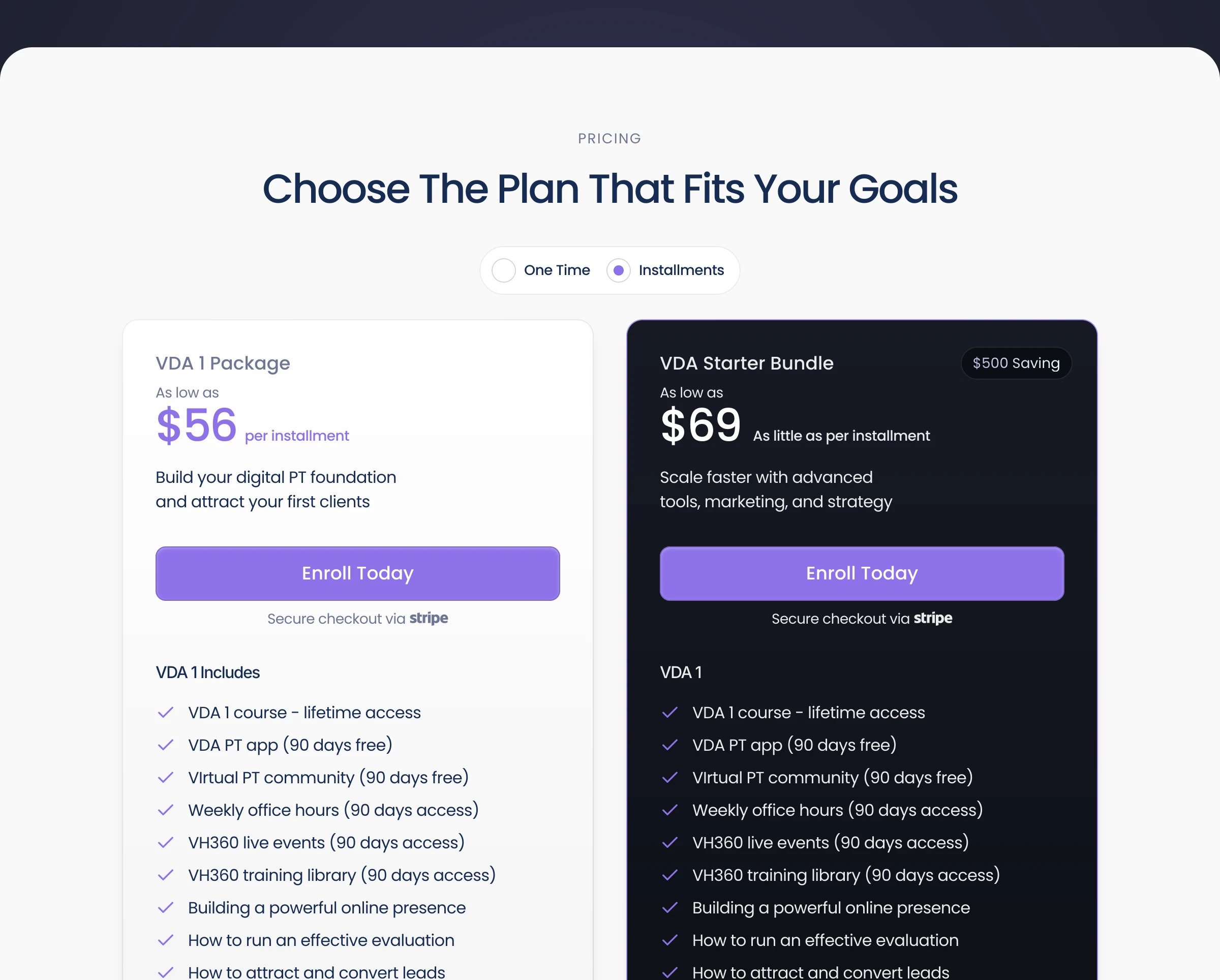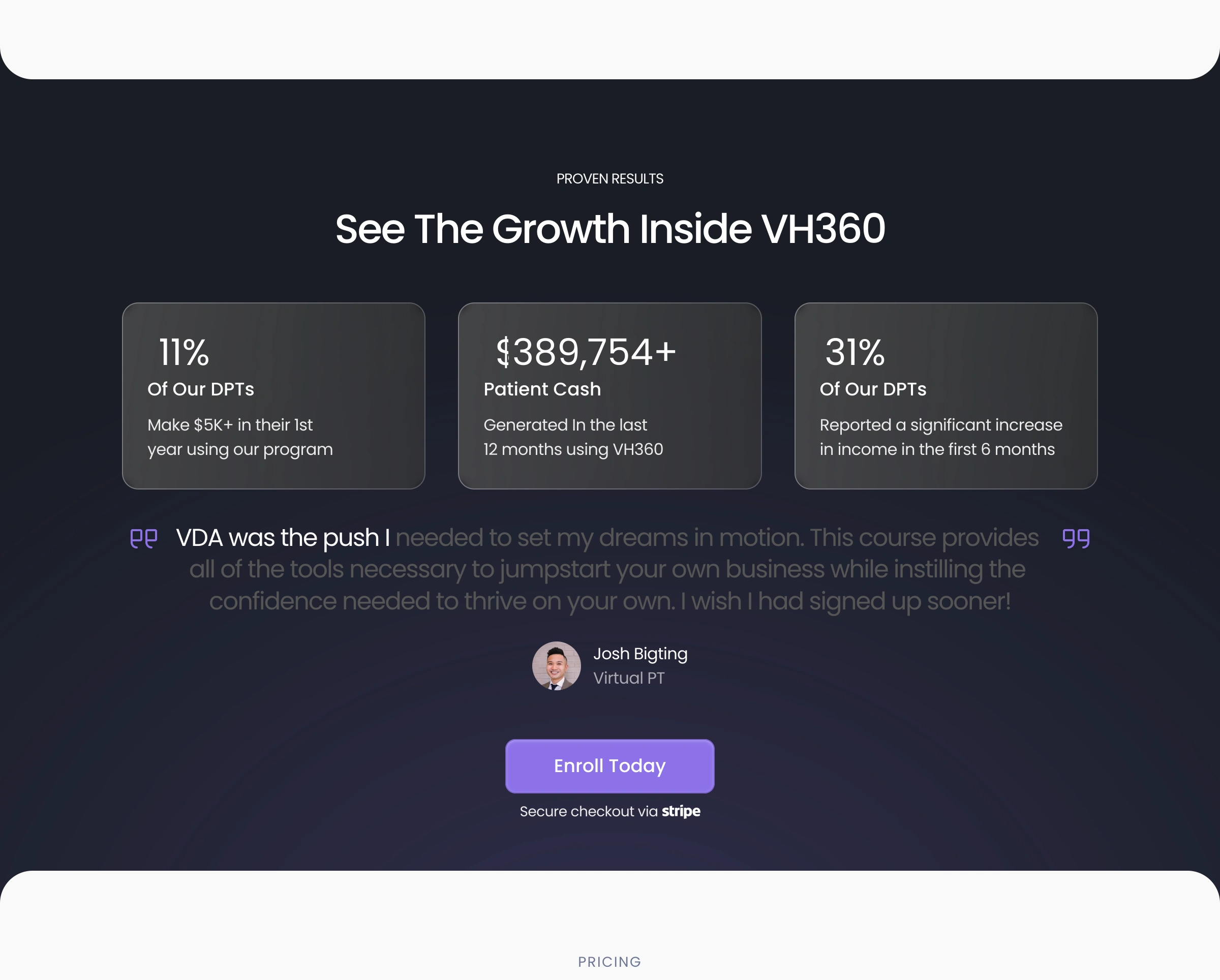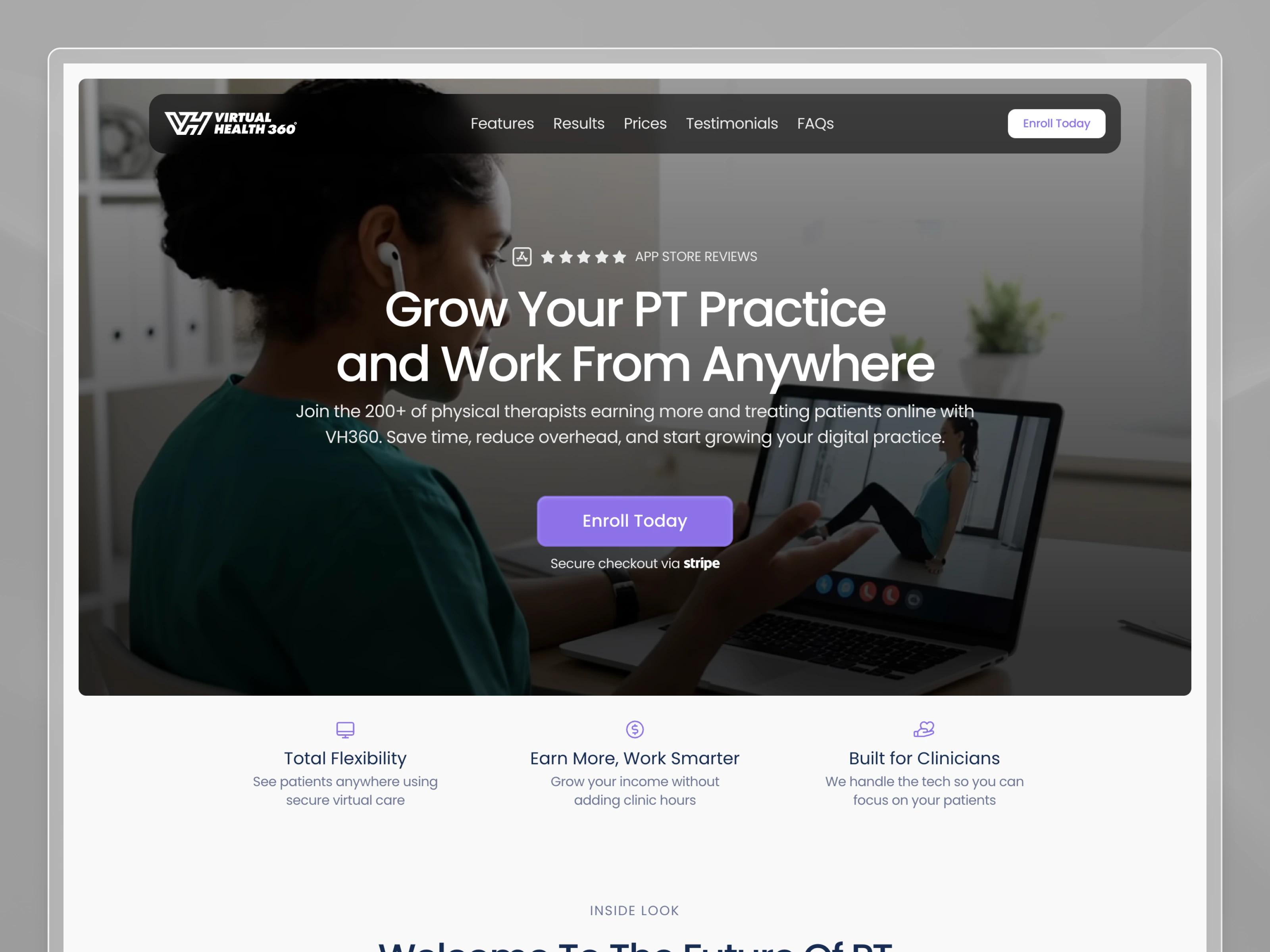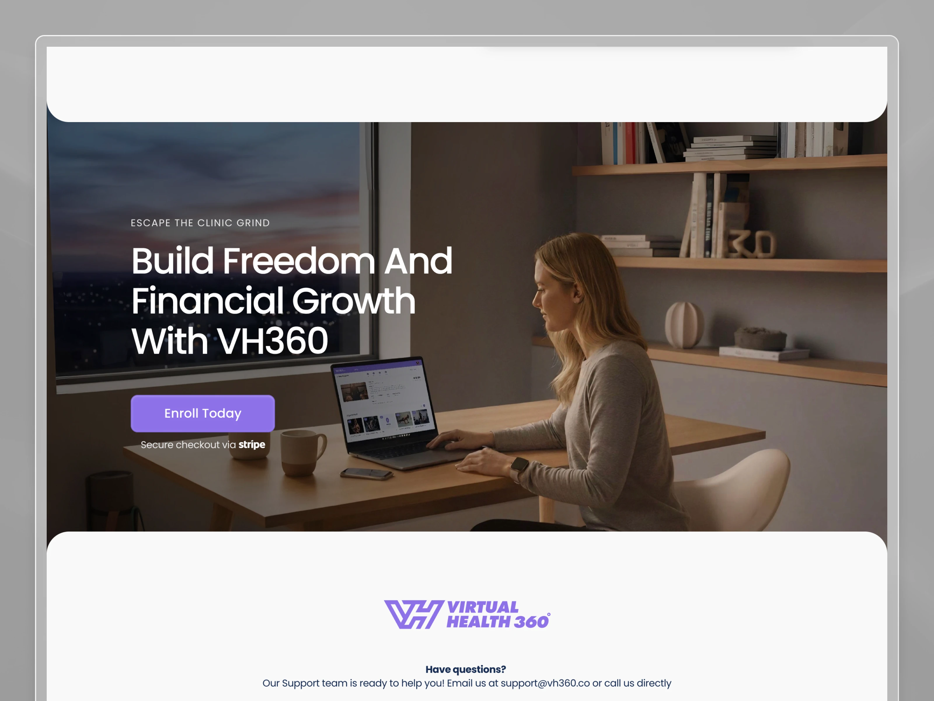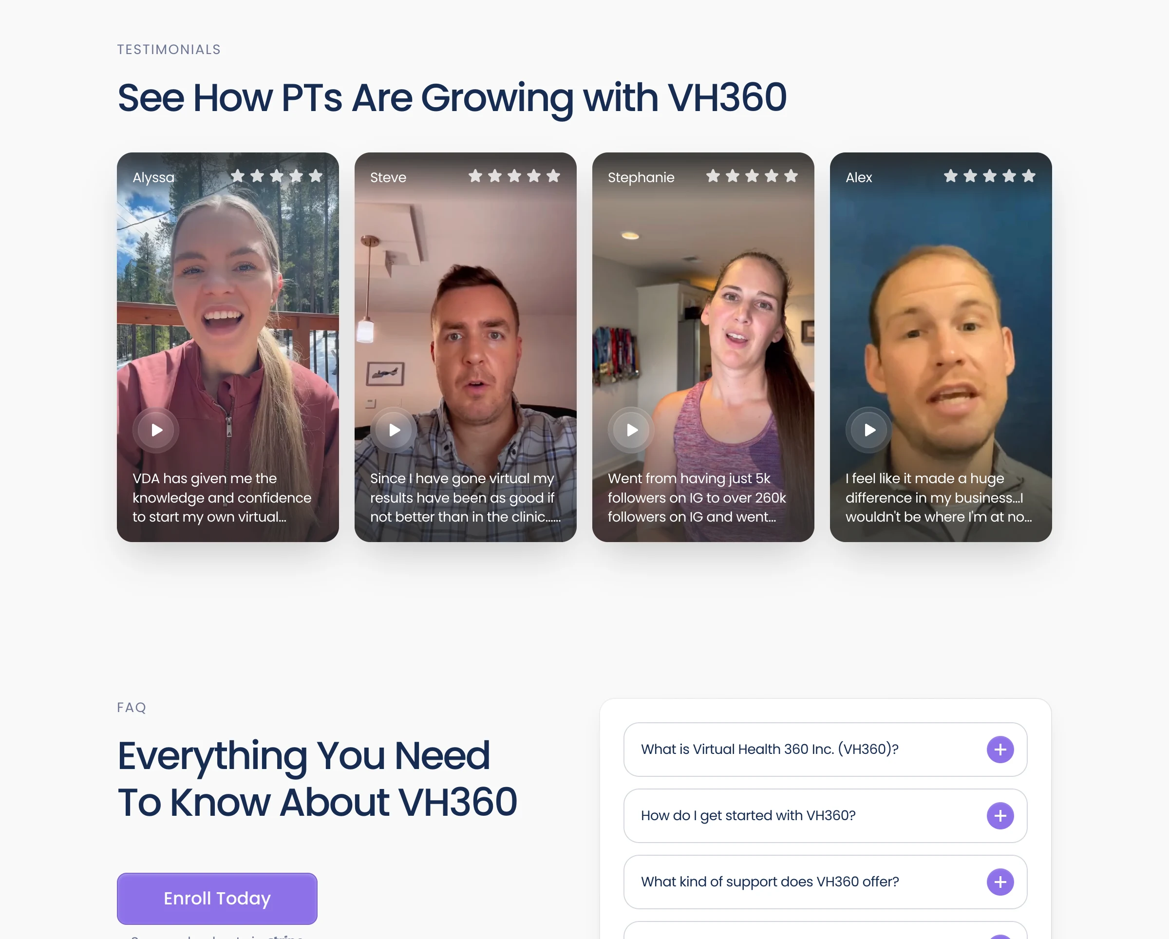 Description: I designed and built a clean, conversion-focused sign-up page for VH360, a virtual health platform for physical therapists. The goal was to simplify onboarding, highlight platform value, and build trust through testimonials and benefit-driven design.