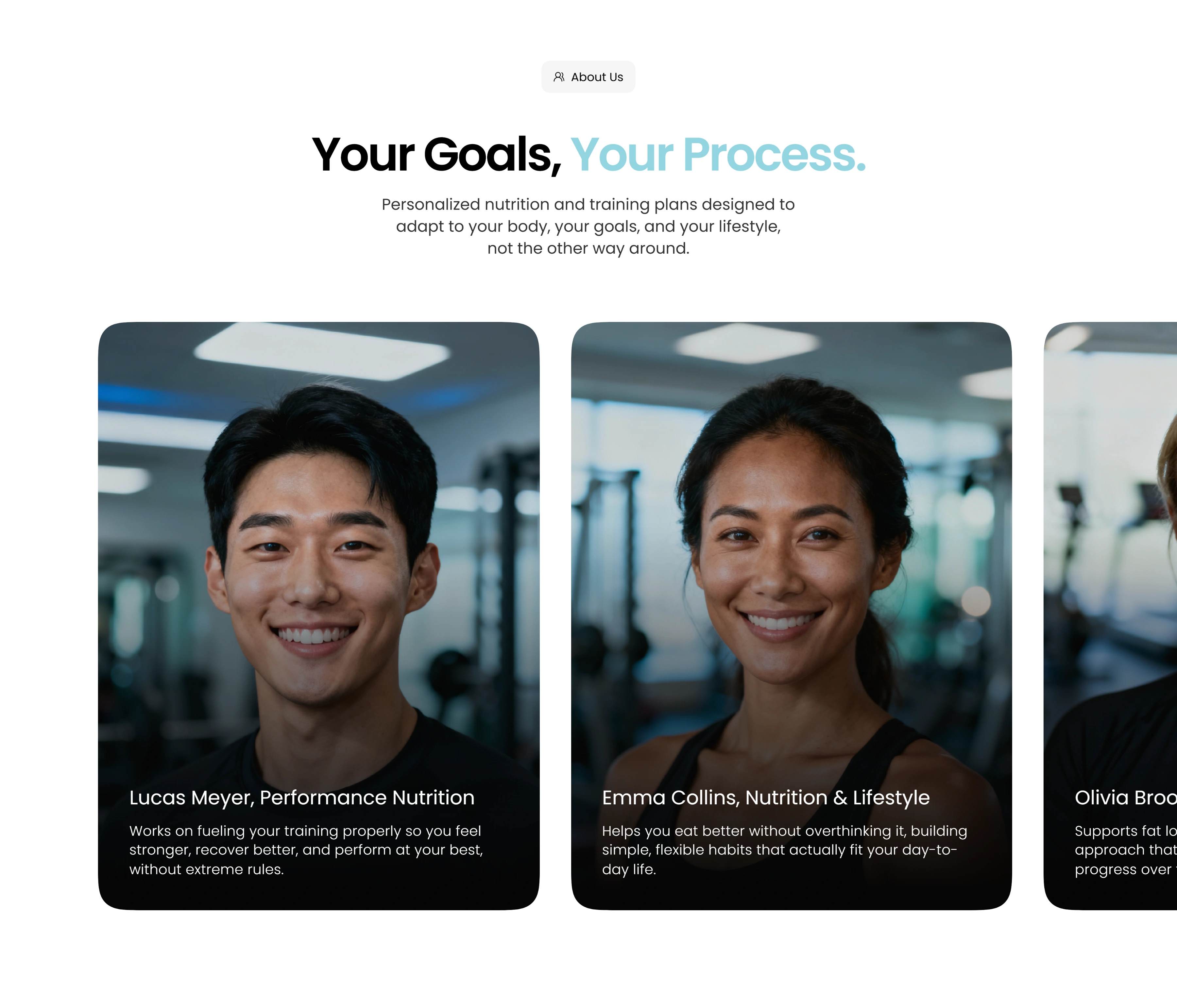 A core part of the project was highlighting the team of nutritionists and personal trainers as real people, not just titles or credentials.