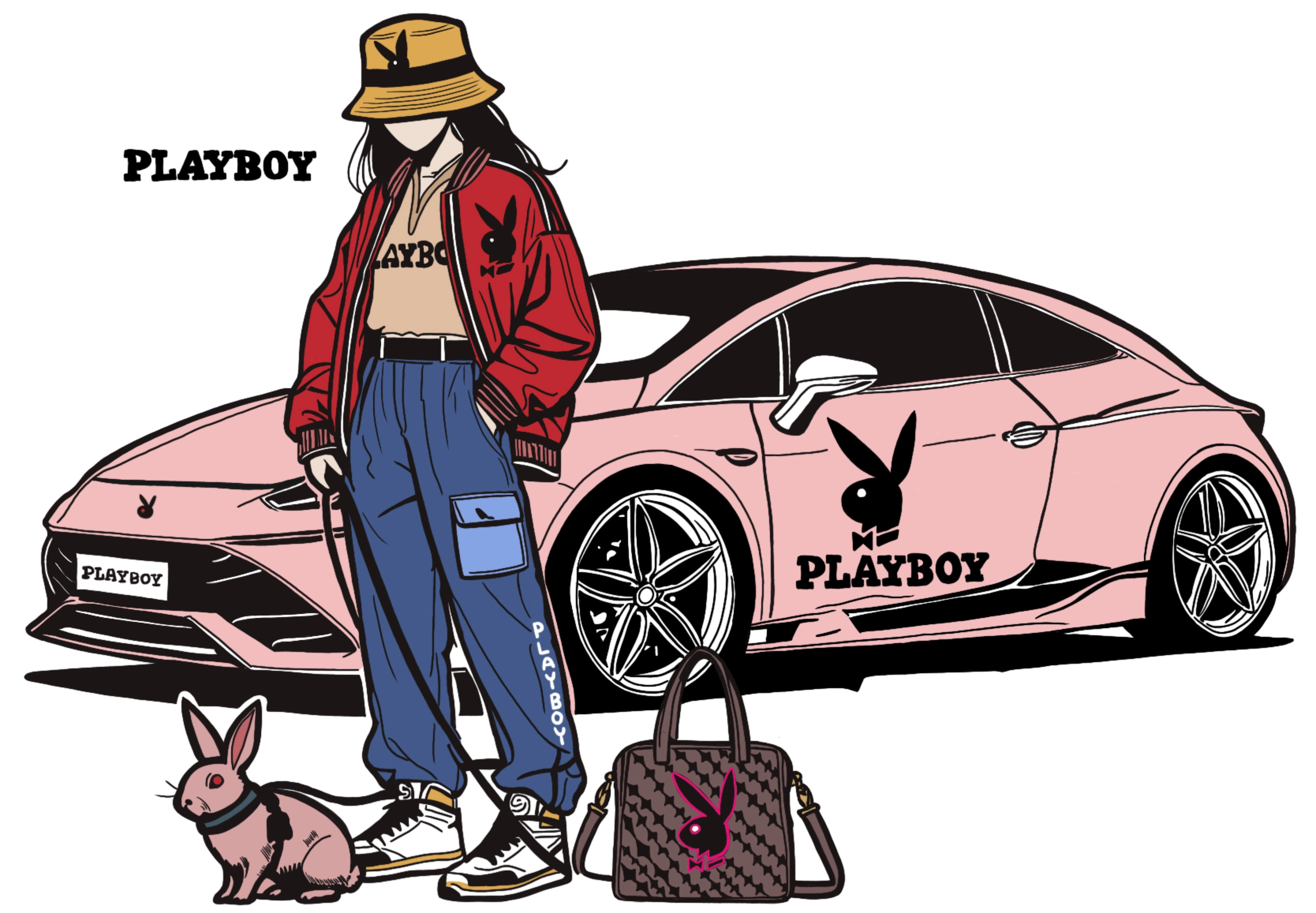 A bold concept illustration integrating fashion, auto, and lifestyle elements of the Playboy brand. Highlights streetwear, custom car design, and personality.