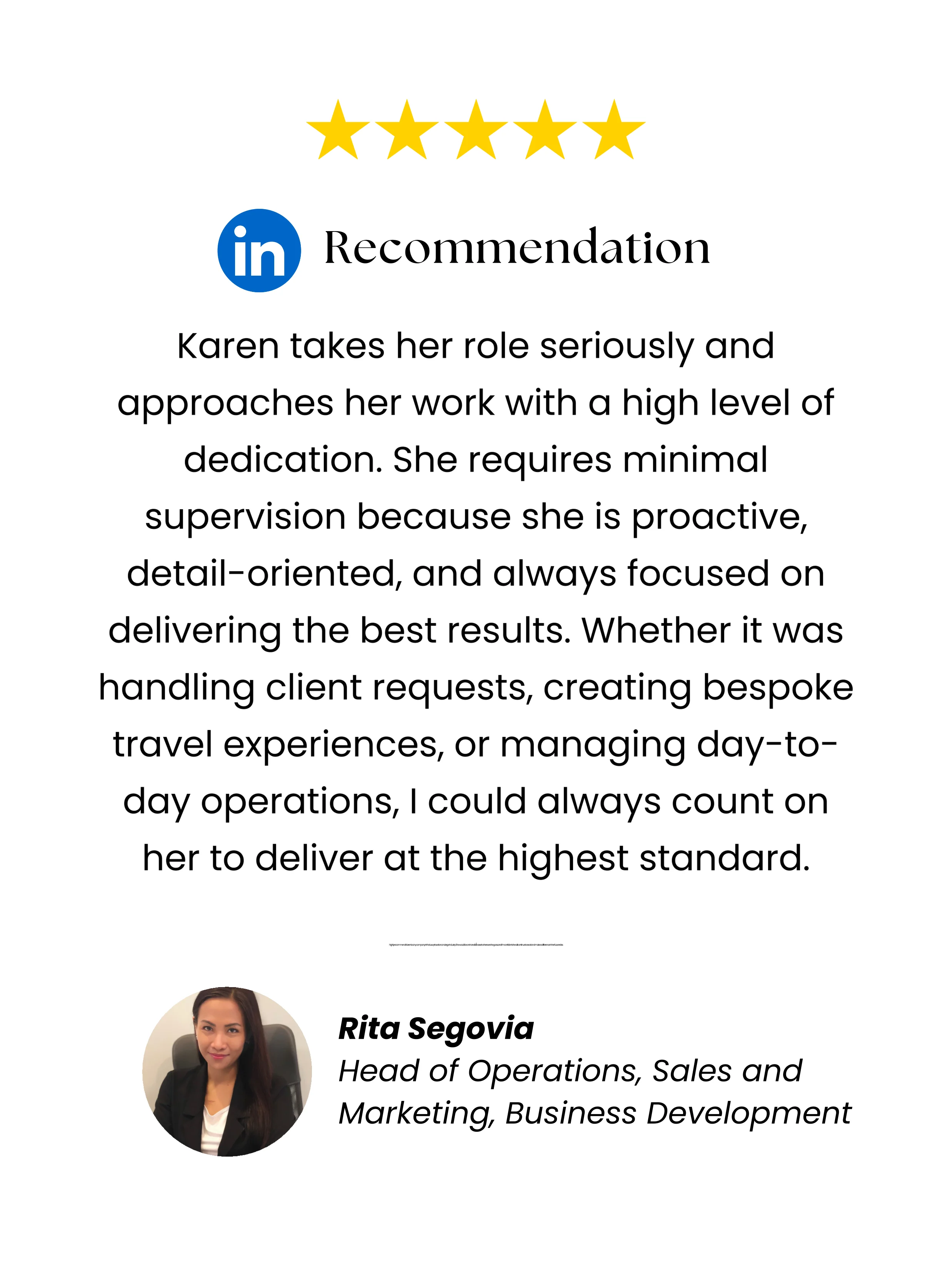 ✅ Recommendation from Rita Segovia, Head of Operations, Sales & Marketing, who directly managed Karen at Malbeven and Ways & Villas.