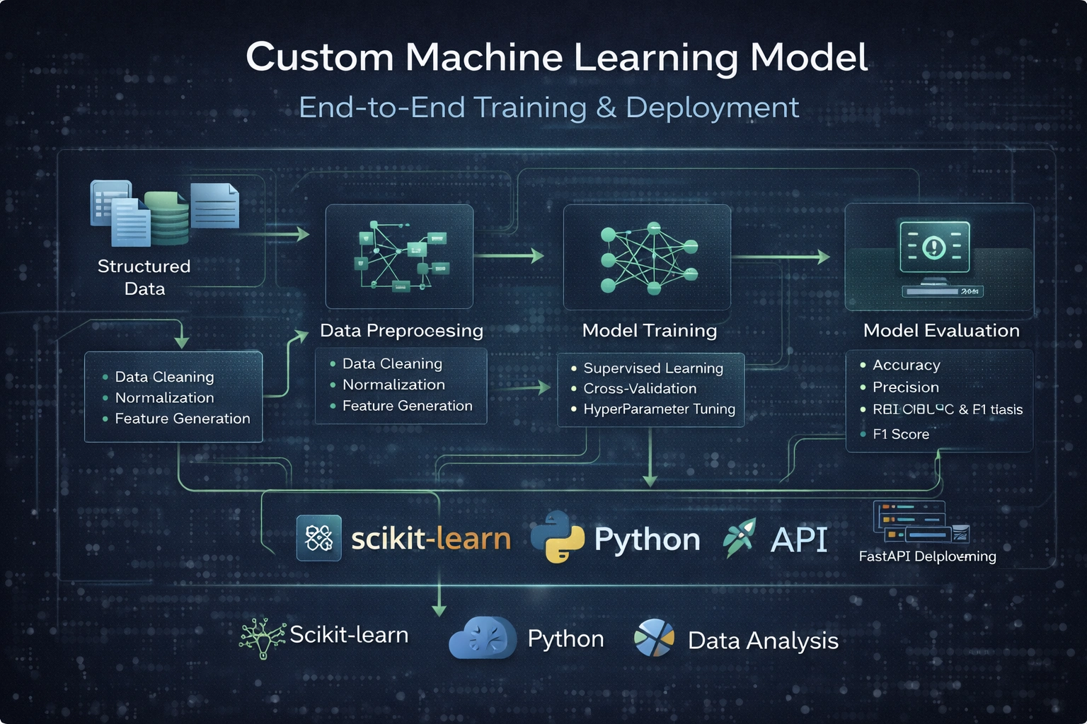 Designed and trained a custom machine learning model from raw dataset to production deployment. Built preprocessing pipelines, performed feature engineering, and evaluated multiple algorithms using cross-validation and performance metrics (F1, ROC-AUC). Optimized hyperparameters and deployed via FastAPI for API-based inference. Delivered a scalable ML solution with reproducible training workflow and model monitoring.