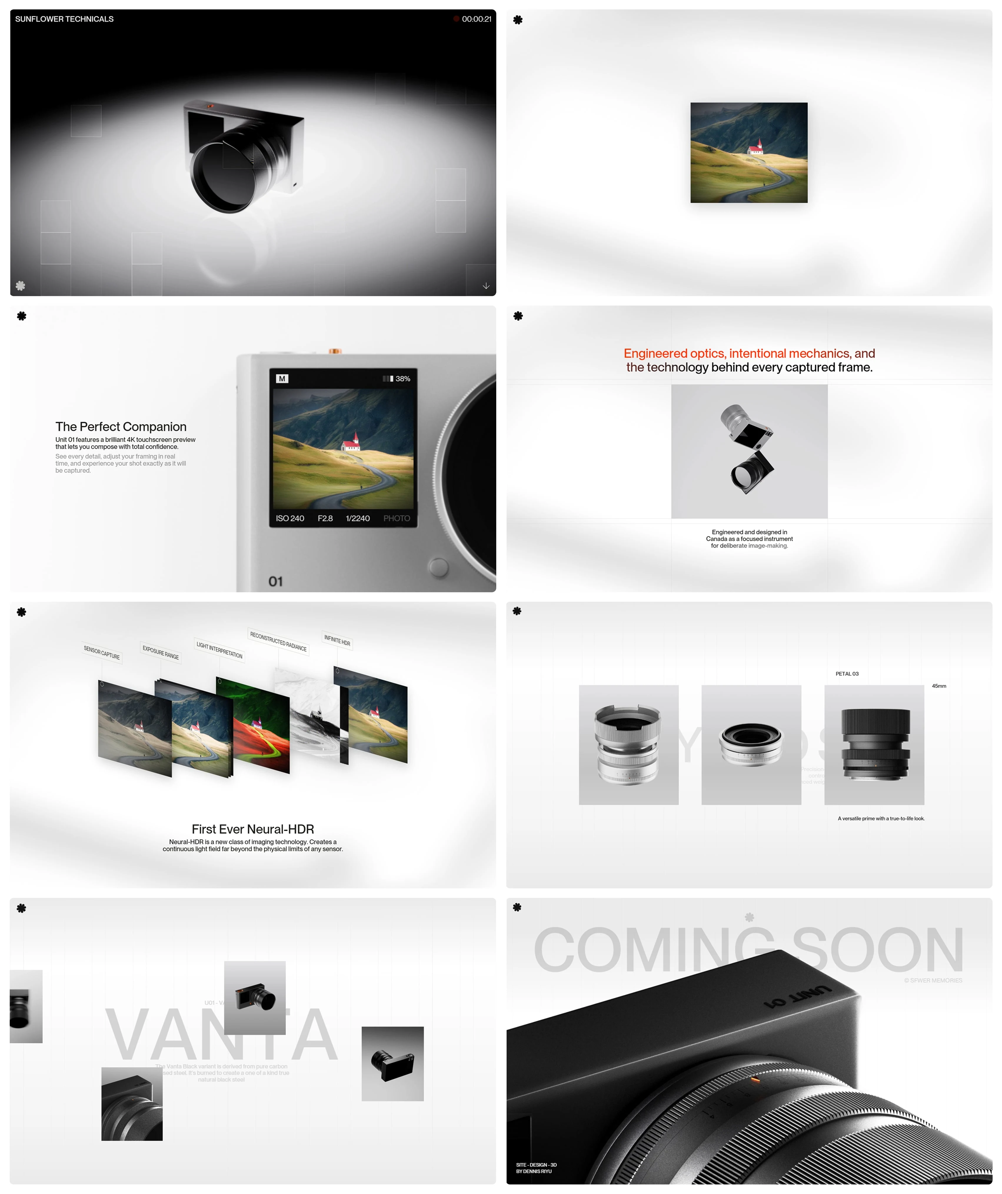 The final outcome is a digital experience that gives Unit 01 a clear and distinctive presence online. By combining website design, 3D visualization, animation, and Webflow implementation, I created a system that presents the camera, its technology, and its lens ecosystem in a way that feels cohesive, technical, and intentional.