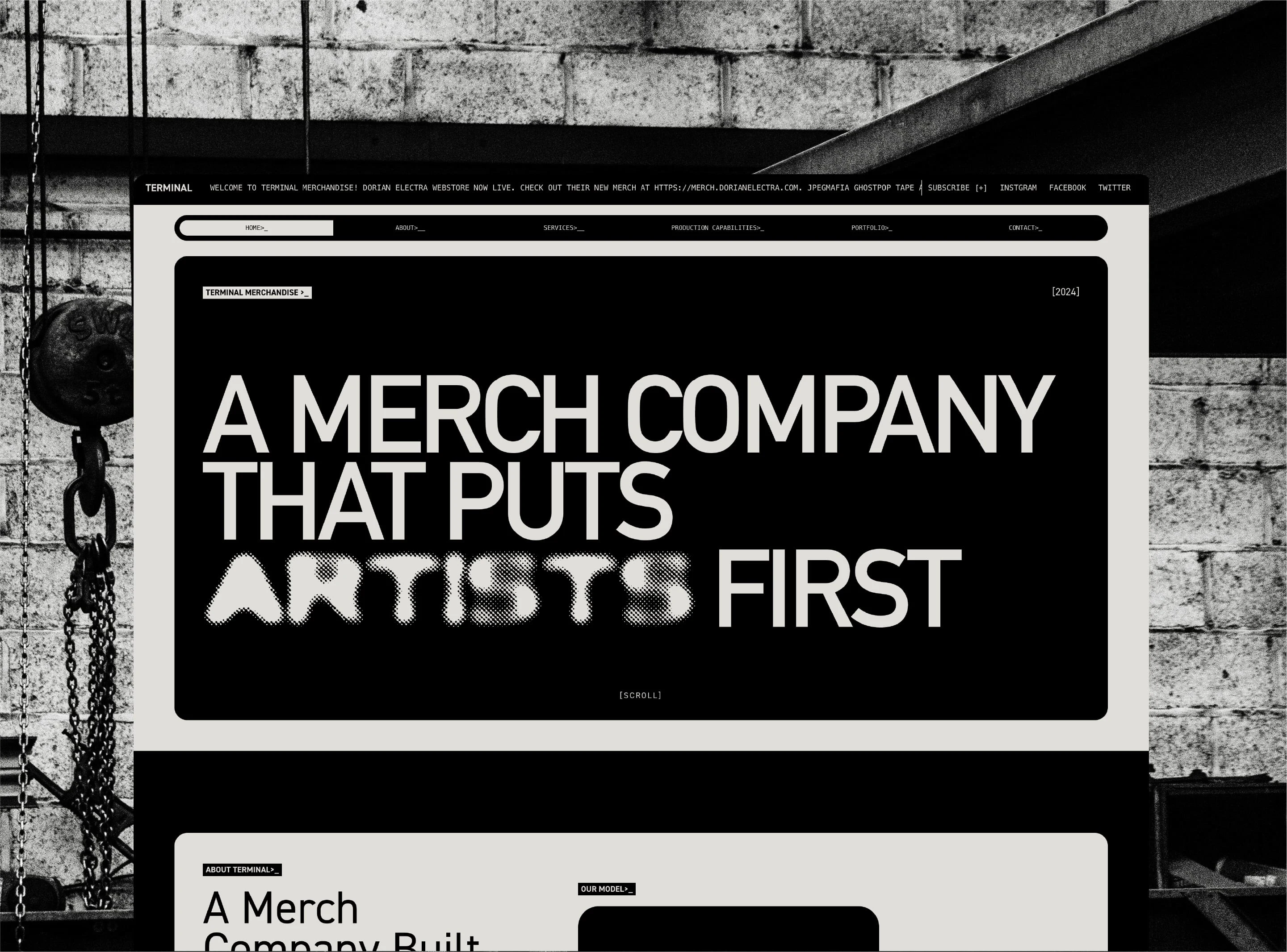 Webflow site for a merchandise design and production company, built with a scalable CMS for product showcases, dynamic project galleries, and bold visual storytelling.