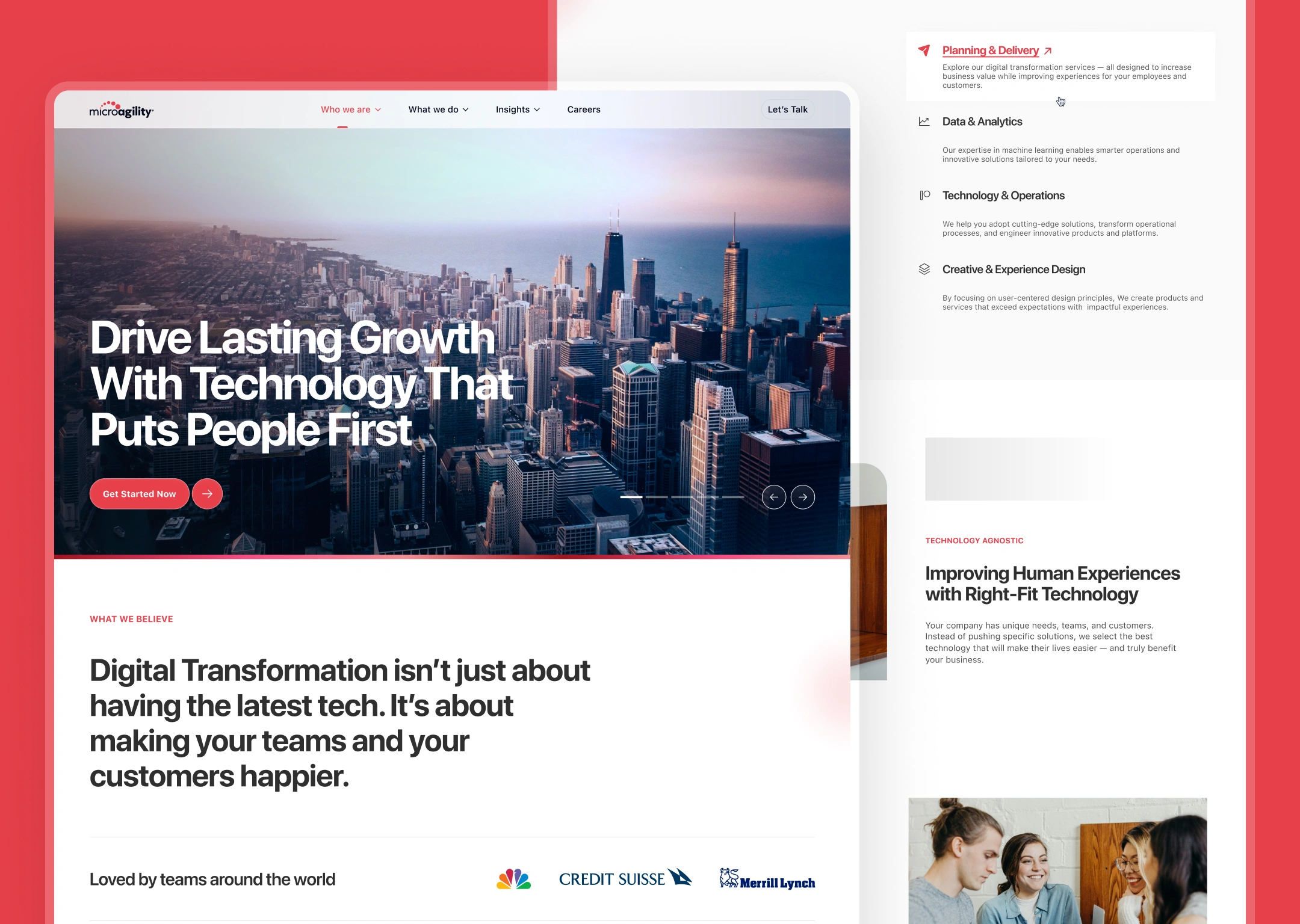 MicroAgility is a Princeton, NJ-headquartered technology solutions provider specializing in digital transformation with a people-first philosophy. They serve enterprise clients across planning & delivery, data & analytics, technology & operations, and creative & experience design using AI and automation to enhance rather than replace human interactions.