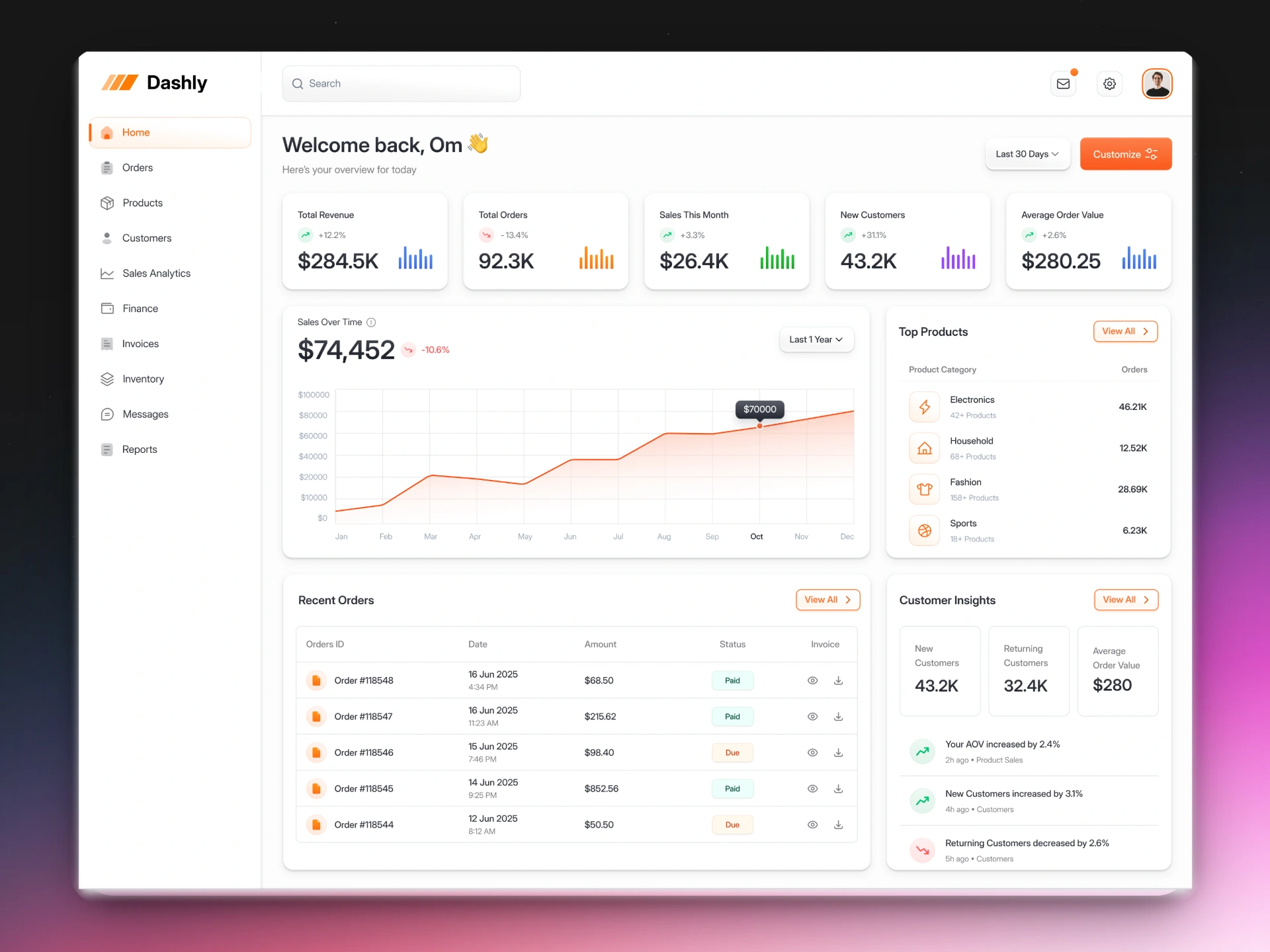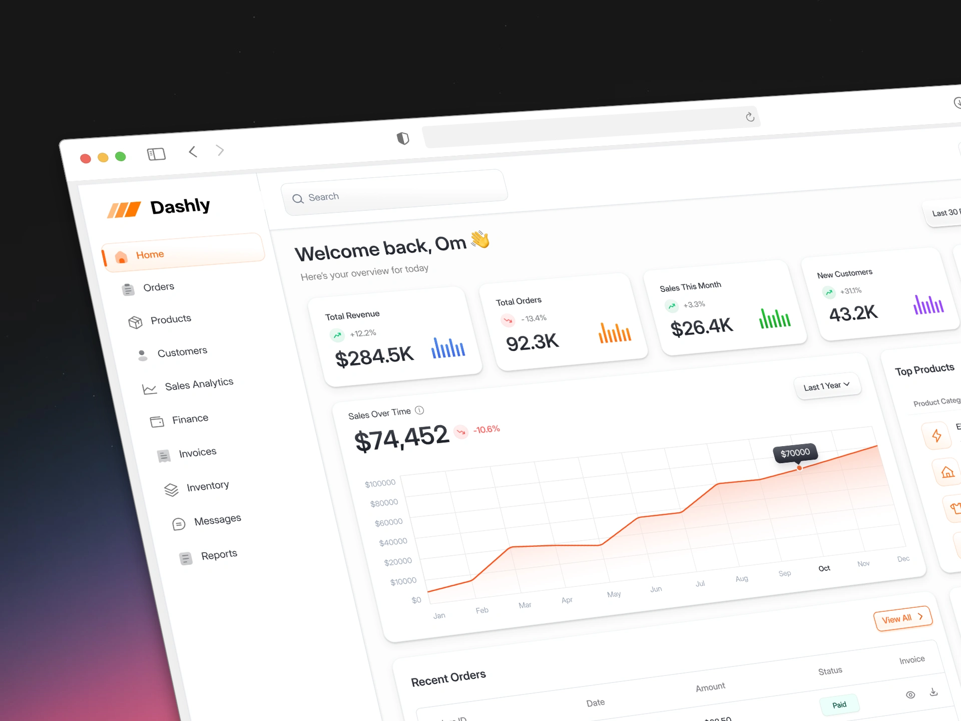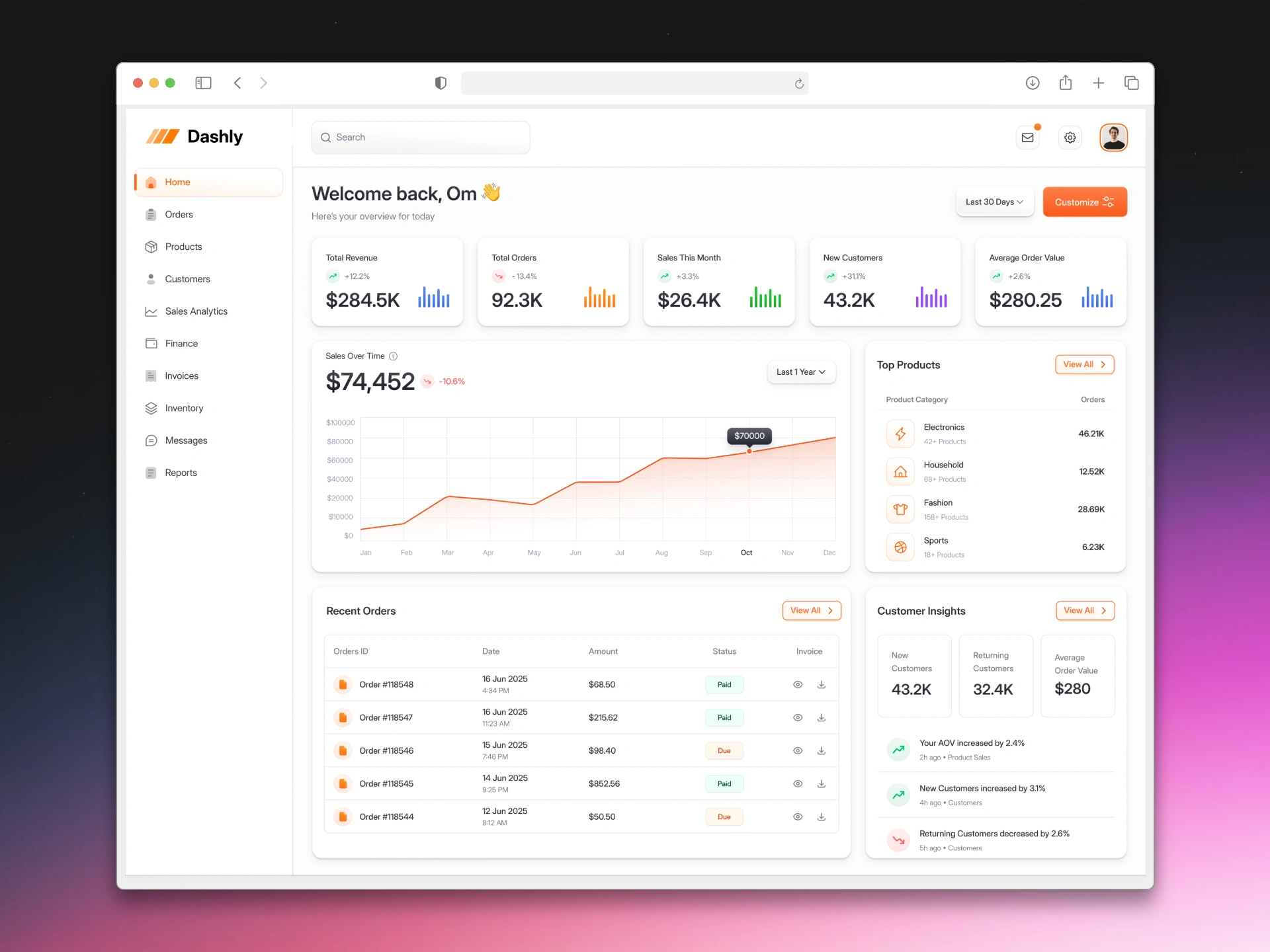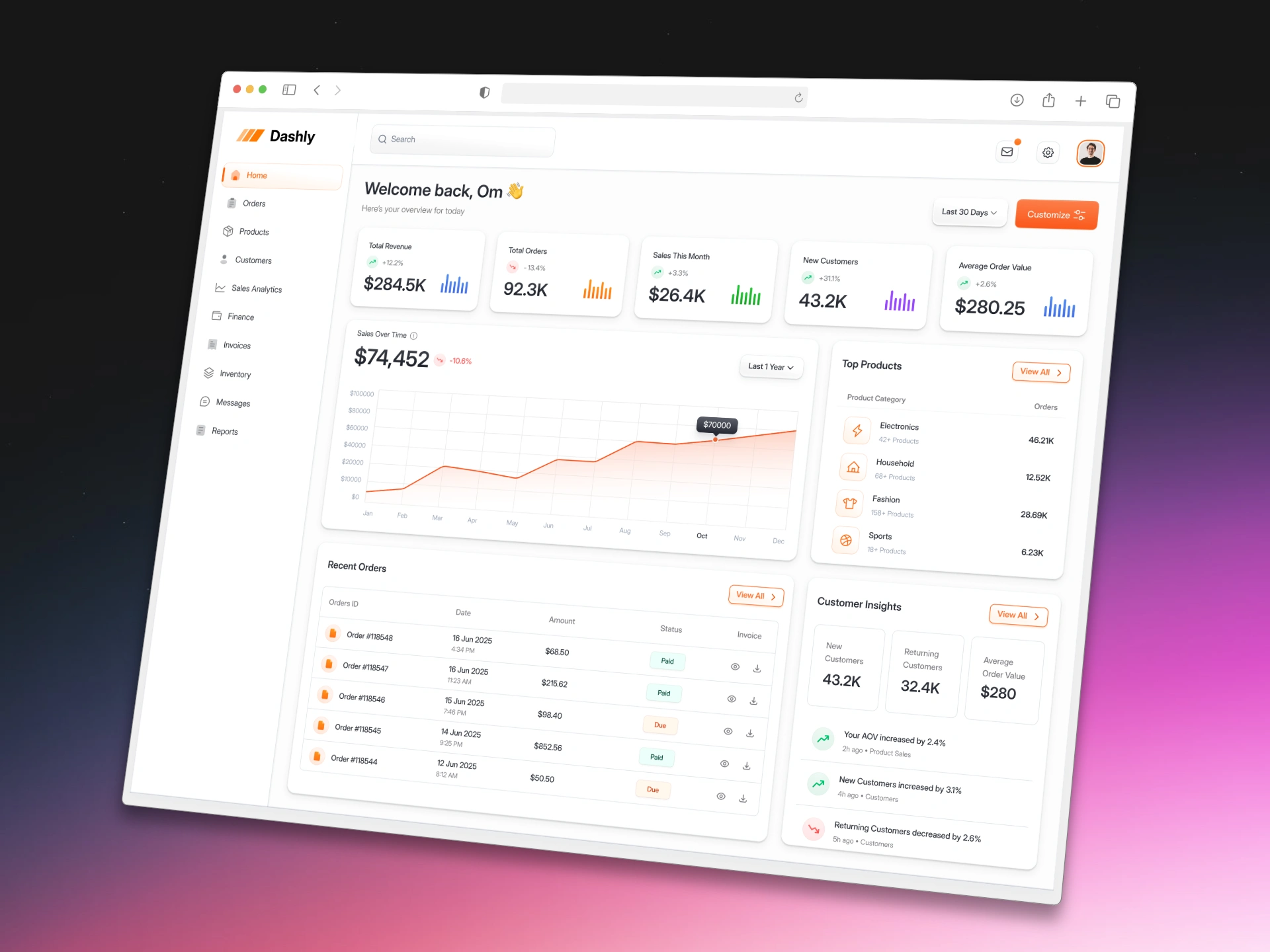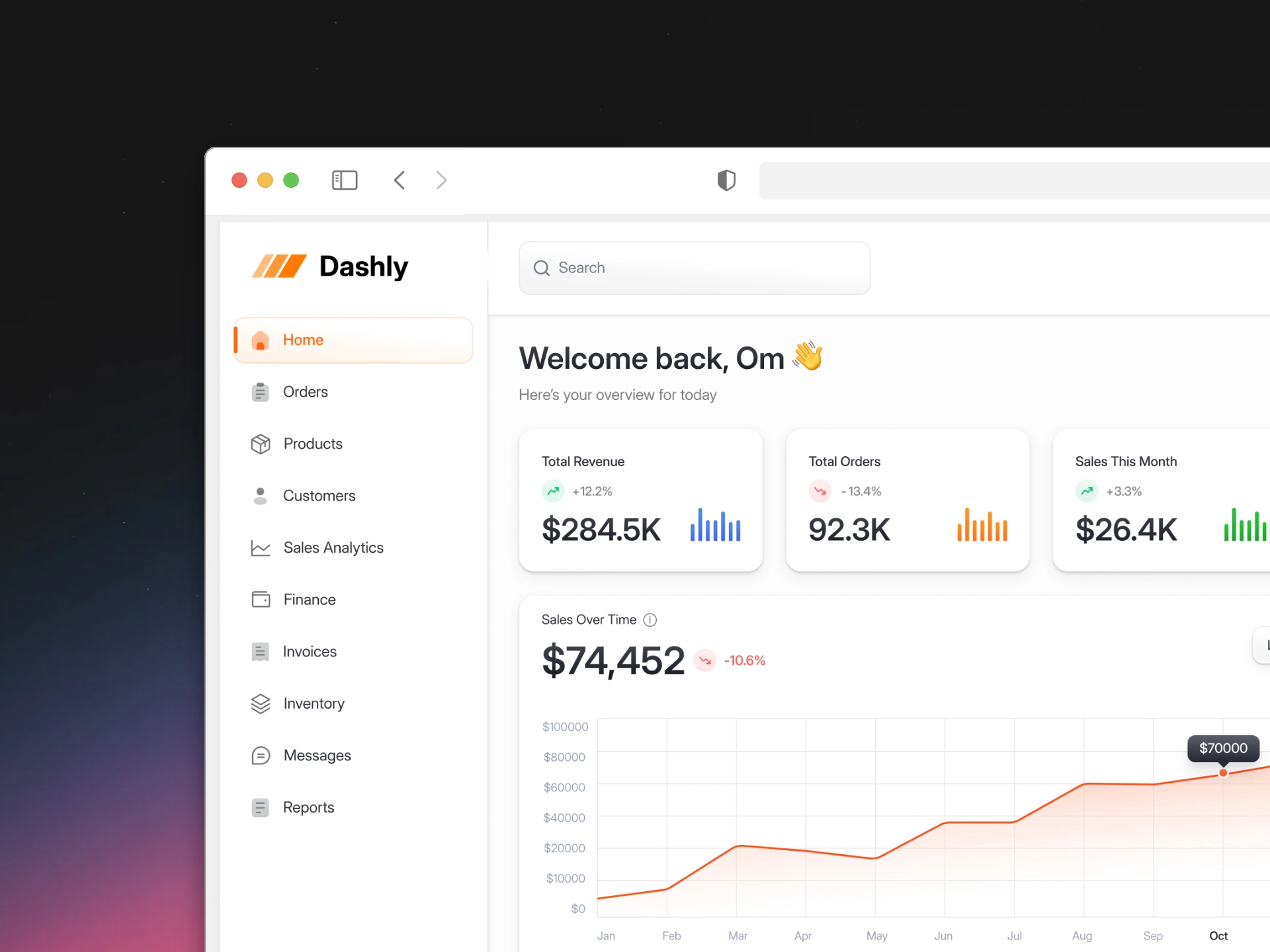 Dashly is a powerful E-Commerce SaaS dashboard designed for seamless sales tracking, finance monitoring, and customer insights - all in one place.