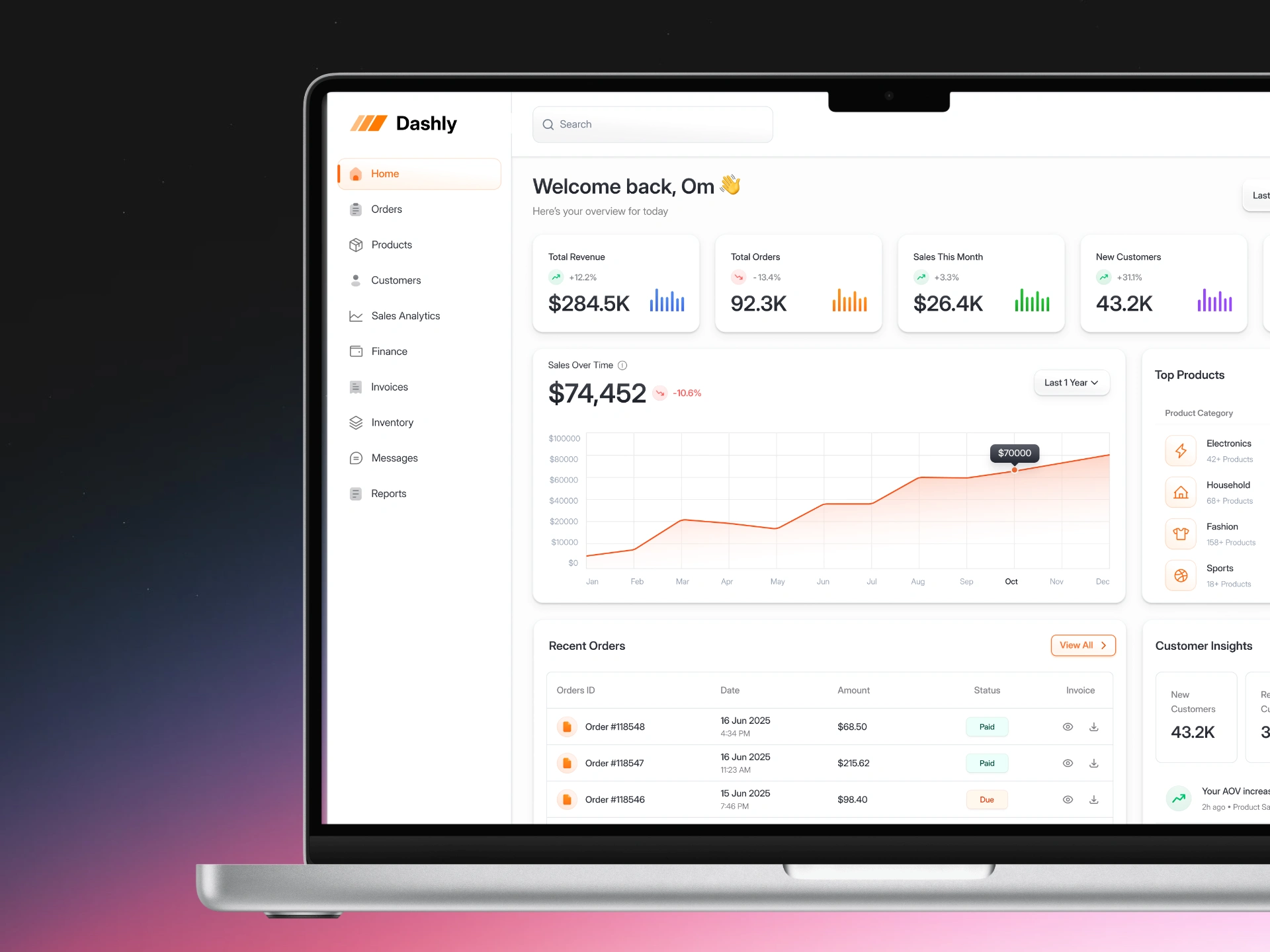 Designing Dashly was about creating a smart, all-in-one command center for eCommerce businesses. I wanted to make tracking sales, monitoring finances, and analyzing customer behavior feel effortless — all from a single, seamless dashboard.