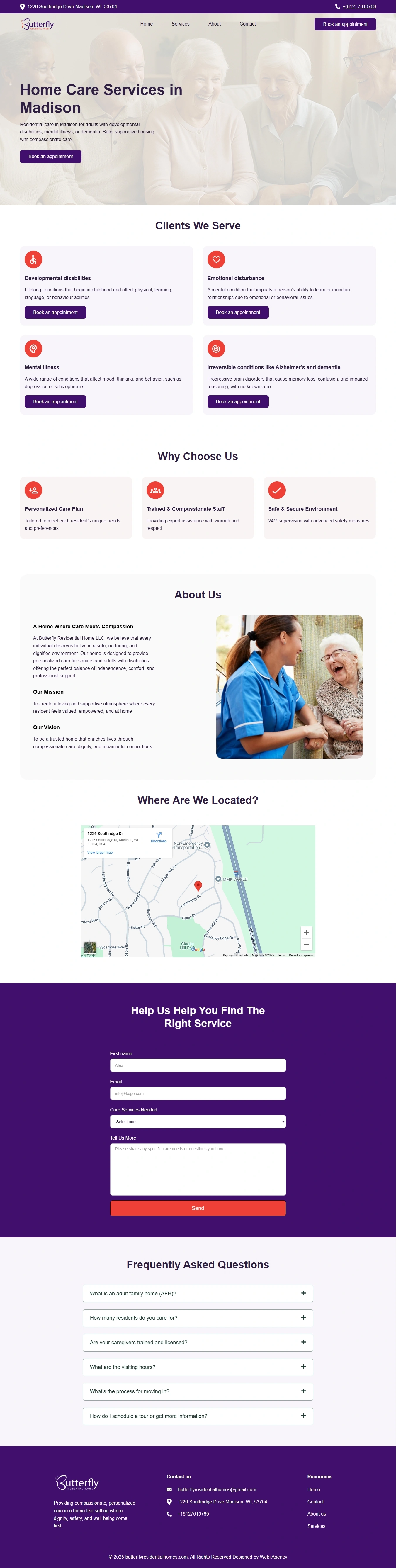 Solution: We designed a welcoming and accessible senior home care website in Figma, highlighting their mission, services, small licensed home model, and compassionate care approach. The design was then brought to life in Webflow, with a focus on responsive performance, fast load times, and local SEO. The result was a user-friendly and trustworthy digital presence that helps drive inquiries and builds community credibility.