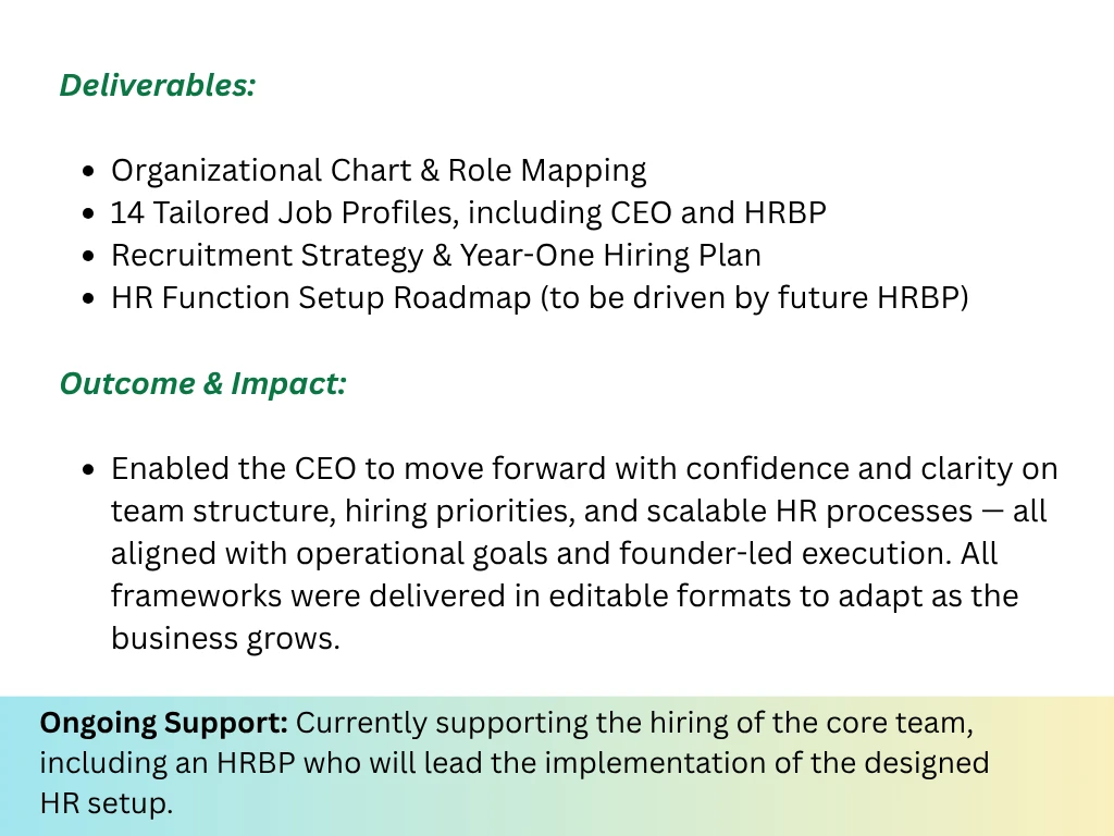 Partnered with the founder at inception to design foundational HR setup: org chart, 14 job profiles, hiring plan, and HR roadmap aligned with year-one goals.