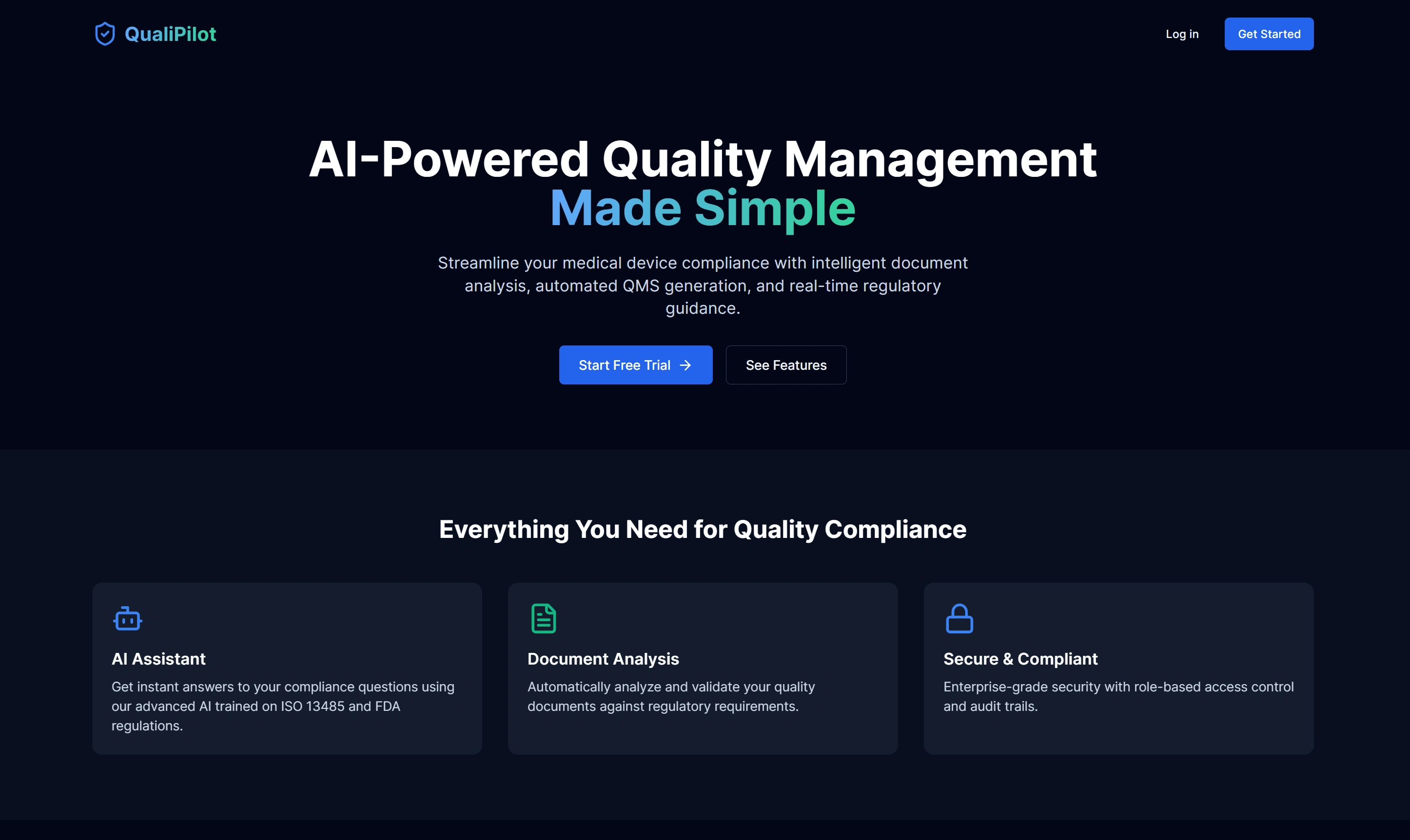QualiPilot is an AI‑powered, multi‑tenant SaaS platform that streamlines end‑to‑end medical device commercialization by combining secure, cloud‑hosted workspaces with Retrieval‑Augmented Generation (RAG) chat to deliver context‑aware guidance.