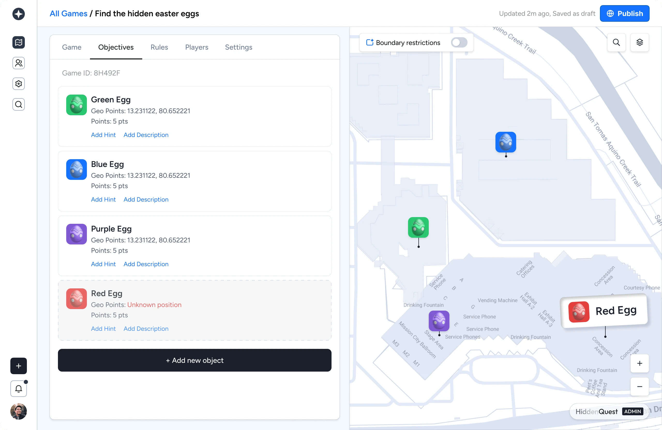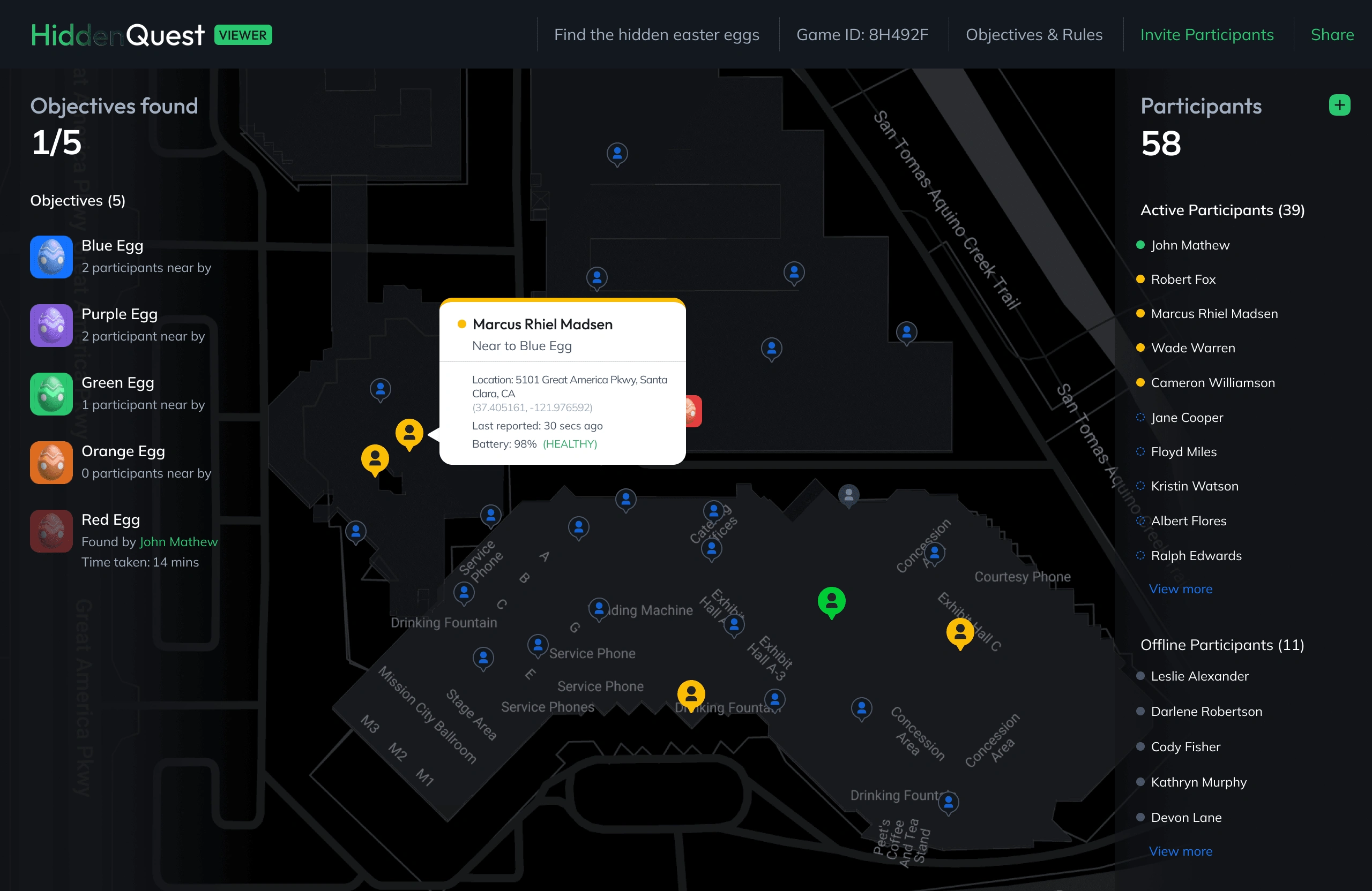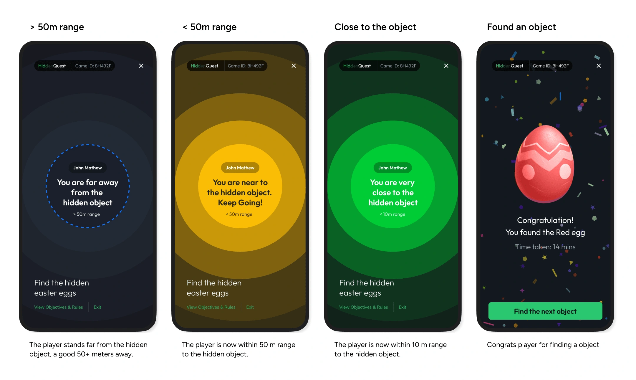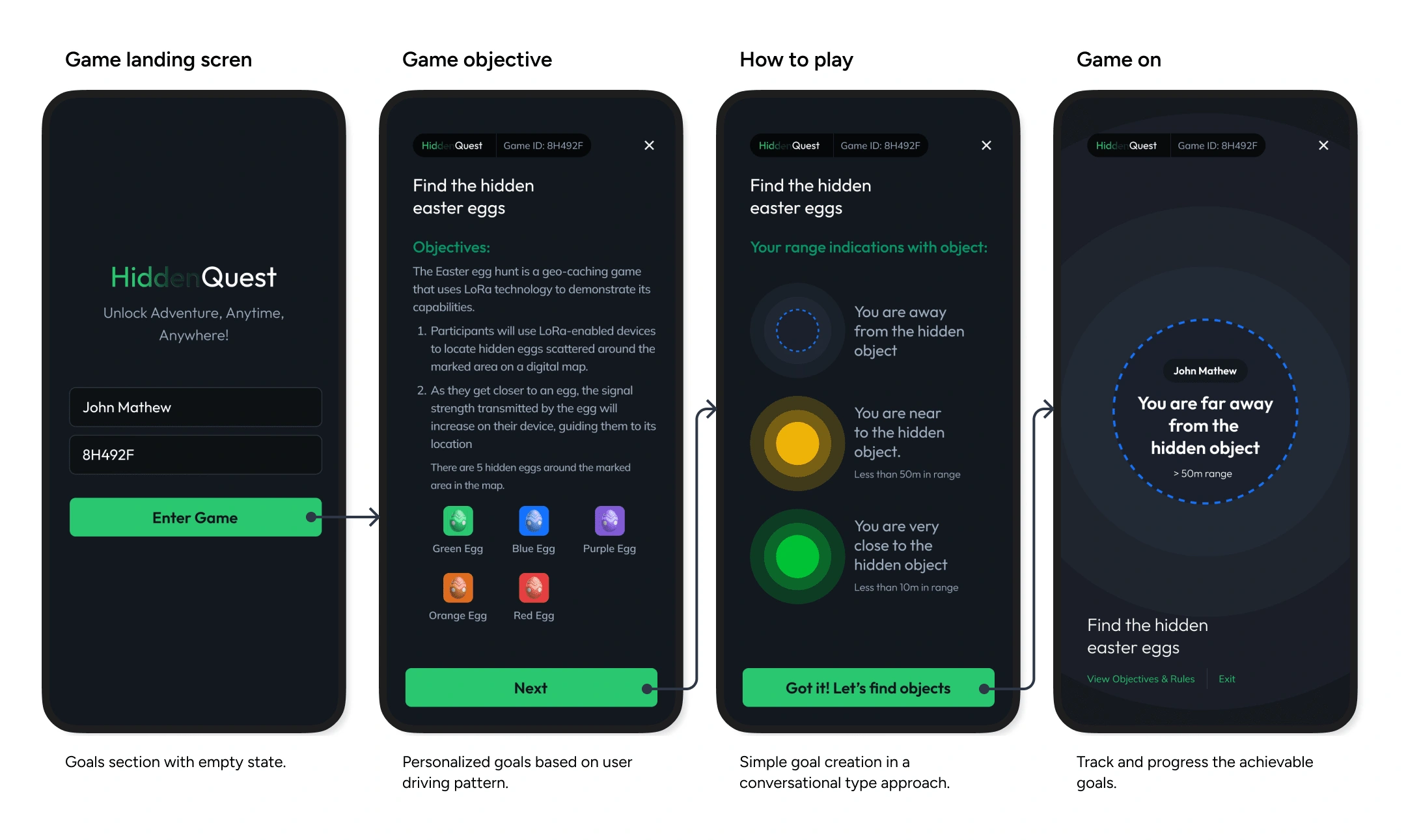 HiddenQuest is a geo-caching game that uses LoRa technology to demonstrate its capabilities. Participants will use LoRa-enabled devices to locate hidden eggs scattered around the marked area on a digital map. As they get closer to the hidden object, the signal strength transmitted by the object will increase on their device, guiding them to its location.