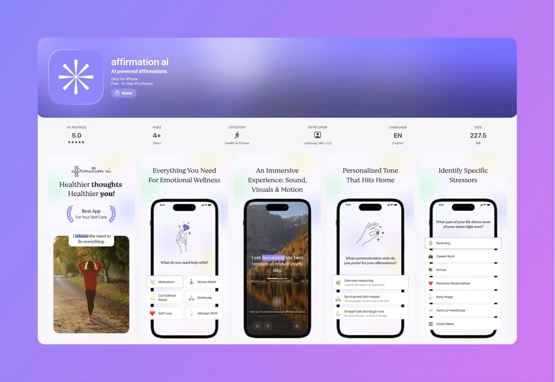 Affirmation AI is a beautifully designed emotional wellness app that uses AI to generate personalized affirmations based on the user’s moods, stress level, and personal goals. The app blends sound, visuals, breathing motion, and intelligent text generation to deliver a calming, immersive experience.