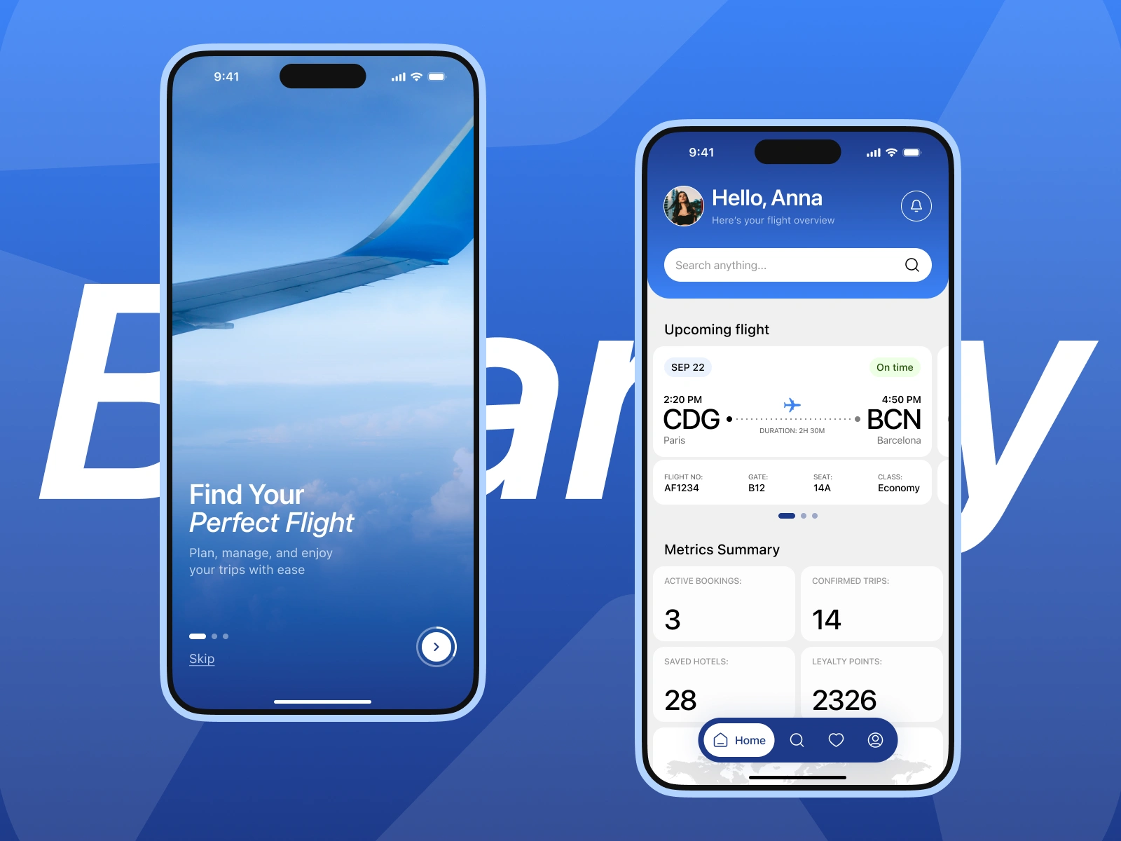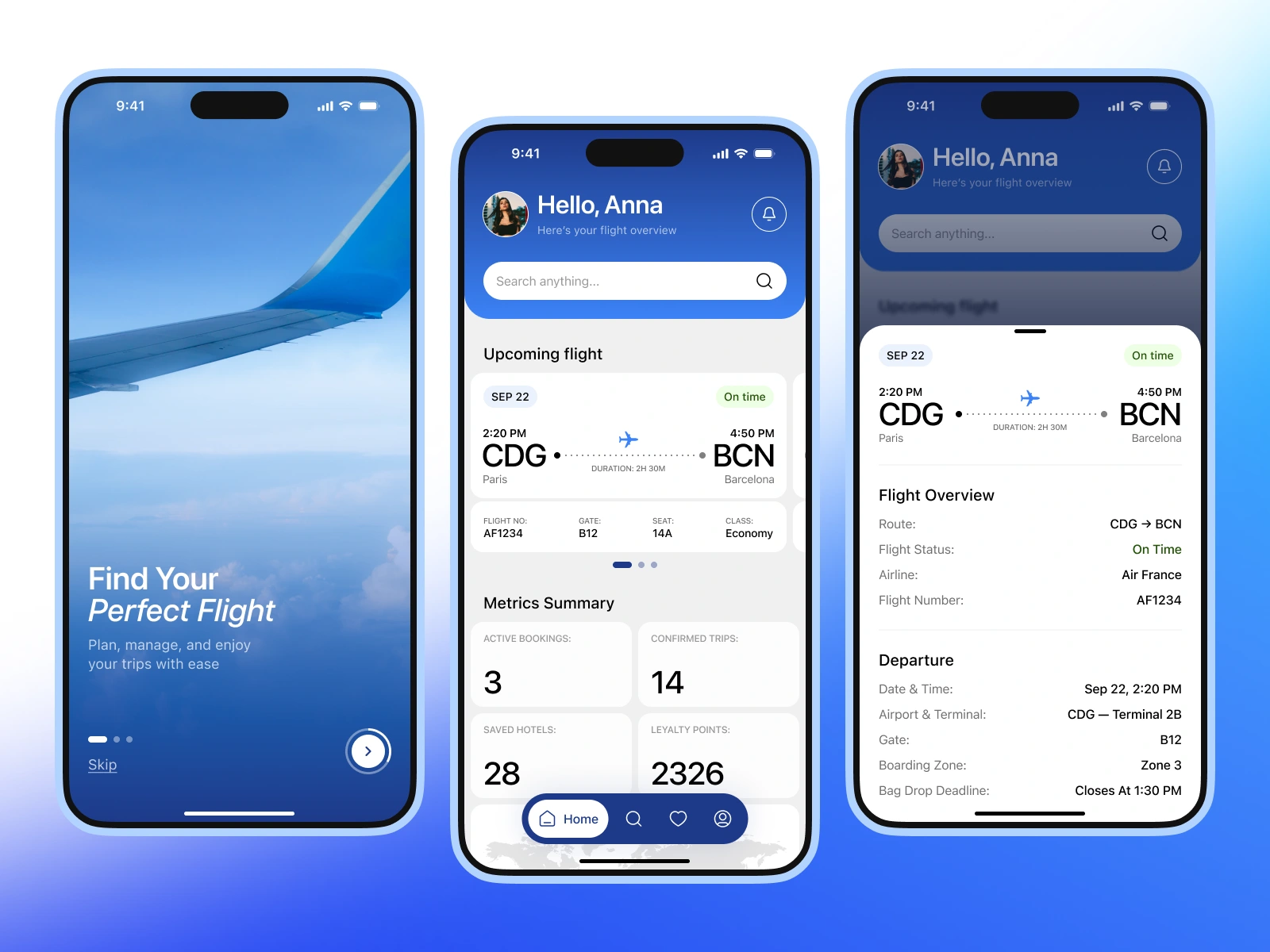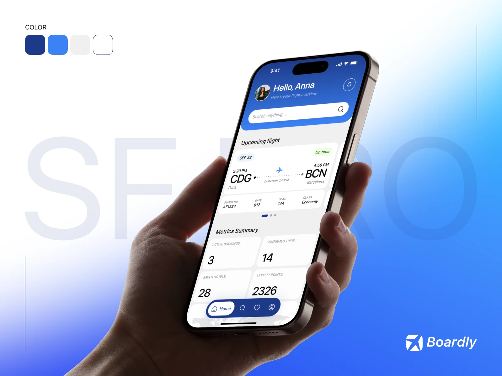 Boardly is a modern travel app designed in Figma to simplify flight booking and trip management. The UI/UX focuses on clarity, speed, and ease of use, with features like upcoming flight details, metrics summary, loyalty points, and integrated hotel tracking. A blue-and-white design system ensures a clean, trustworthy, and user-friendly experience for travelers.