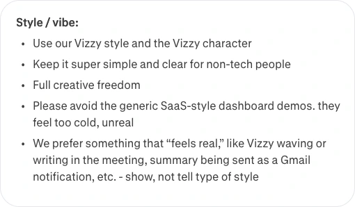 I was approached by the team from Sintra to help them with a simple but significant problem - Help new/regular users understand how to use the Vizzy AI notetaker and show its capabilities in a seamless, no-fuss way with motion.
