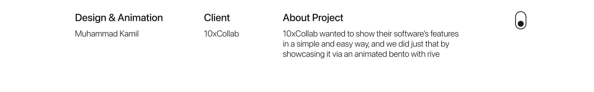10xCollab wanted to show their software’s features in a simple and easy way, and we did just that by showcasing it via an animated bento with rive