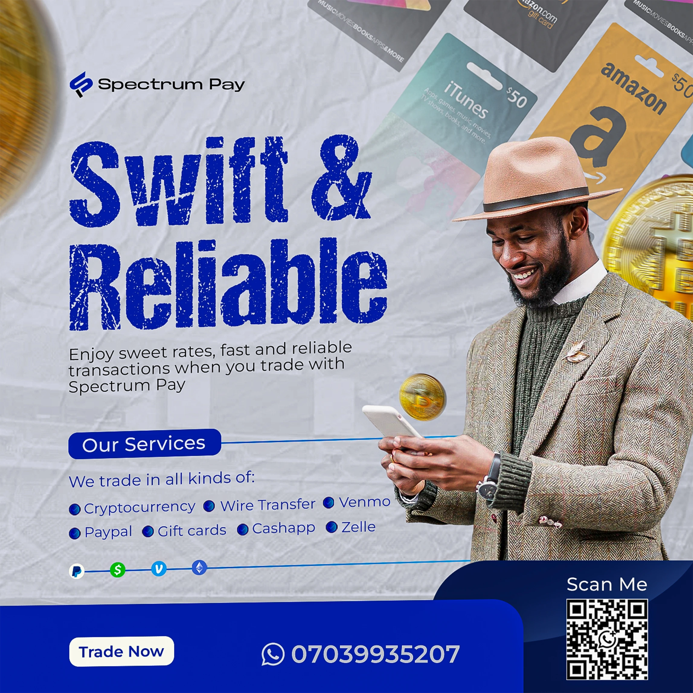 I worked with Spectrum Pay, a crypto and gift card exchange brand, to create their logo and a set of social media visuals. The goal was to give the brand a sharp, trustworthy look that stands out in the financial space. This project involved designing a custom monogram logo and creating promo flyers for Instagram and WhatsApp.