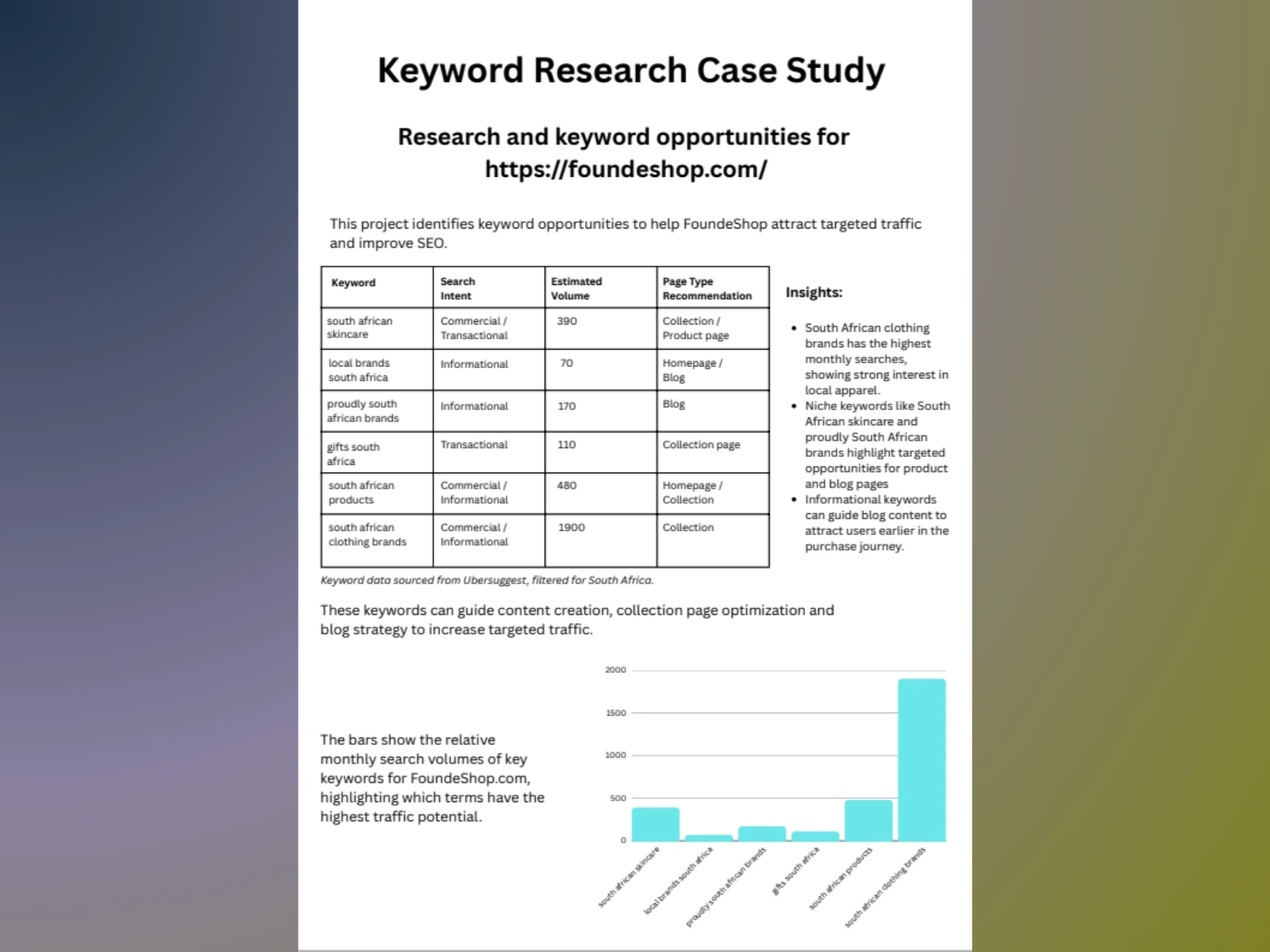 Identified high-volume search opportunities for a local marketplace. Mapped search intent to collection and blog content strategies.