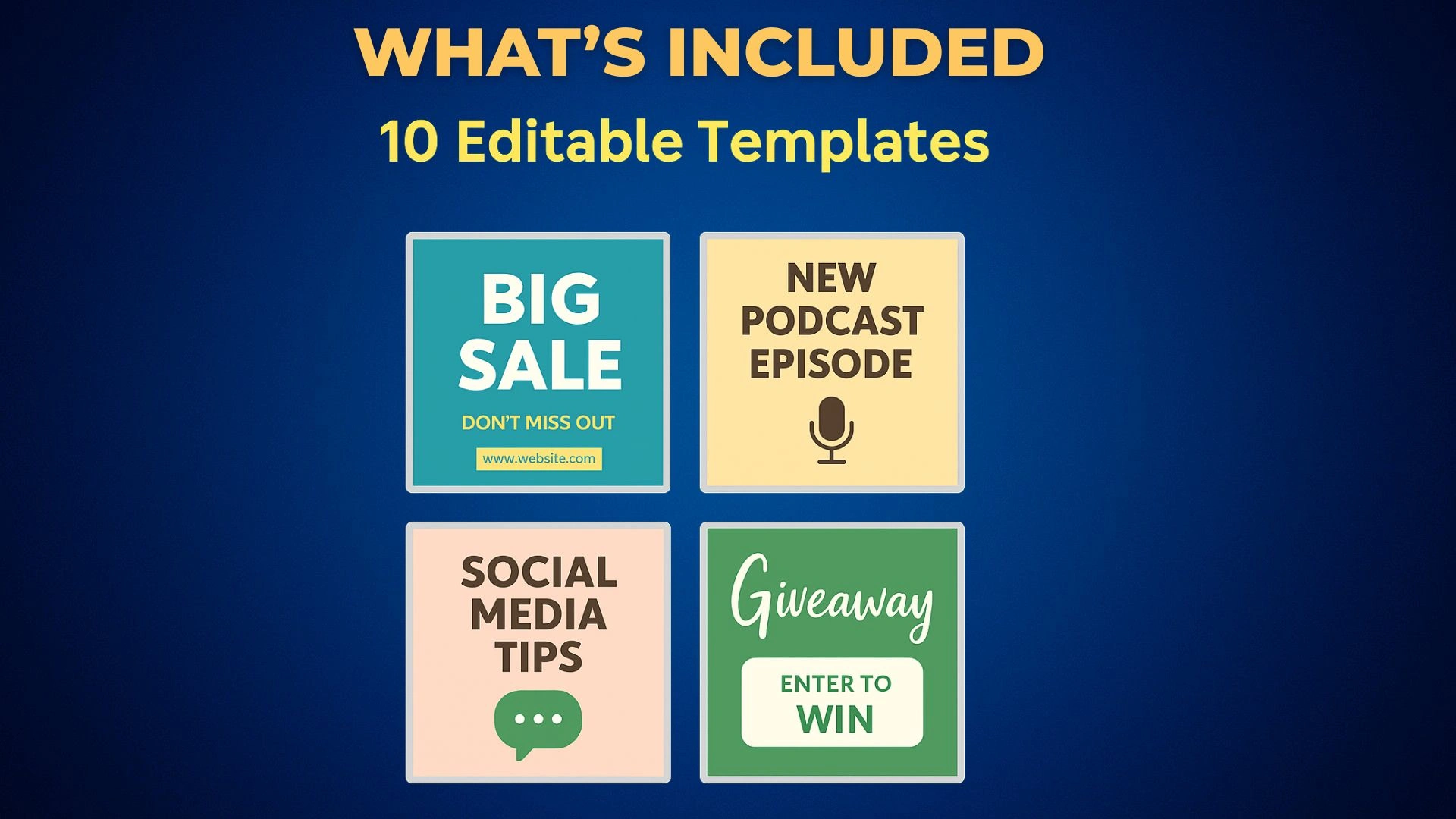 Includes 10 custom, branded social media graphics delivered as Canva templates + PNGs, sized for your platform of choice.