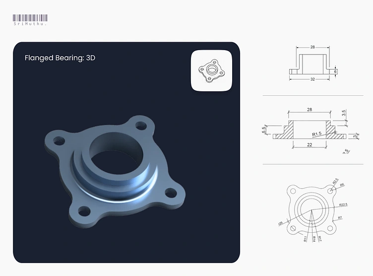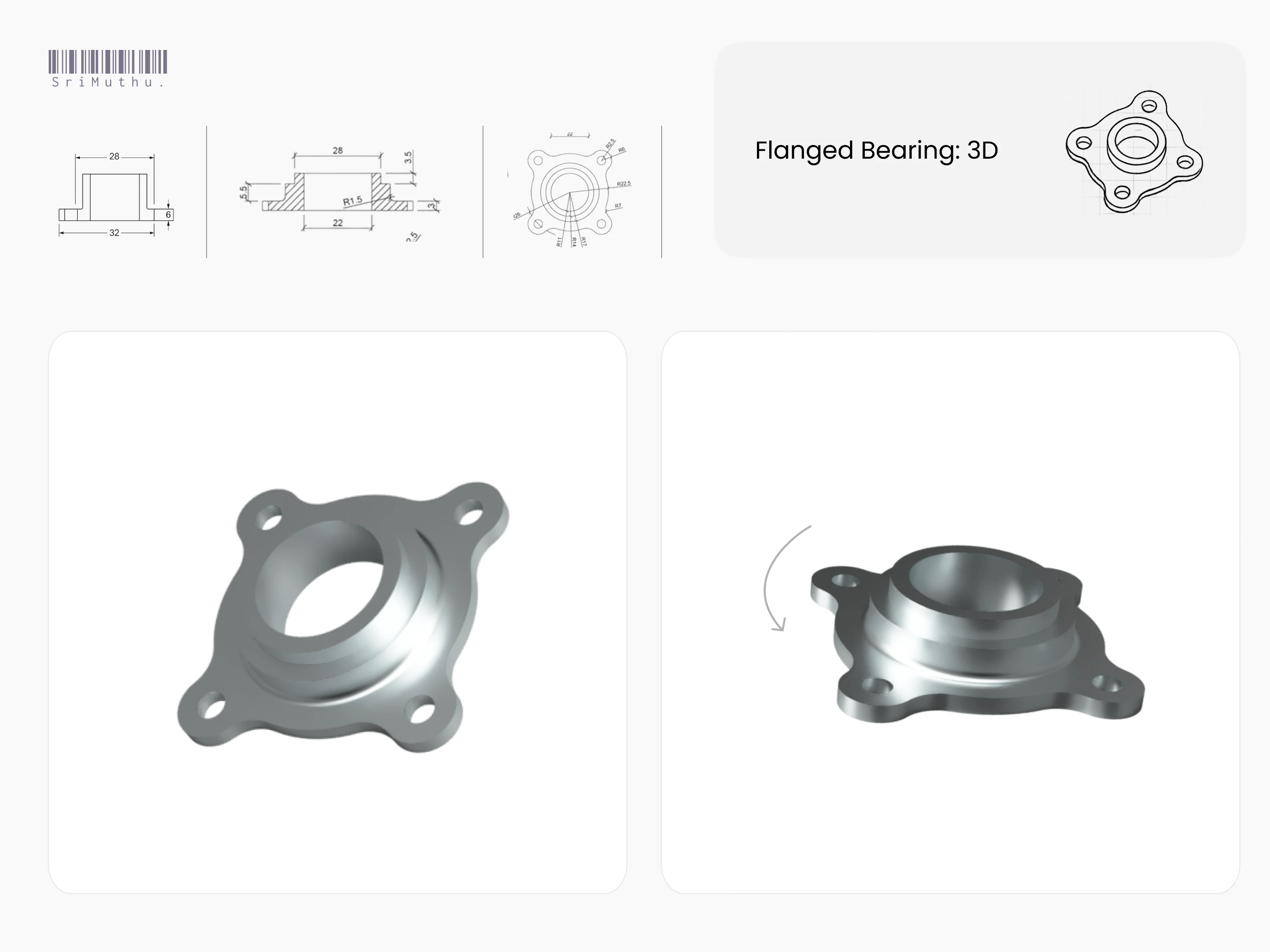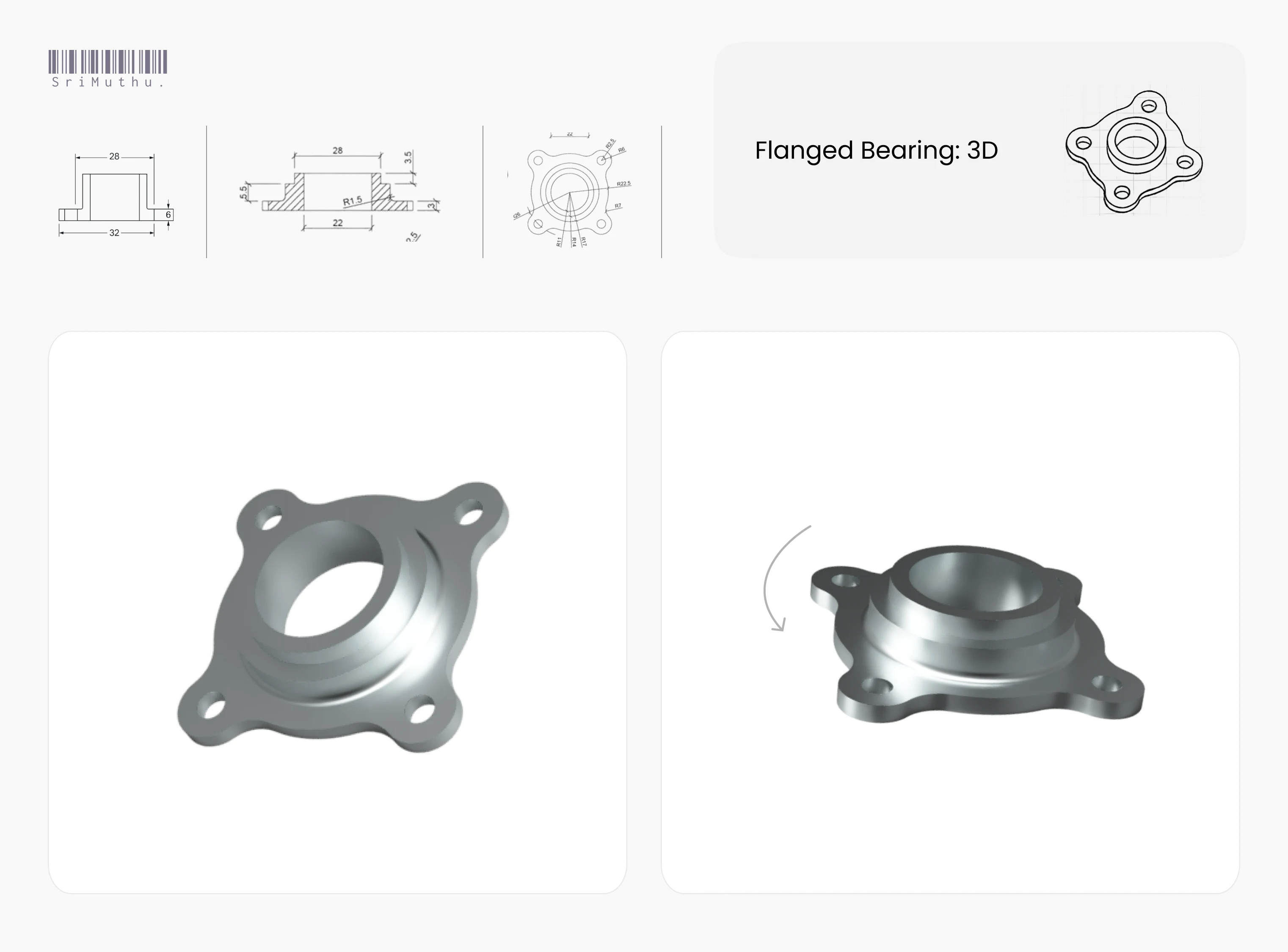 3D model and technical drawing of a flanged bearing—precise, functional, and engineered for accuracy. Ideal for mechanical or product design showcases.