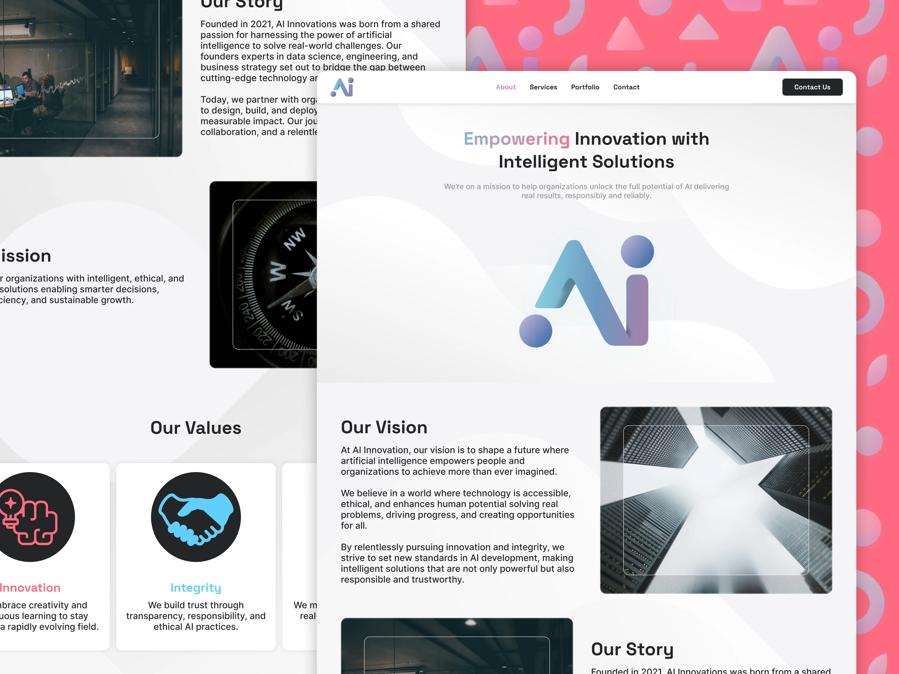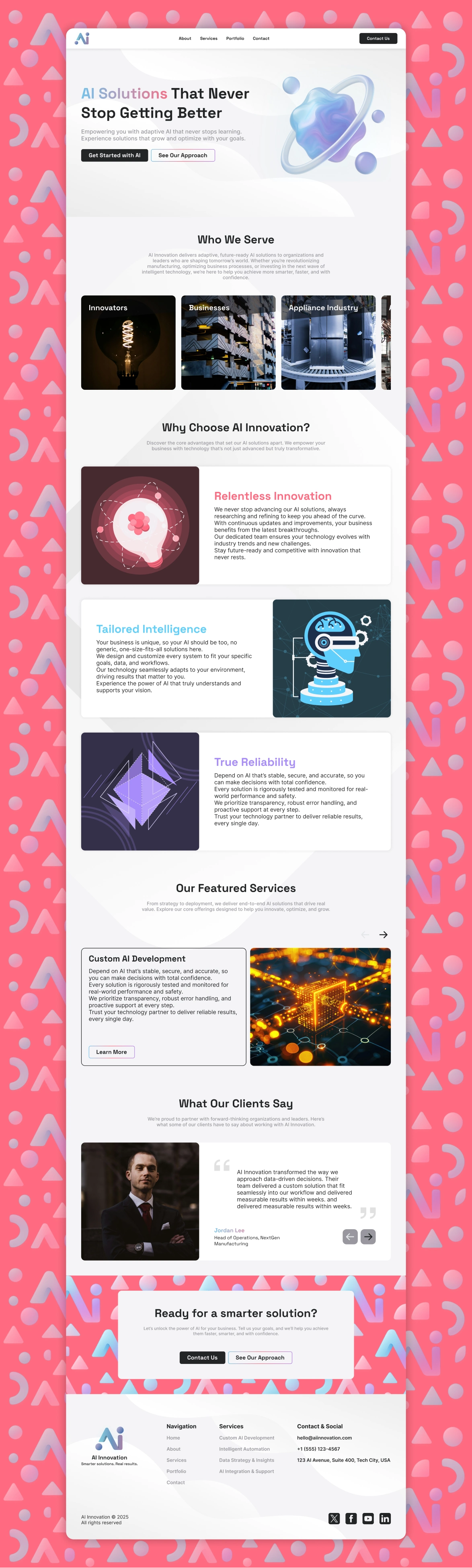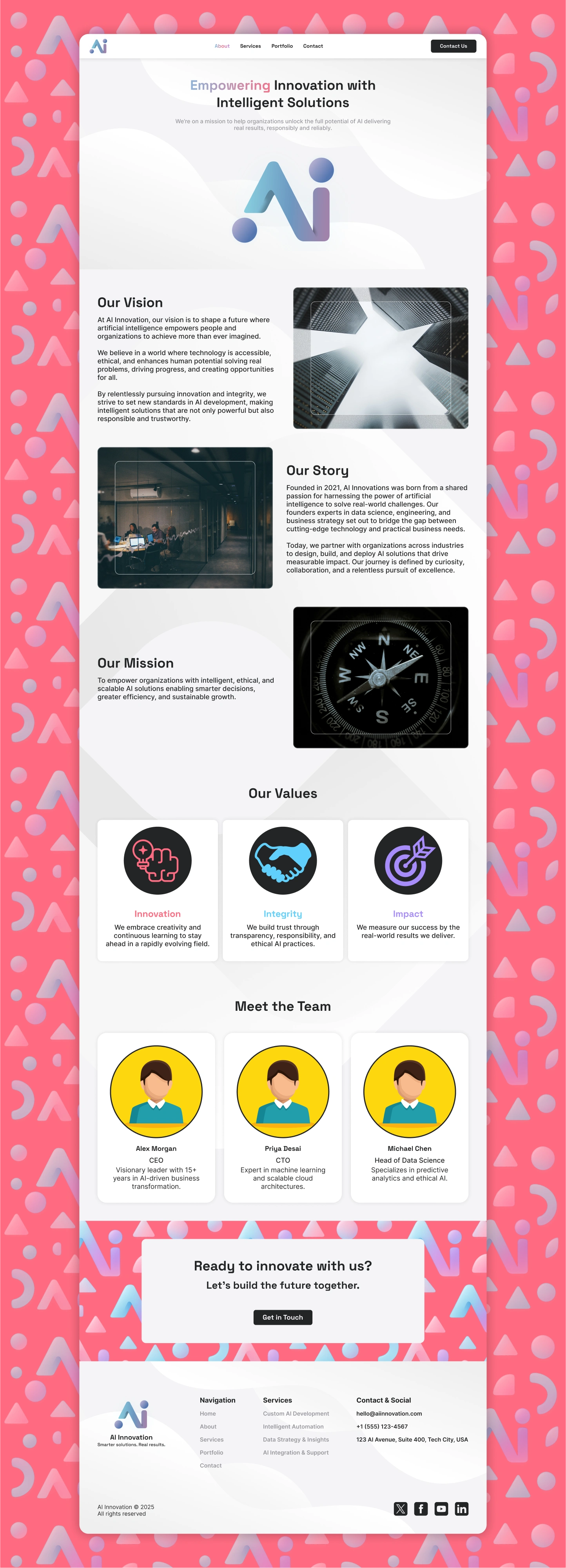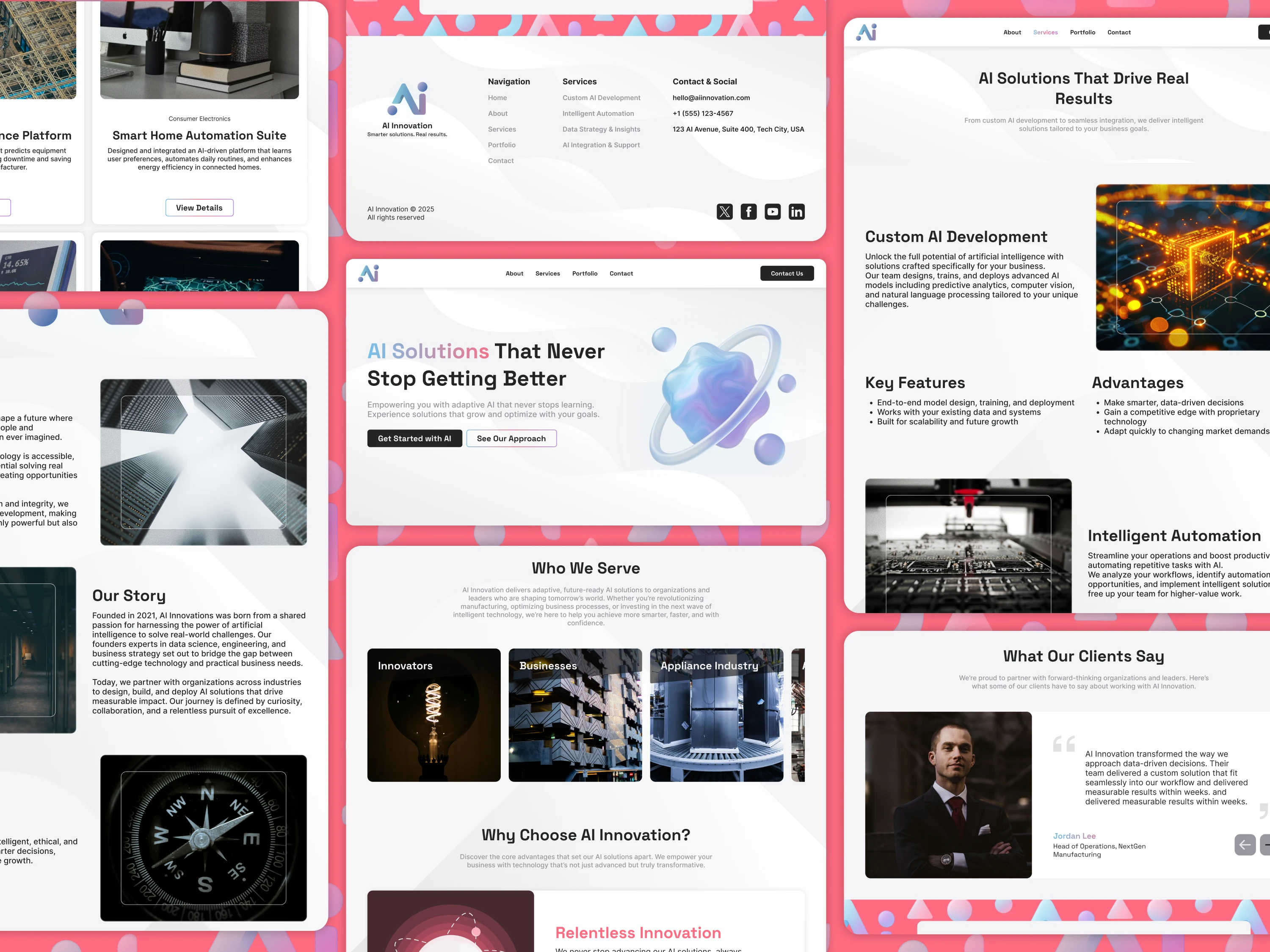 I redesigned the AI Innovation website and logo to create a memorable, tech-forward brand identity. The new site features a sleek, modern design with intuitive navigation and clear calls-to-action for seamless user journeys. The refreshed logo captures the brand’s innovative spirit with a bold blue-purple gradient and geometric precision. I focused on visual impact and accessibility, reorganizing content to highlight AI Innovation’s expertise. The result is a cohesive, user-friendly digital presence that sets the brand apart.