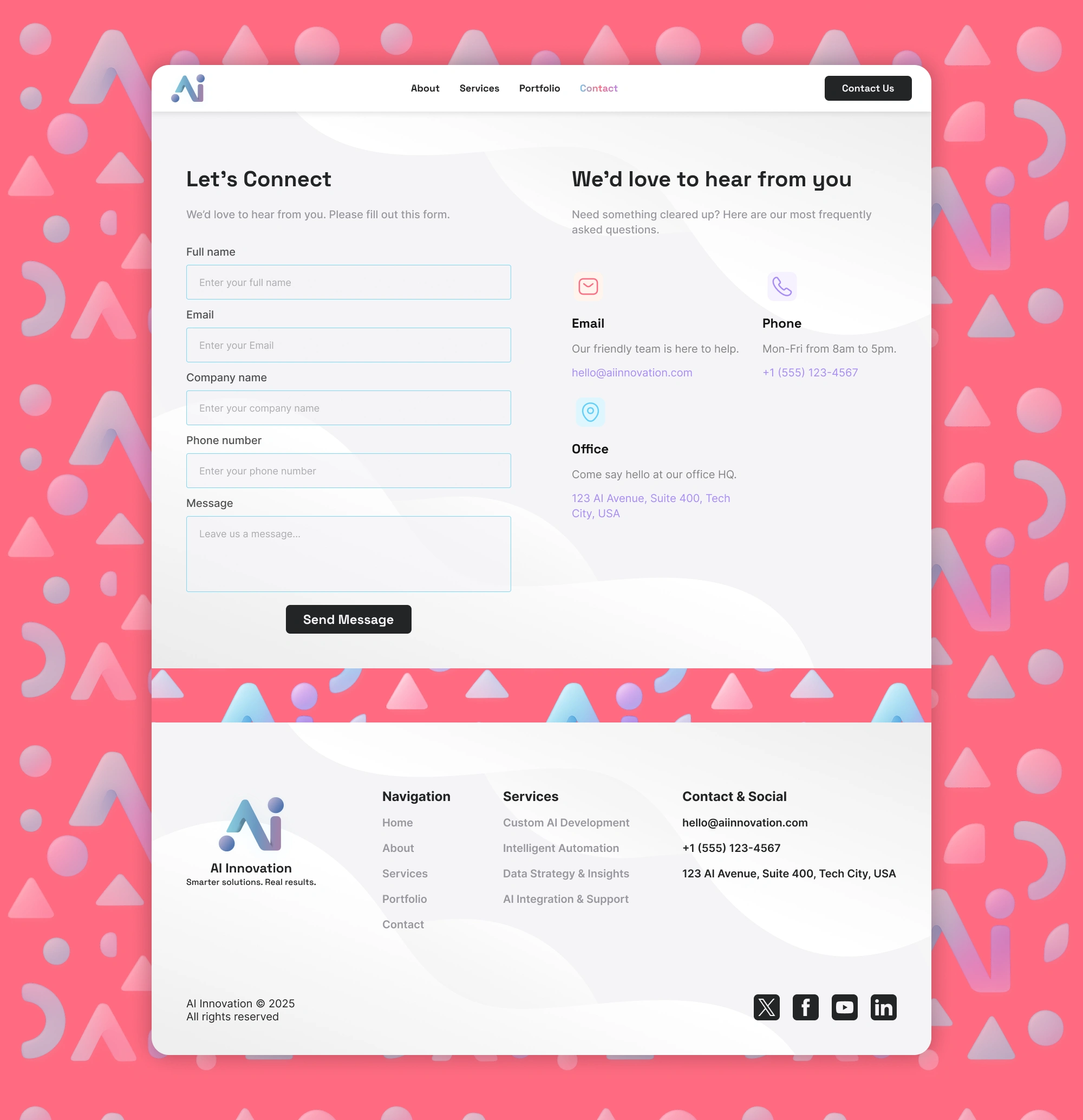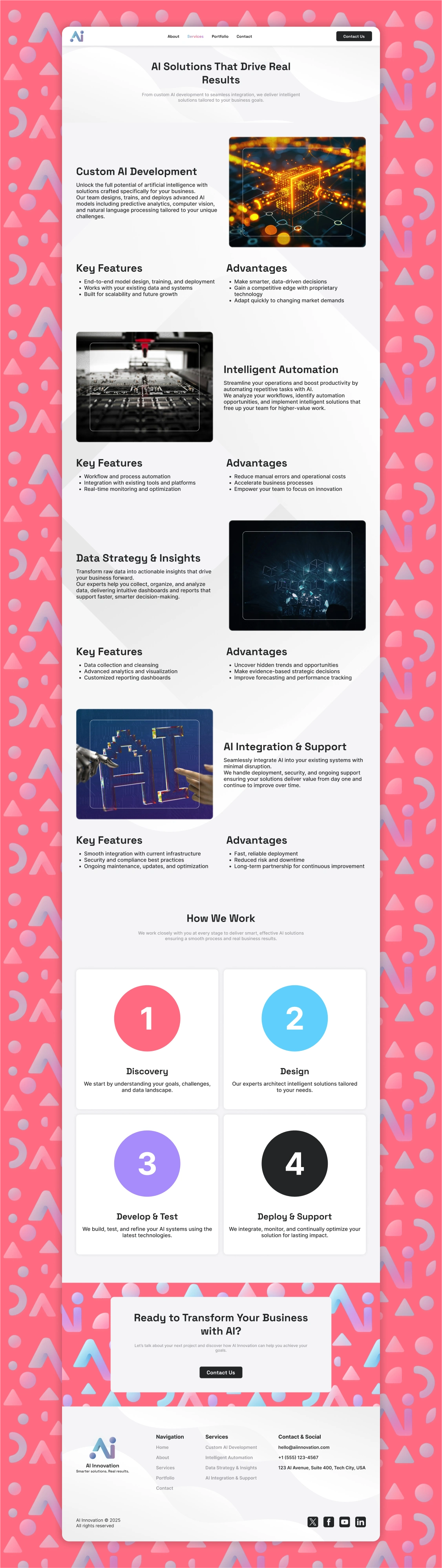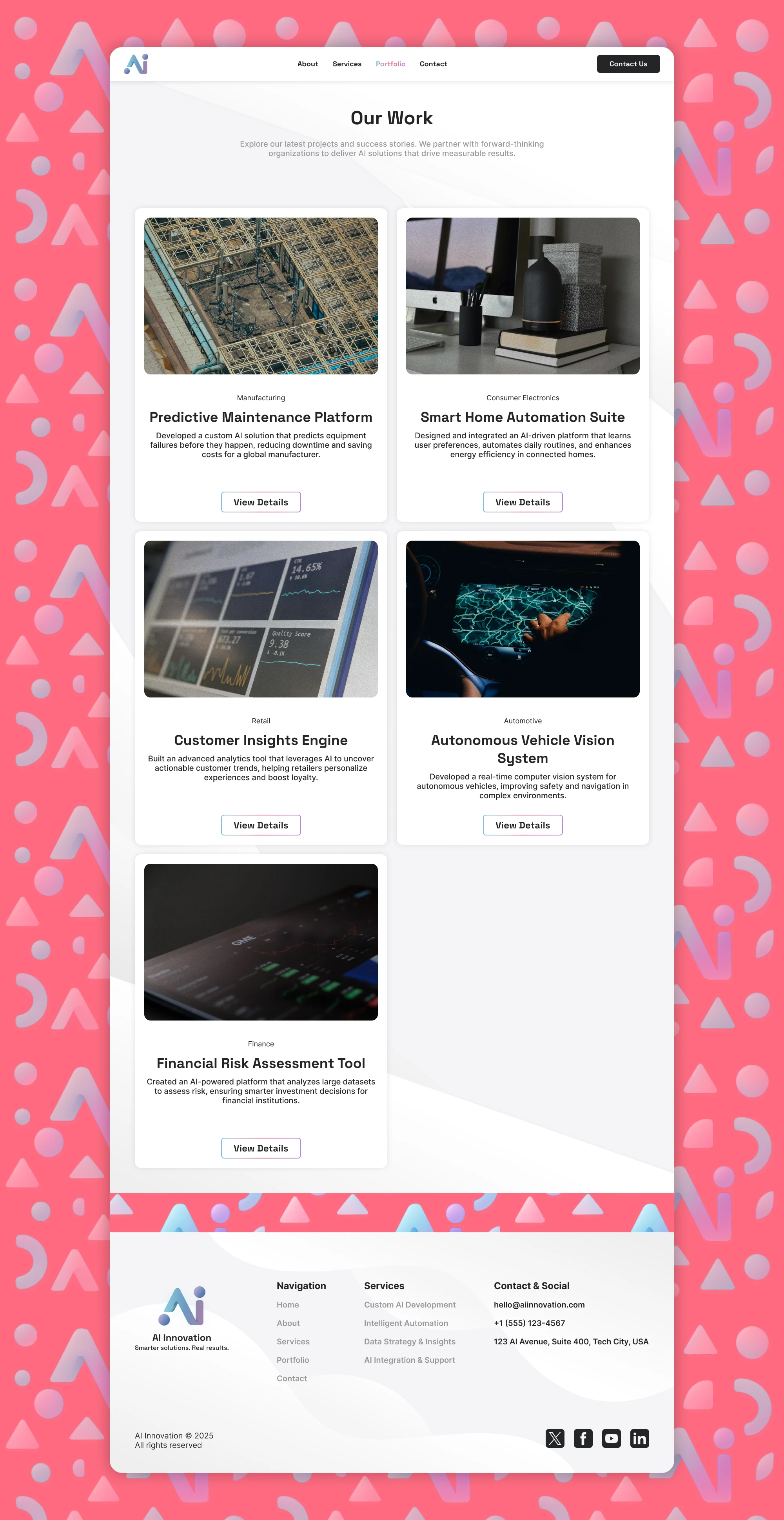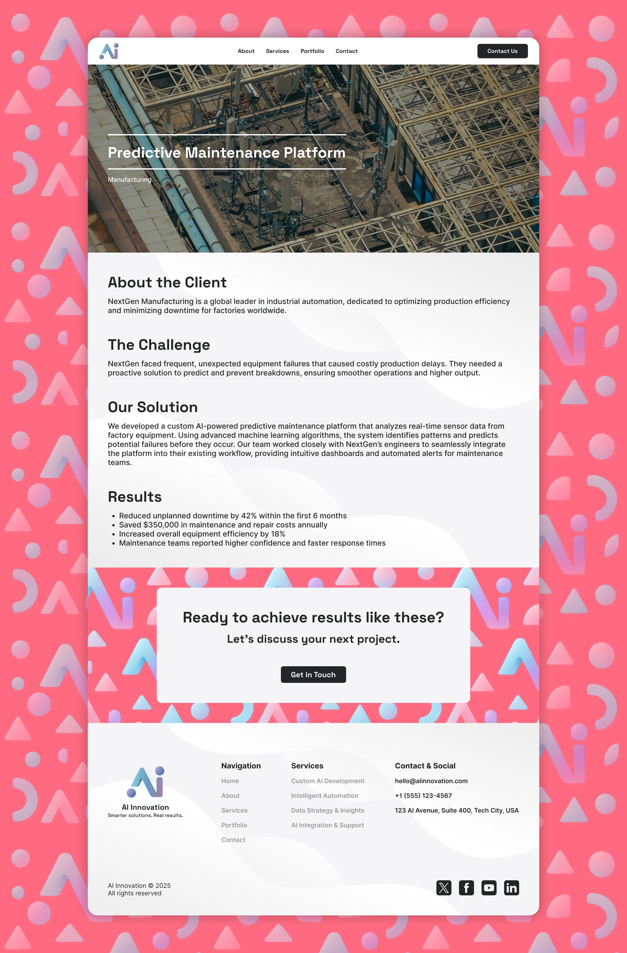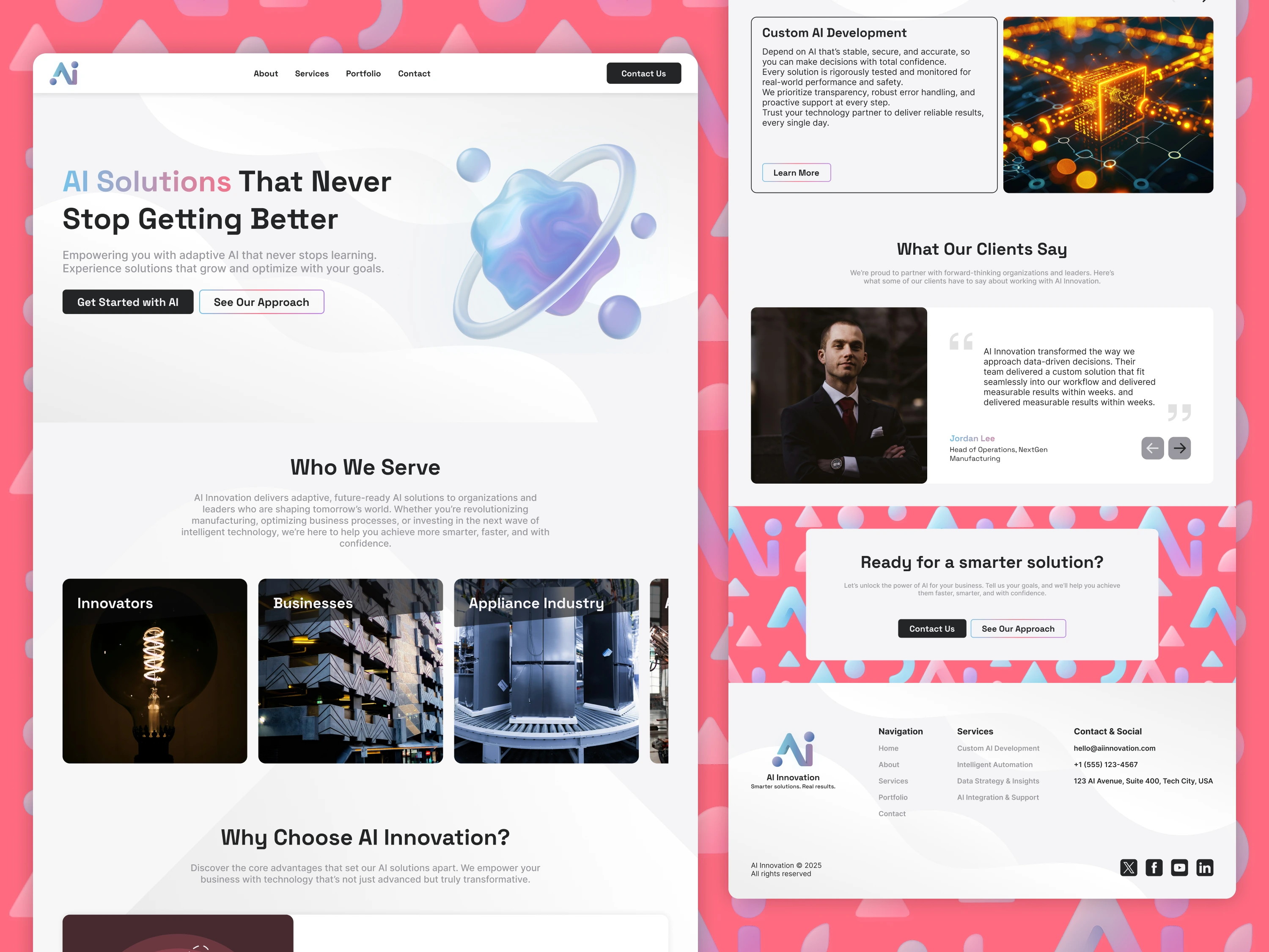 I redesigned the AI Innovation website and logo to create a memorable, tech-forward brand identity. The new site features a sleek, modern design with intuitive navigation and clear calls-to-action for seamless user journeys. The refreshed logo captures the brand’s innovative spirit with a bold blue-purple gradient and geometric precision. I focused on visual impact and accessibility, reorganizing content to highlight AI Innovation’s expertise. The result is a cohesive, user-friendly digital presence that sets the brand apart.