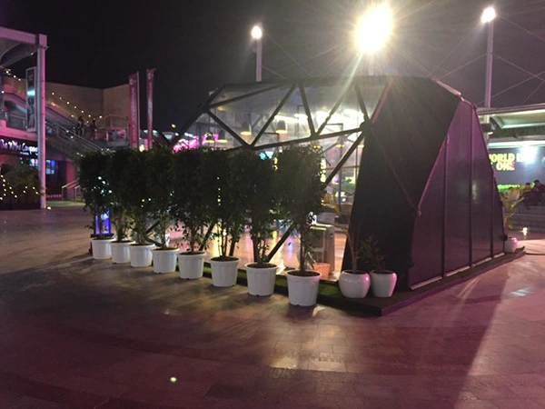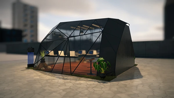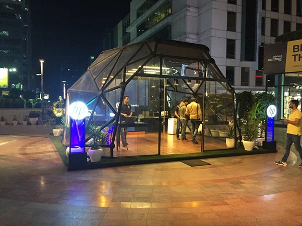 A geodesic dome structure with polygonal clear panels and a modern Nordic igloo inspired design to contrast against the busy architecture of blue tinted glass skyscrapers in the busy Hub of DLF Cybercity in Gurgaon.