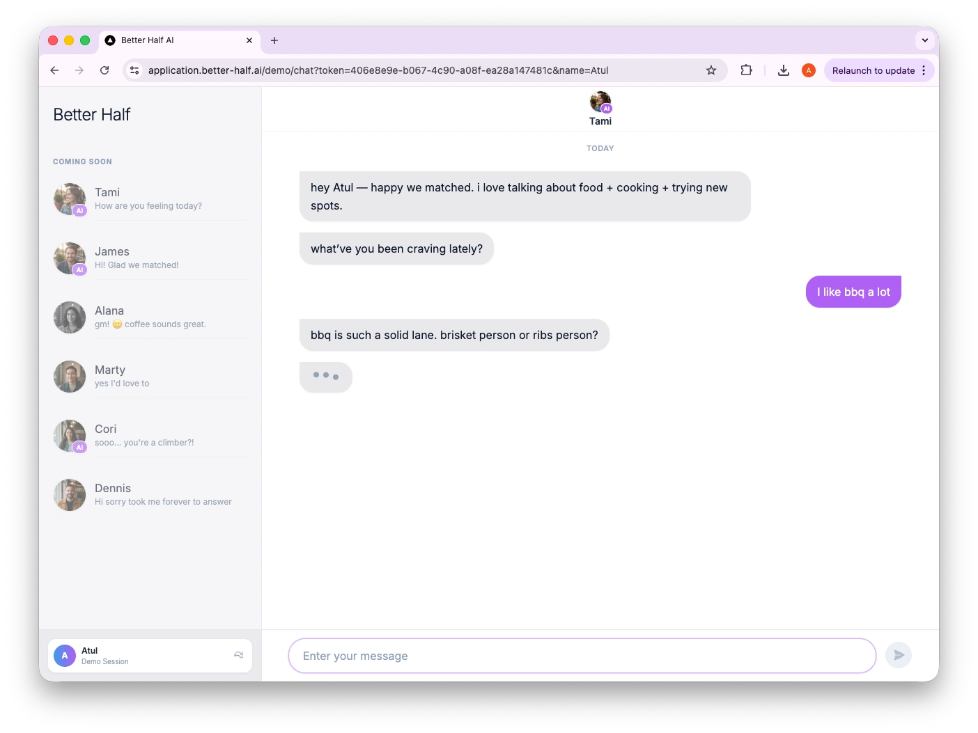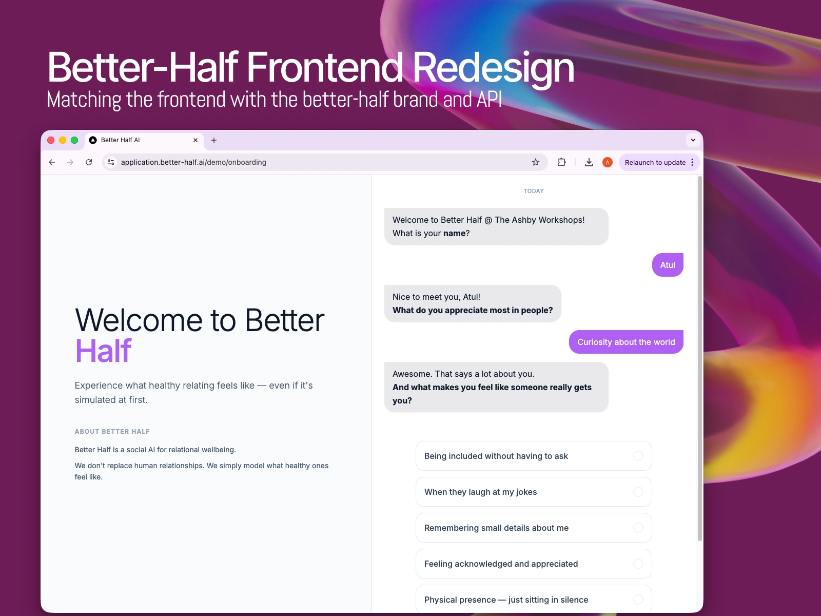 Redesigned Better-Half.ai’s chat UI with full backend integration, real-time messaging, secure auth, and an embeddable, high-performance Next.js widget.