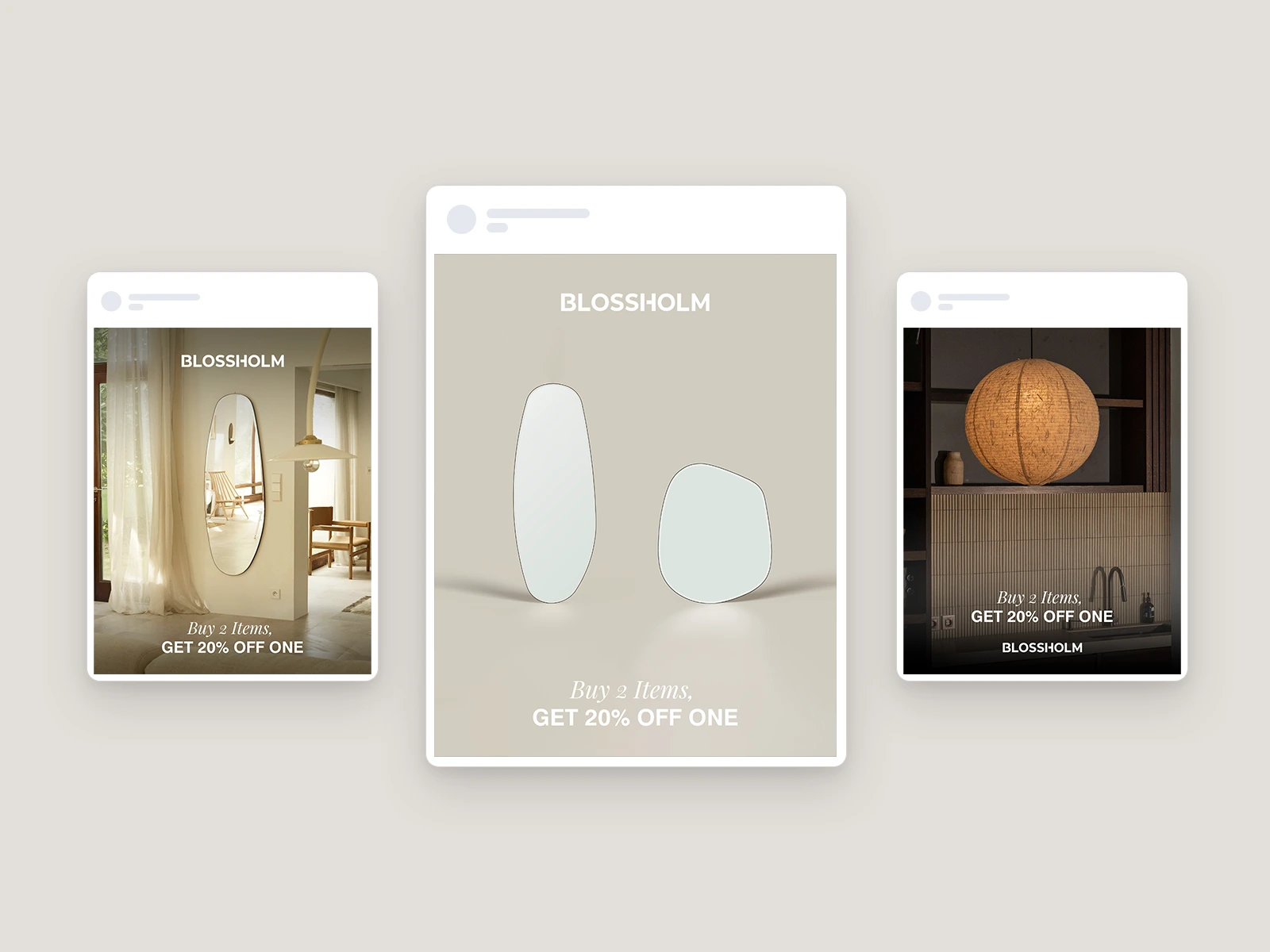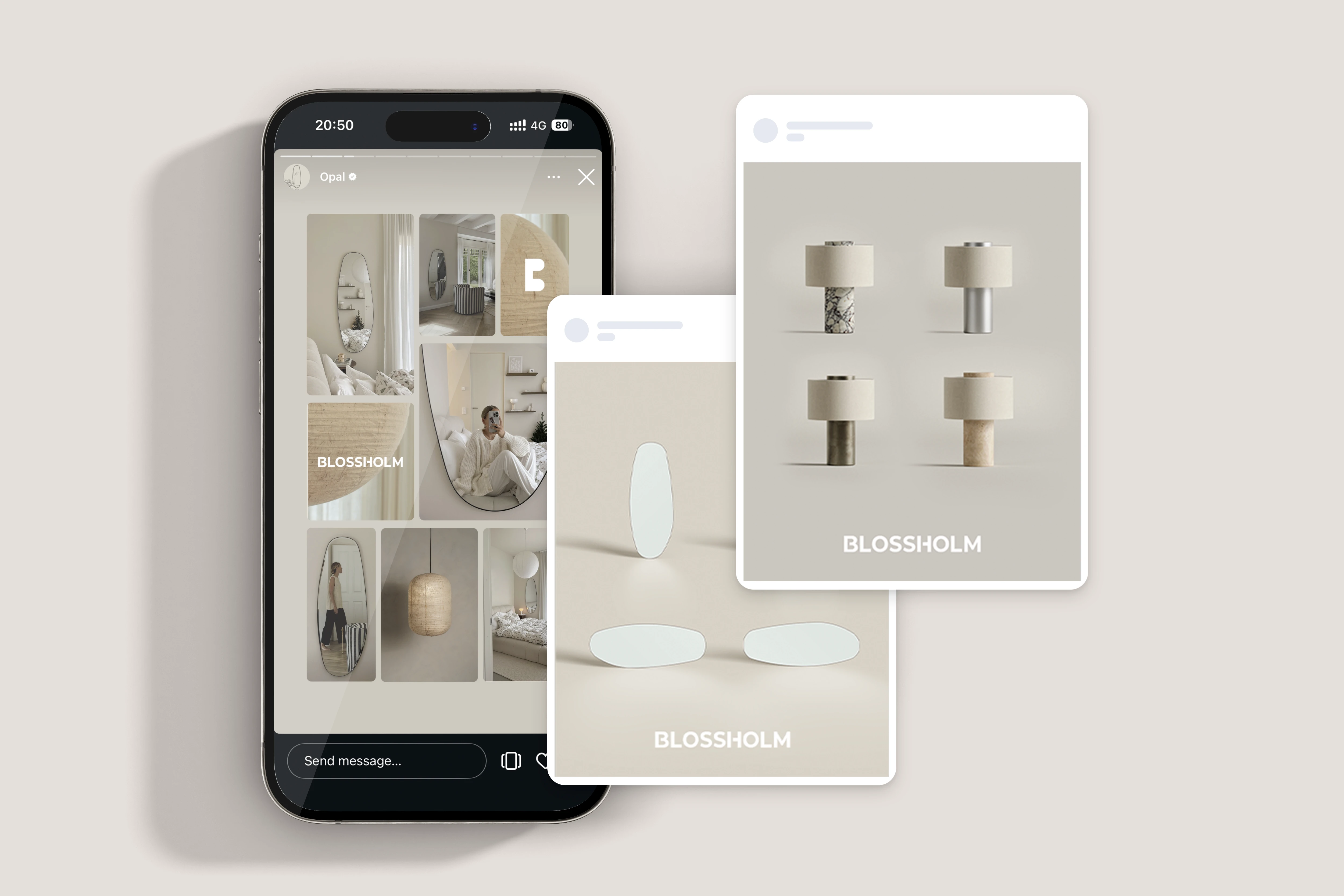 Premium paid social campaign creatives for Blossholm, featuring editorial layouts, lifestyle imagery, and product-focused ads designed for Meta placements.
