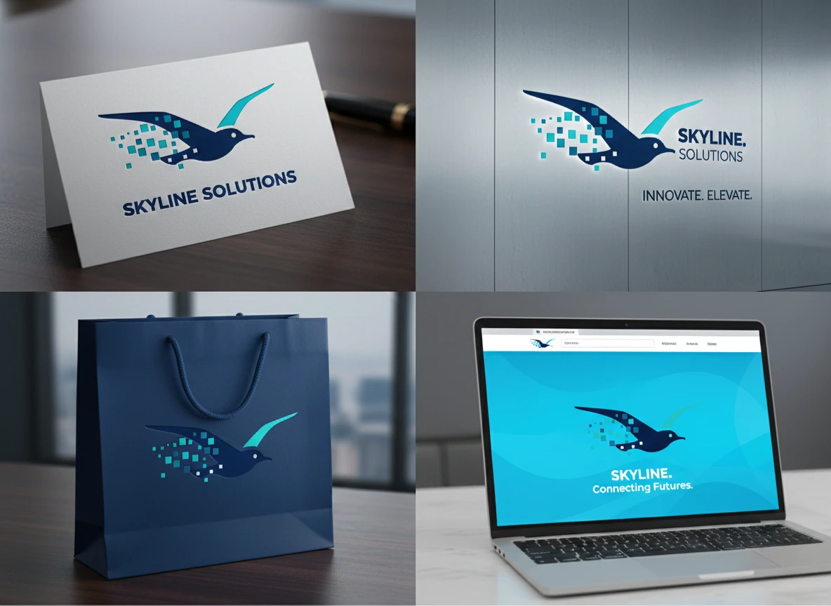 "Skyline Solutions: Tech brand identity focused on growth. Bird icon & pixels signify connectivity. Optimized for digital & print (Web, Stationary, Packaging)."