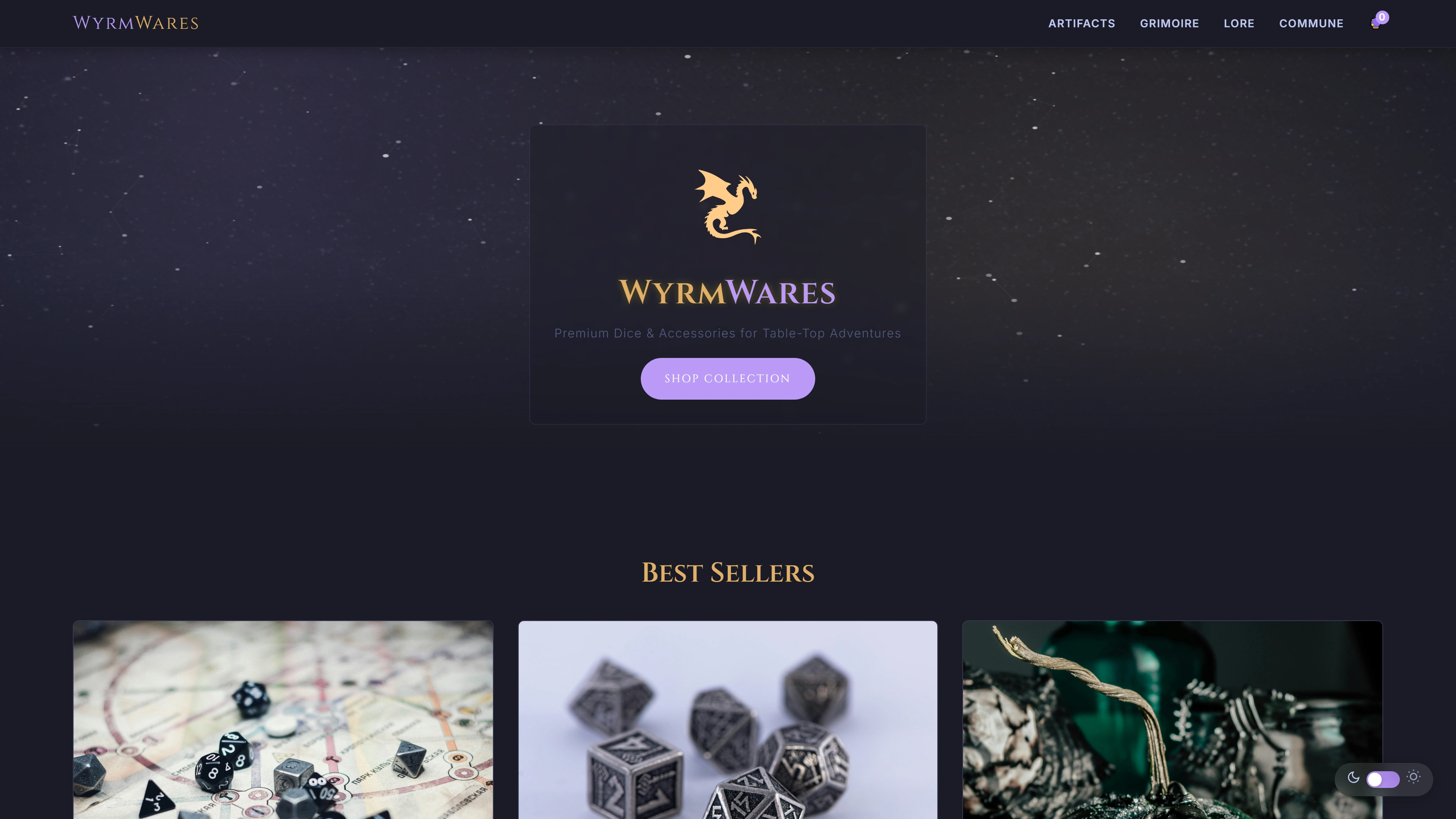 Wyrmwares is a fictional fantasy e-commerce platform for premium TTRPG dice and tabletop accessories. It blends atmospheric design with a smooth, accessible shopping experience, offering both visual immersion and functional clarity.