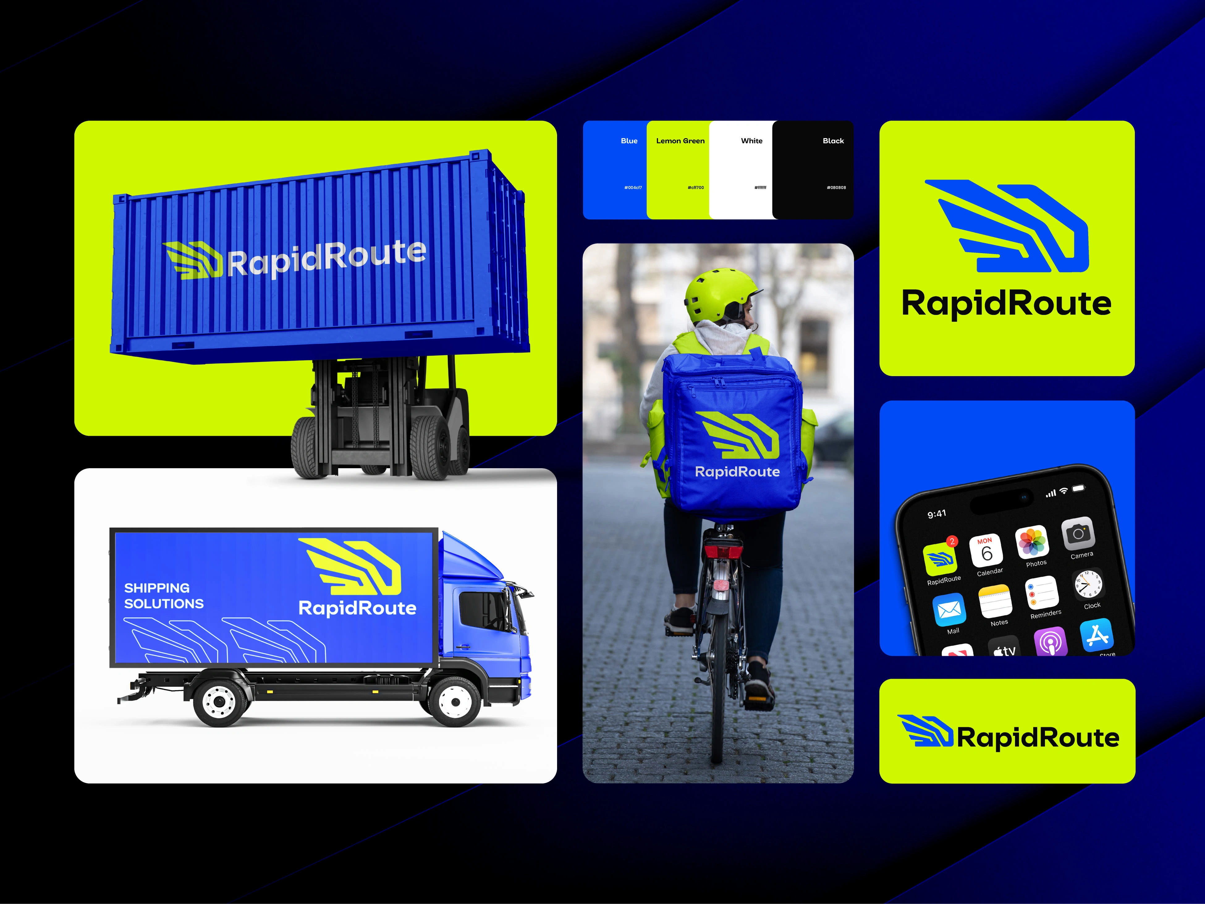 The RapidRoute brand identity embodies speed, efficiency, and modern connectivity in the logistics and delivery industry. With its bold wing-inspired logo mark, the design symbolizes swift movement and reliability. The vibrant color palette of electric blue and lemon green creates strong visibility and memorability across digital, print, and transport applications. From delivery trucks and shipping containers to courier uniforms and mobile apps, this identity ensures RapidRoute communicates trust, innovation, and forward-thinking logistics solutions.