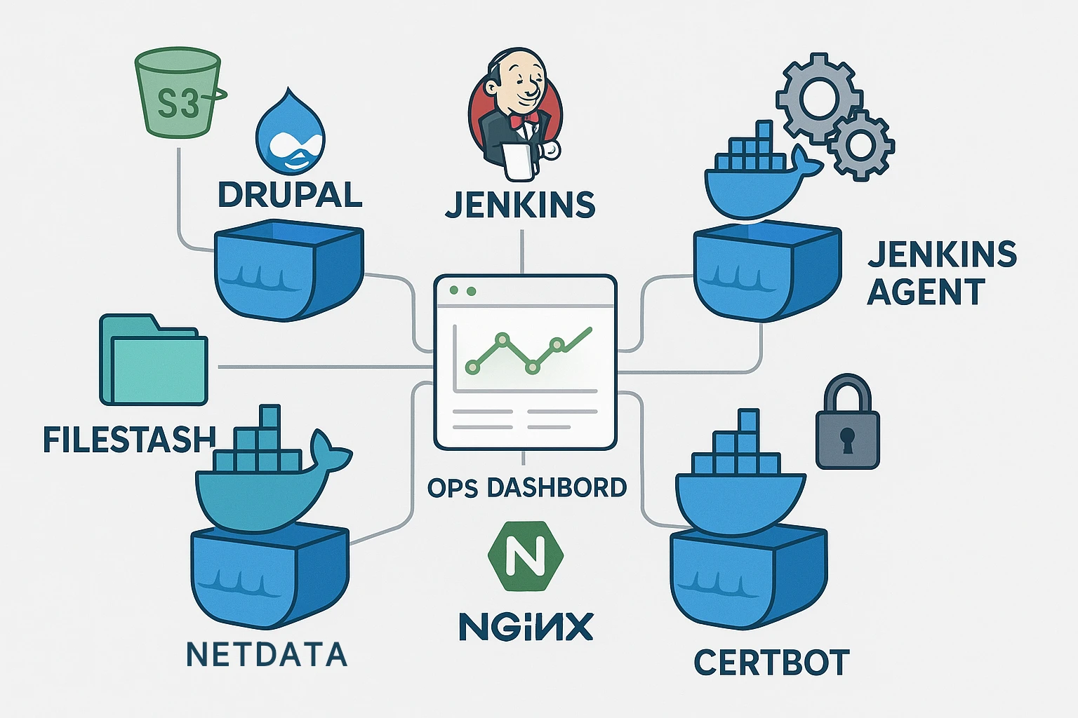 Operations server had grown into a fragile collection of critical tools—Drupal dashboards, Jenkins jobs, file access utilities—all running together on a single VM. Over time, manual configuration changes and dependency conflicts made updates risky and disaster recovery slow.