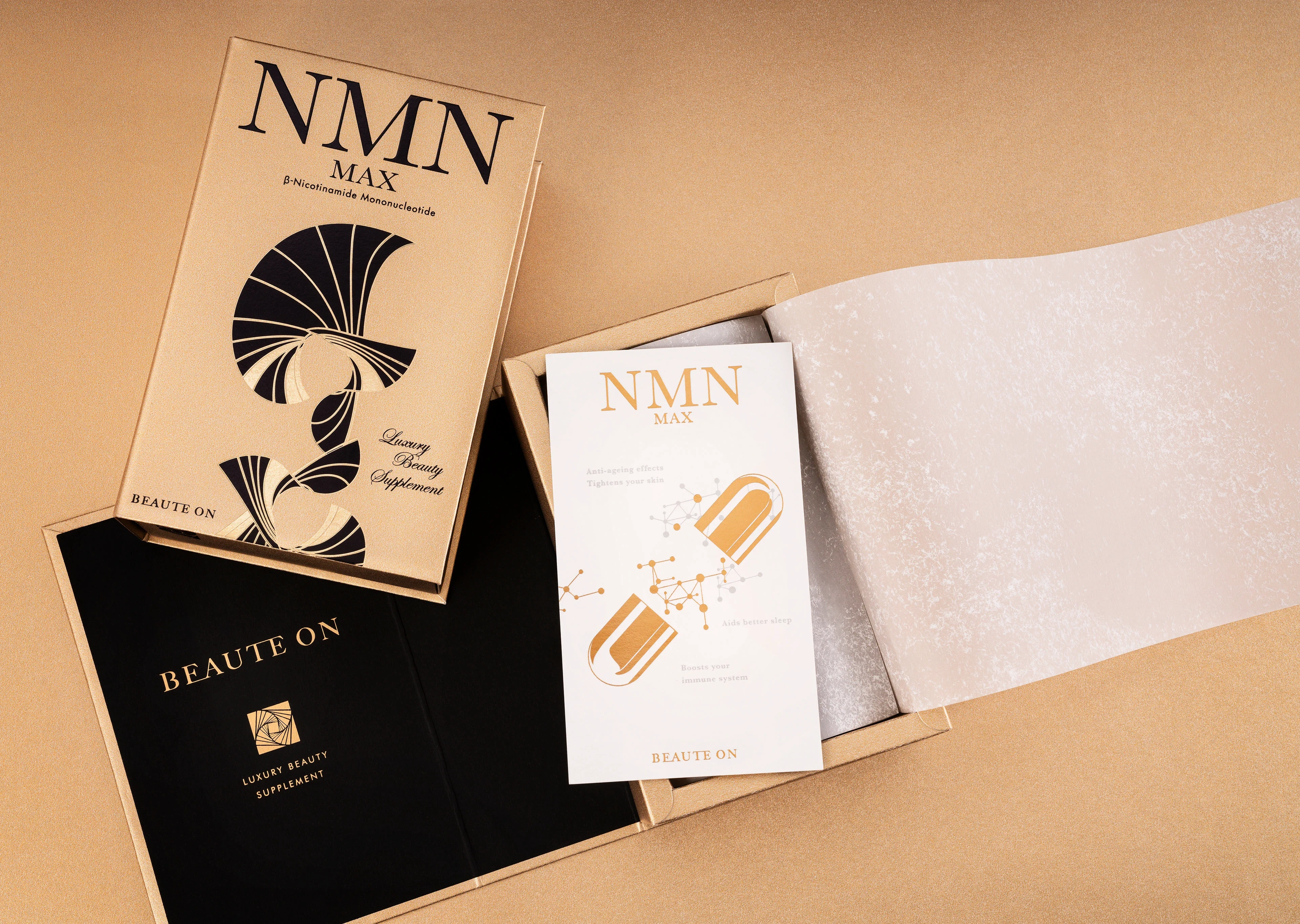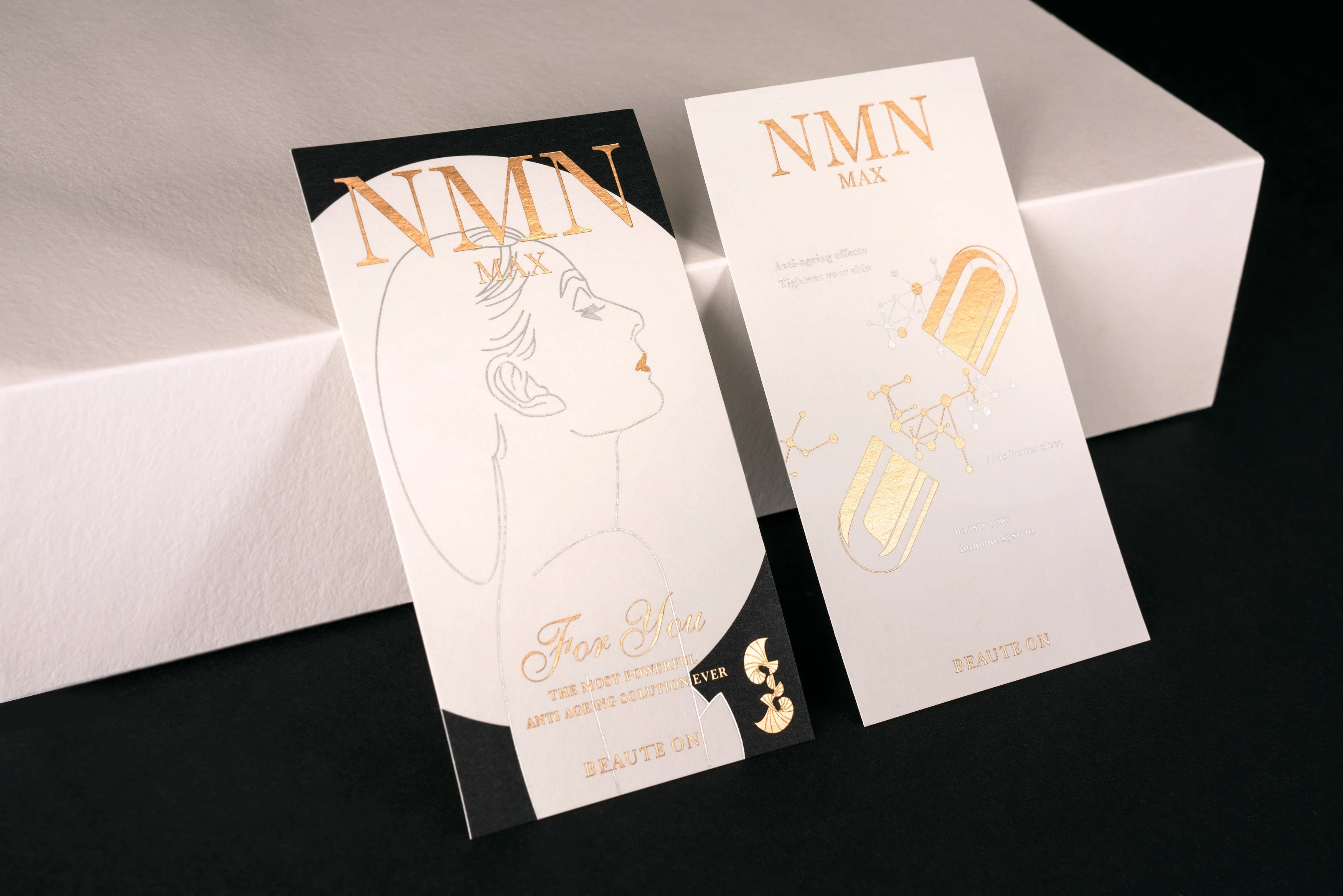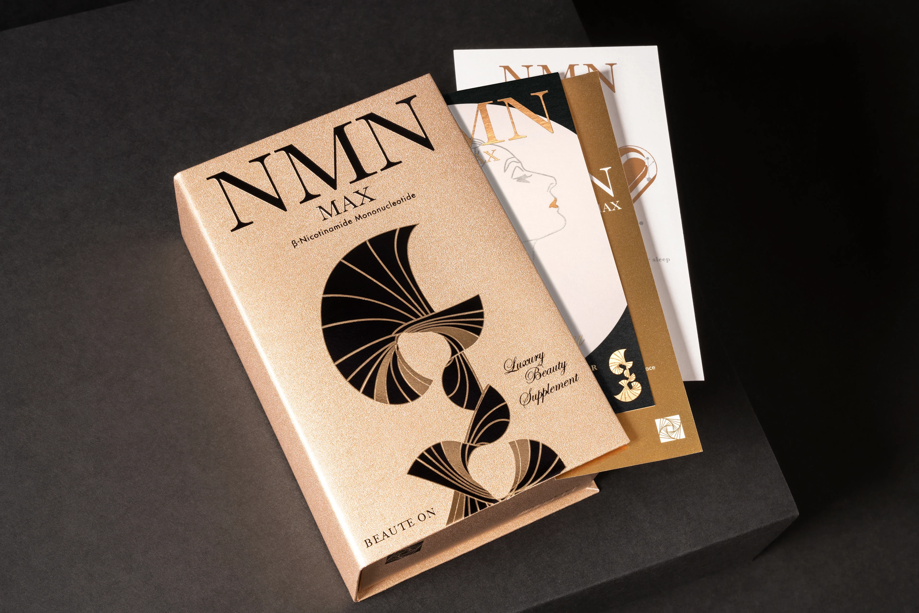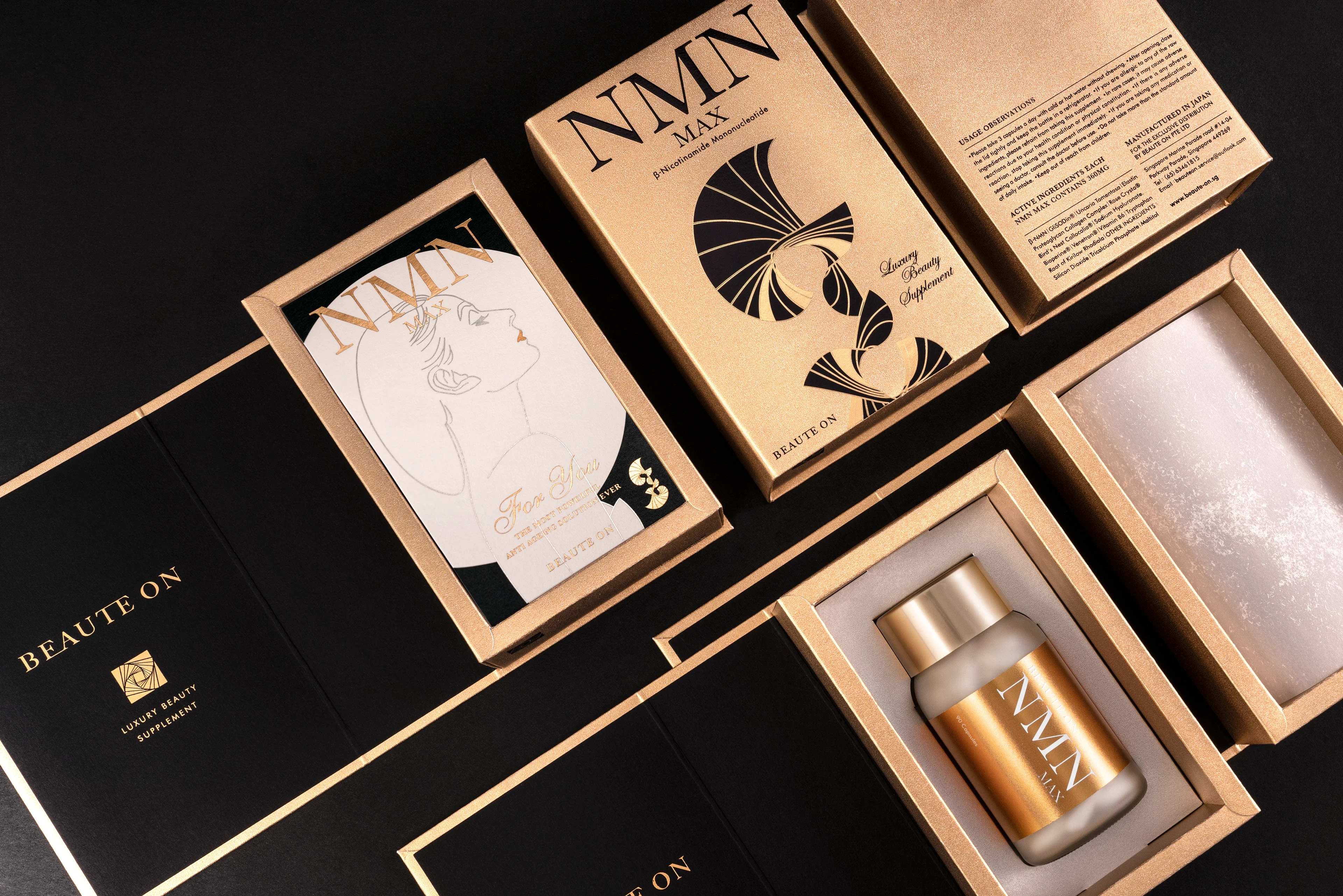 Presented in a gold segmentation technique, the DNA symbols are interspersed with images of beautiful elements on the back, presenting a perfect combination of technology and life. A card is included in the box, with a pattern is made of hot-stamped gold and matte silver, outlining an enchanting beauty under the bright moonlight on the front. The French word "BEAUTE", which symbolizes allure, beauty and nobility, is taken as the brand name. The NMN time capsule is presented on the reverse side, both of which are full of artistic visual effects, dramatically demonstrating the brand's commitment to bringing consumers the most advanced technology to travel through time and space, and to return to youthful vitality that stays.