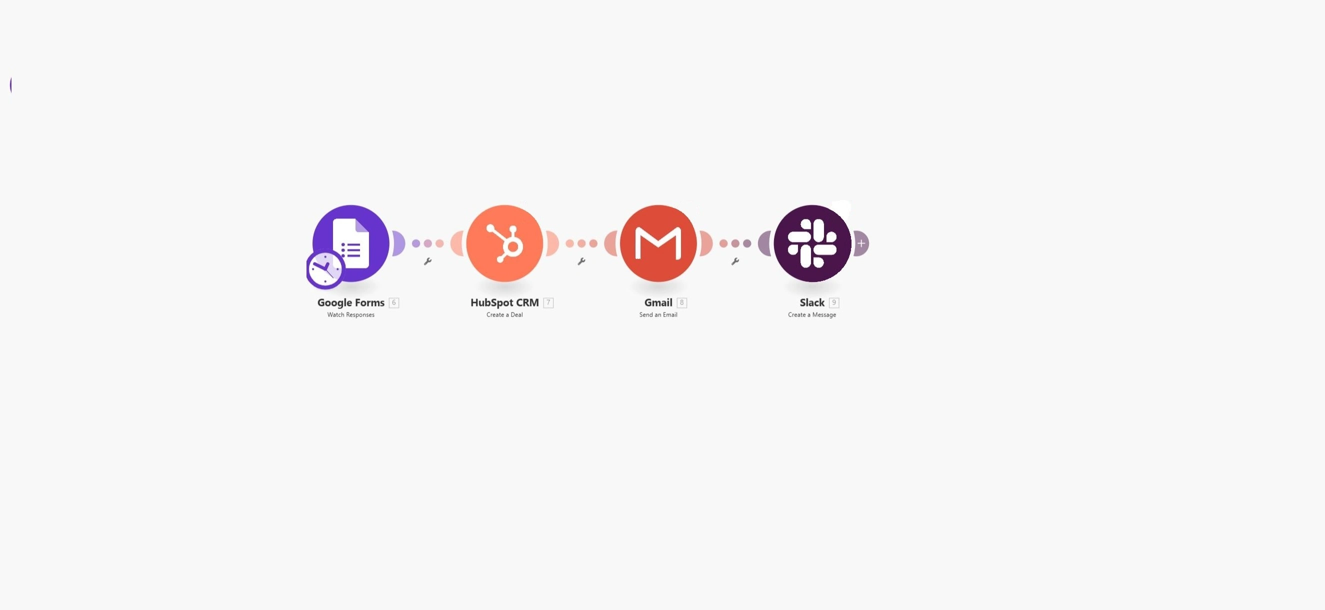 I designed an automation that captures Google Forms responses and automatically creates a new deal in HubSpot CRM, sends a confirmation email via Gmail, and posts a notification to Slack for the team. This end-to-end workflow ensures leads are instantly processed, acknowledged, and shared with the team without manual intervention.