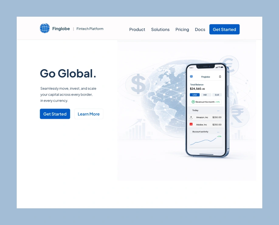 Finglobe is a conceptual fintech SaaS platform designed to help businesses move, accept, and manage money across borders from a single dashboard.