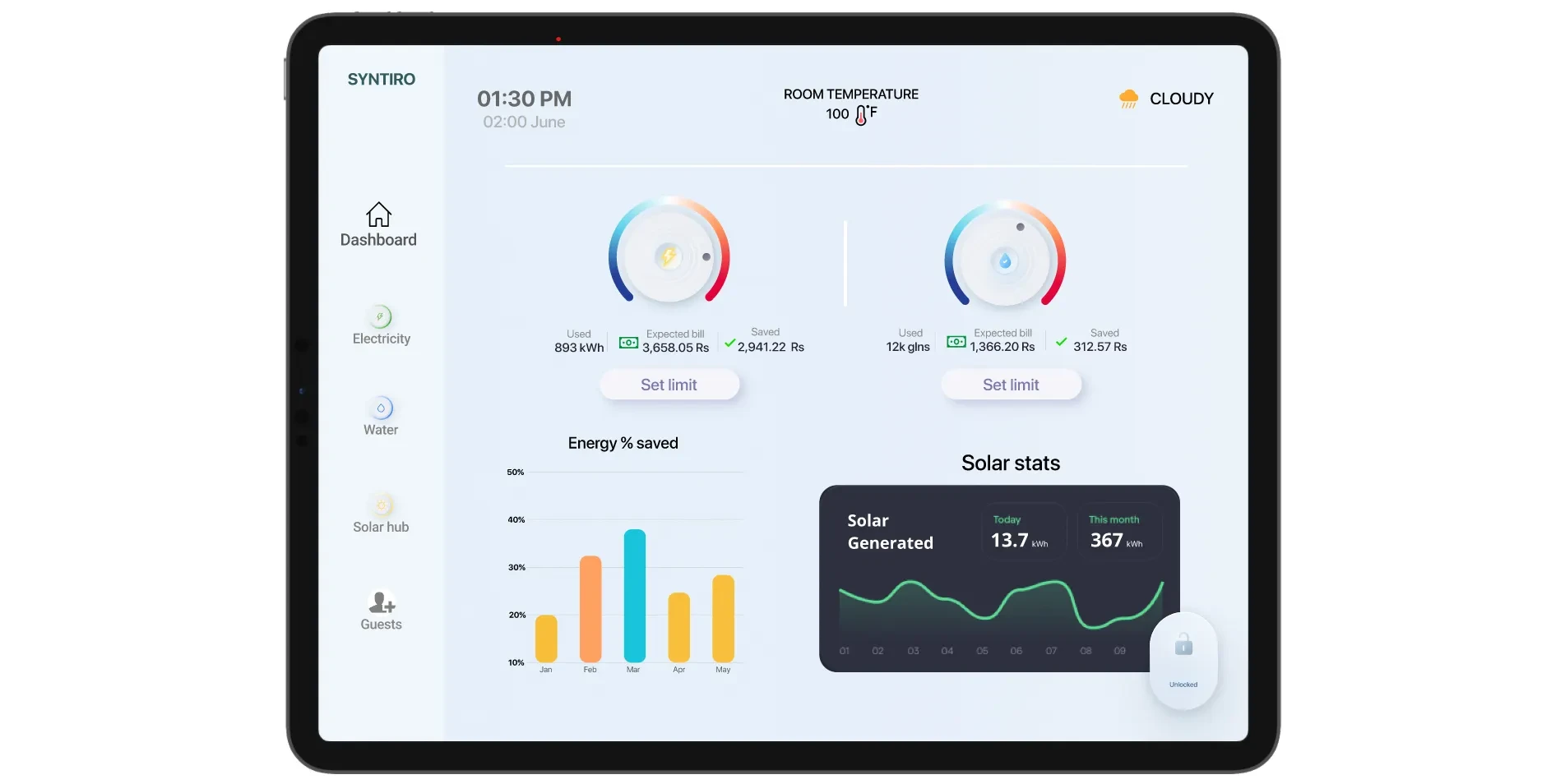 Syntiro is an integrated system that monitors our day-to-day Electricity & water usage and help optimize it. With live stats, remote control over appliances and Solar roof add-on, this is the one for all solution to all your problems.