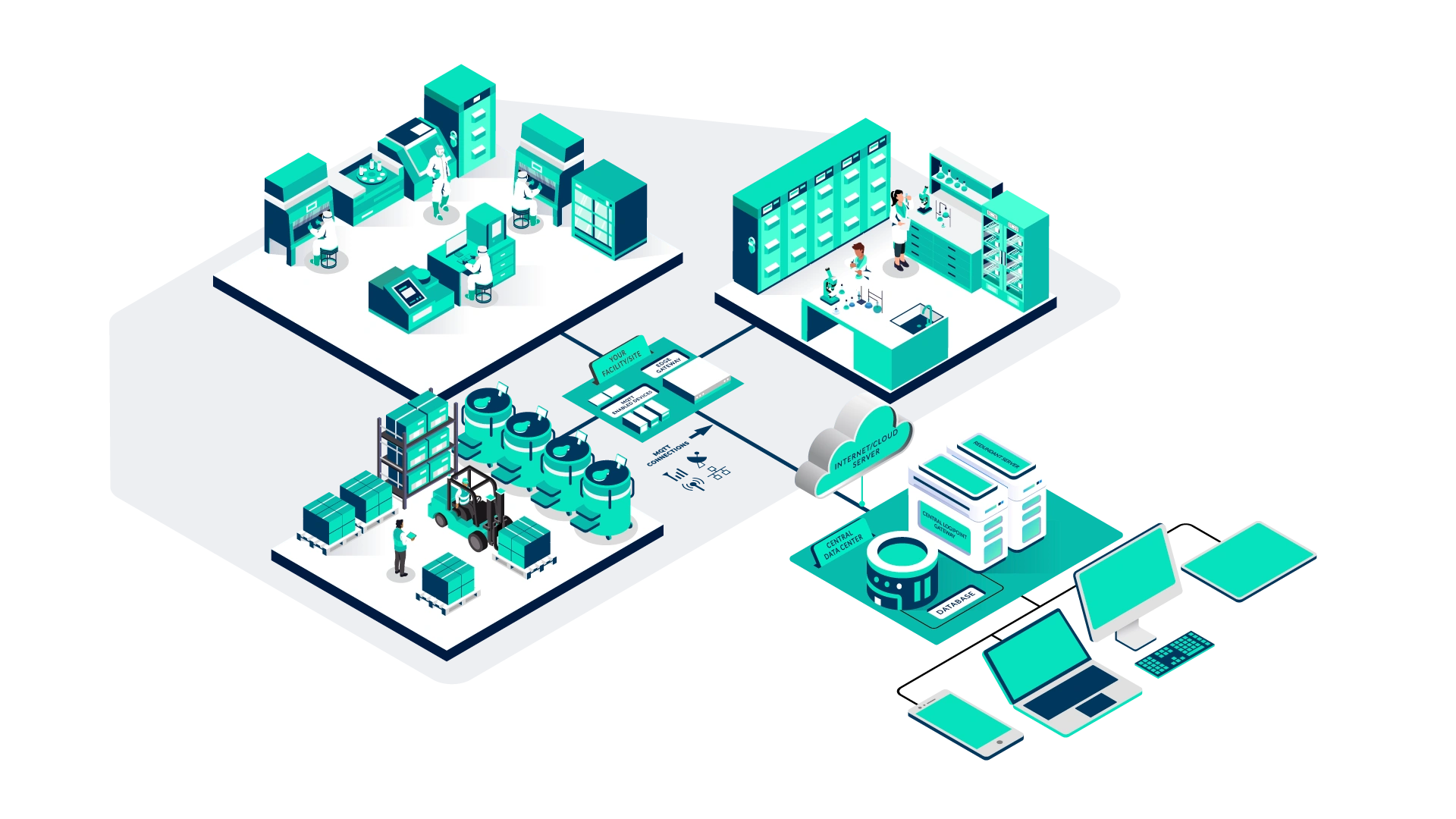 Did an isometric architecture diagram design for a company's SaaS software "LogiPoint", a facility monitoring system for GMP laboratory equipment and production areas.