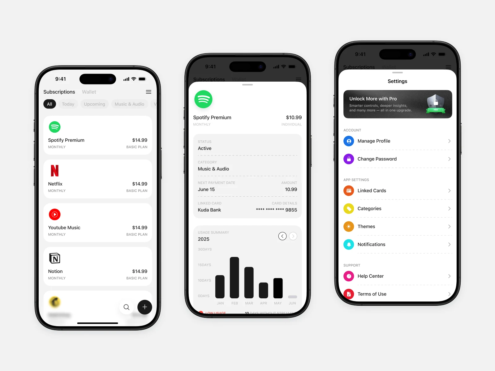 This mobile app keeps all your subscriptions, from Spotify to that sneaky gym plan, tracking, managing, and making sense of all your subscriptions. Designed to simplify, built to save.