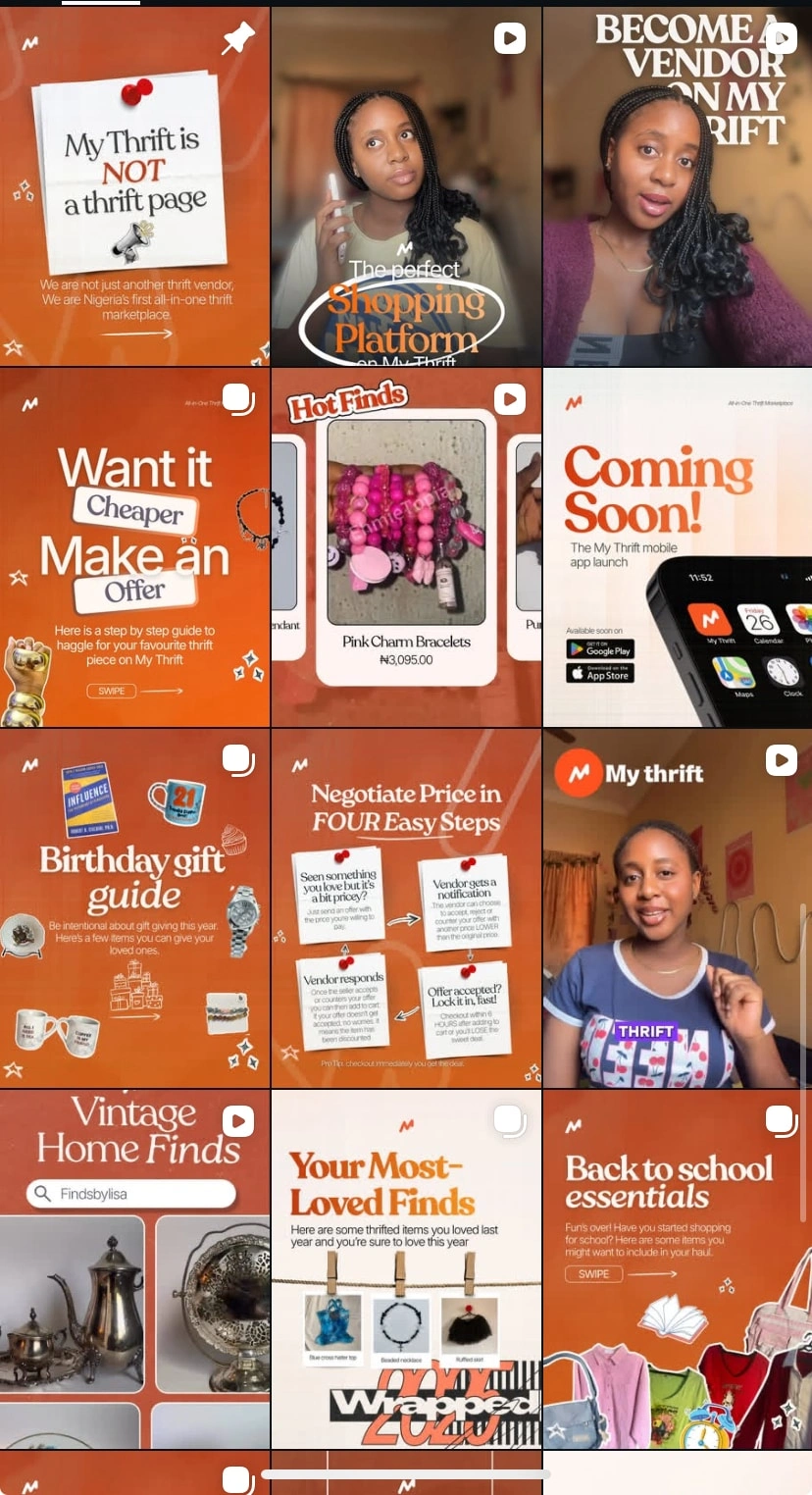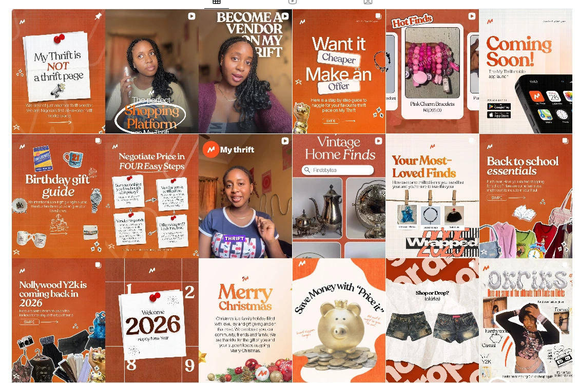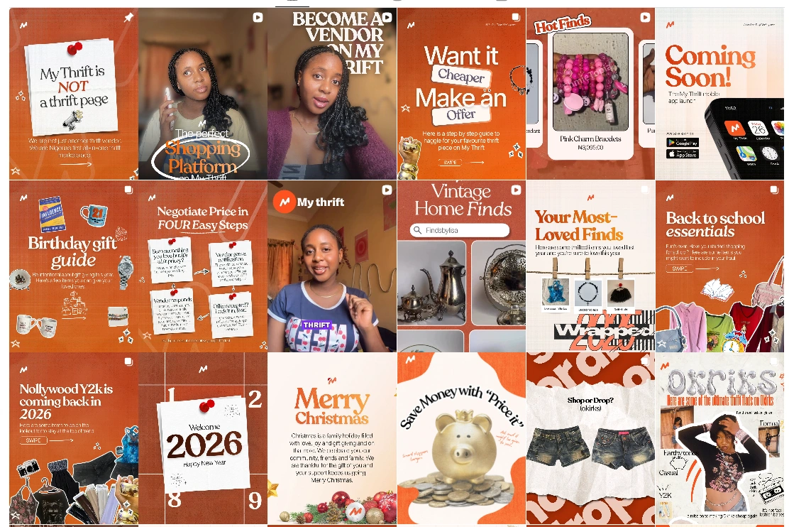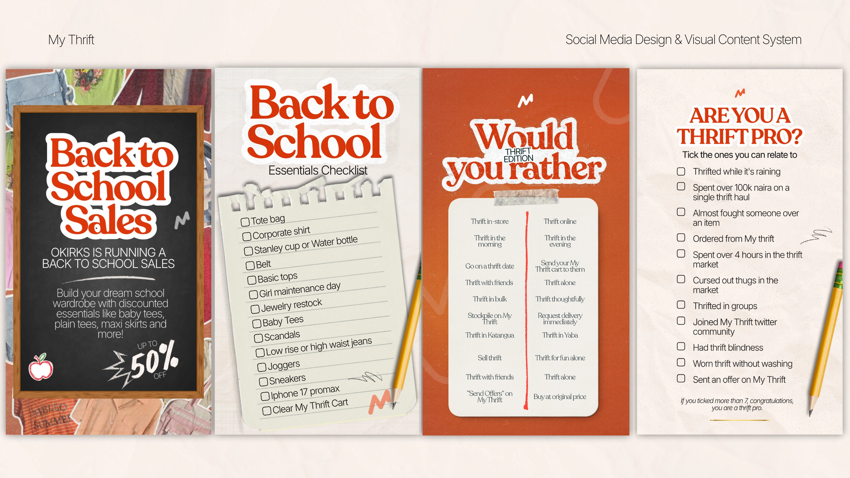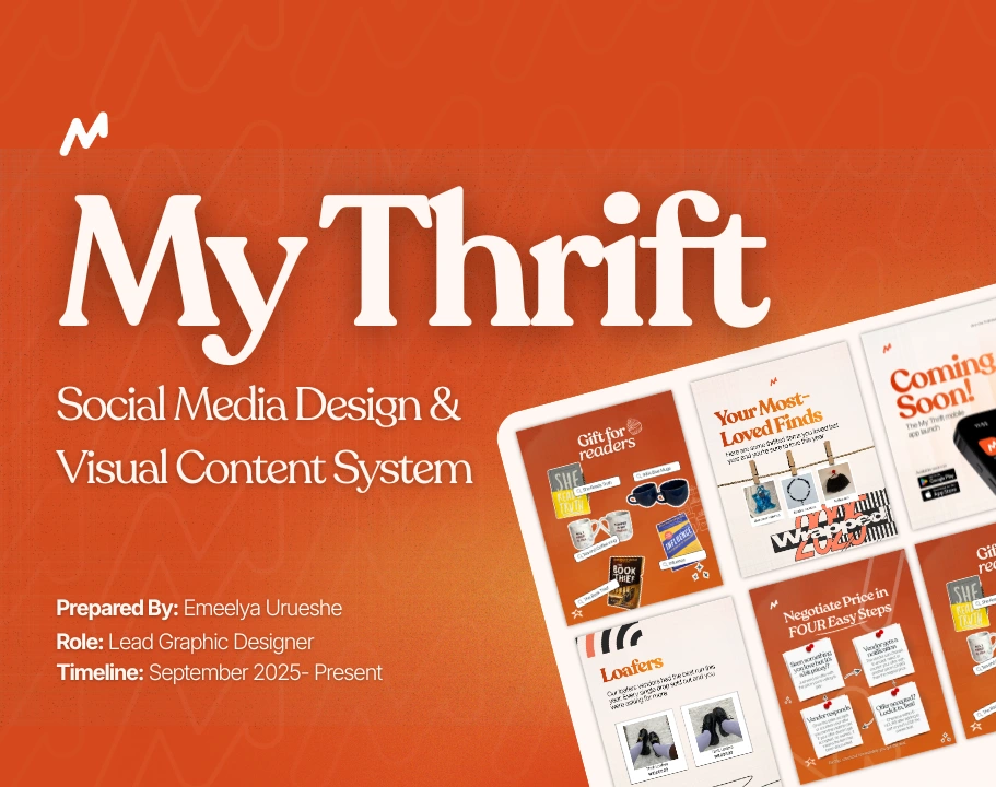 My Thrift had established its brand positioning but needed a consistent visual presence across social platforms. My challenge was to translate the brand's retro-modern aesthetic into scroll-stopping social content that would resonate with Gen Z Nigerian women across Instagram, TikTok, Twitter, and Facebook.