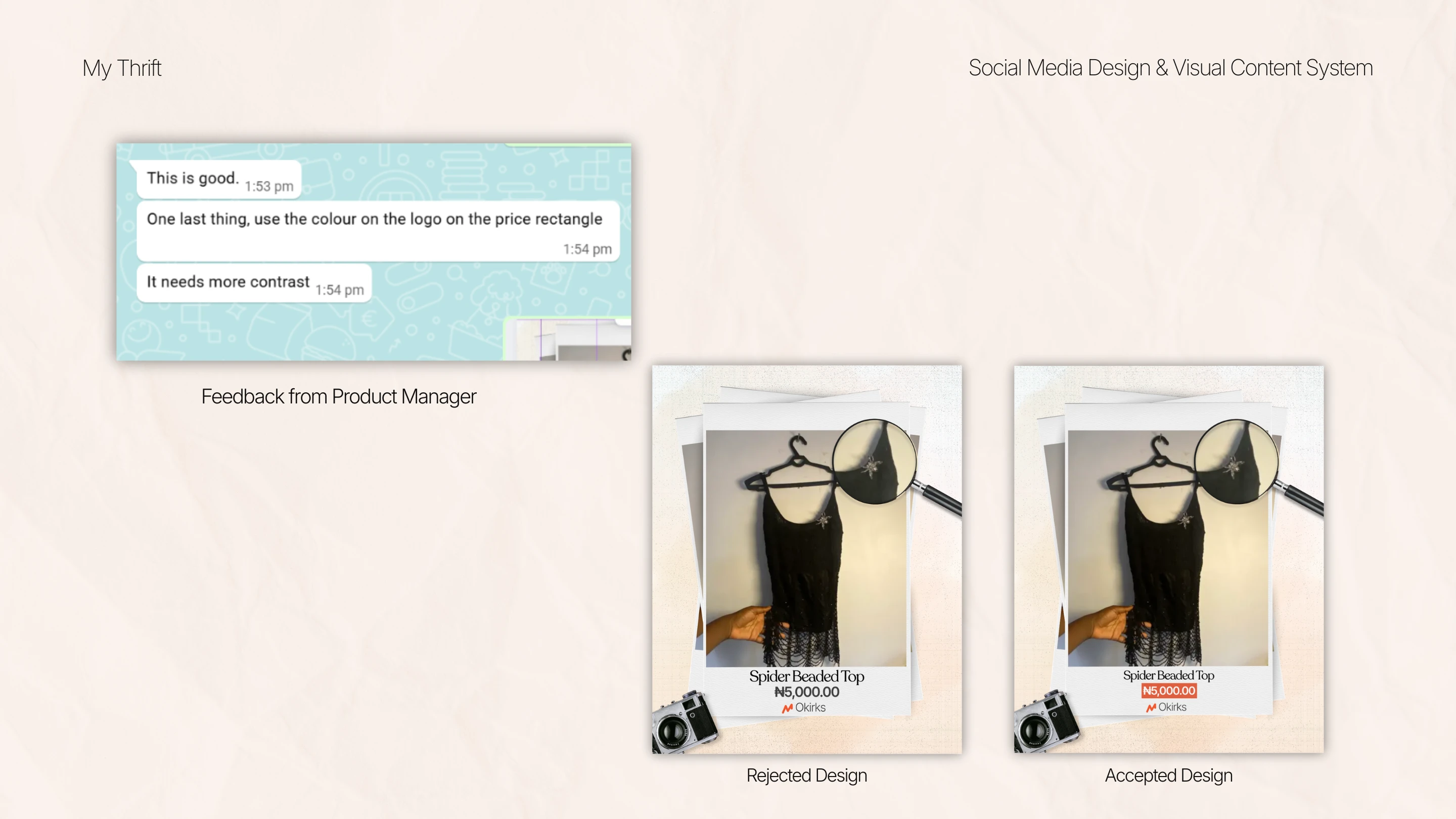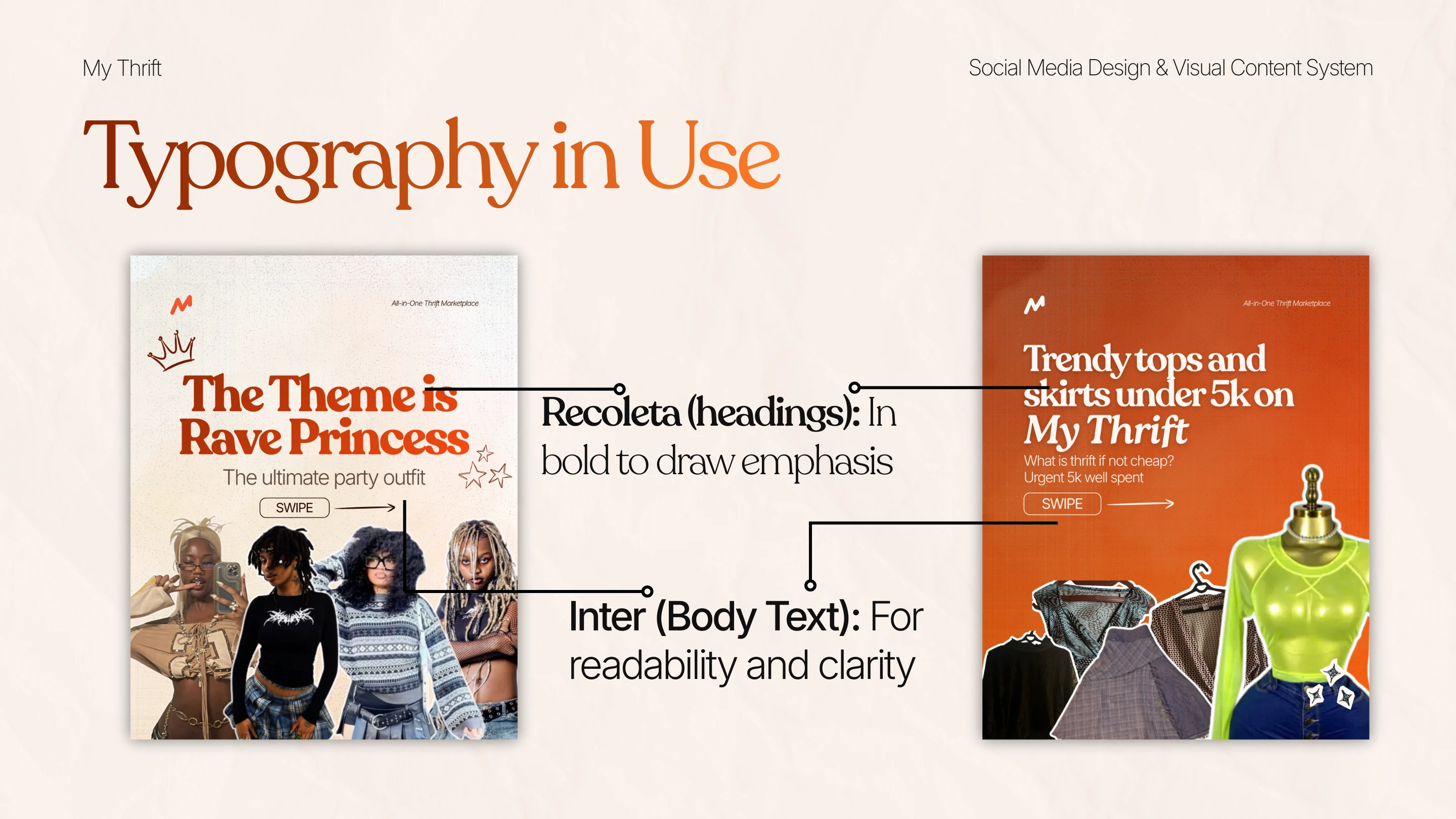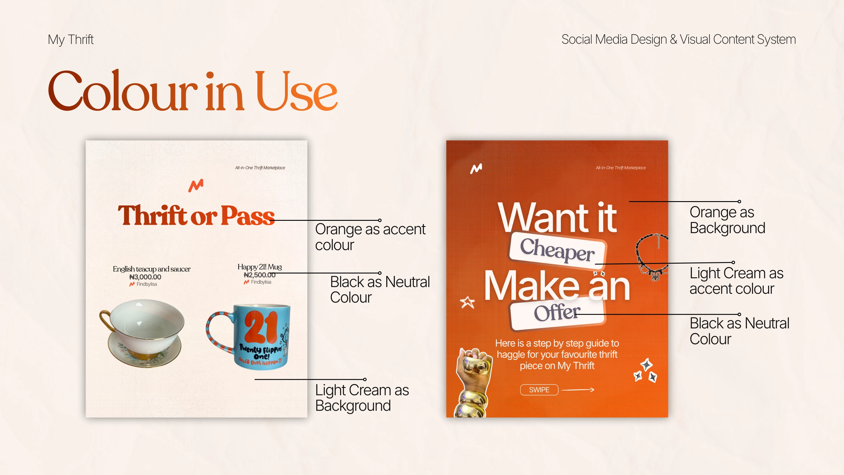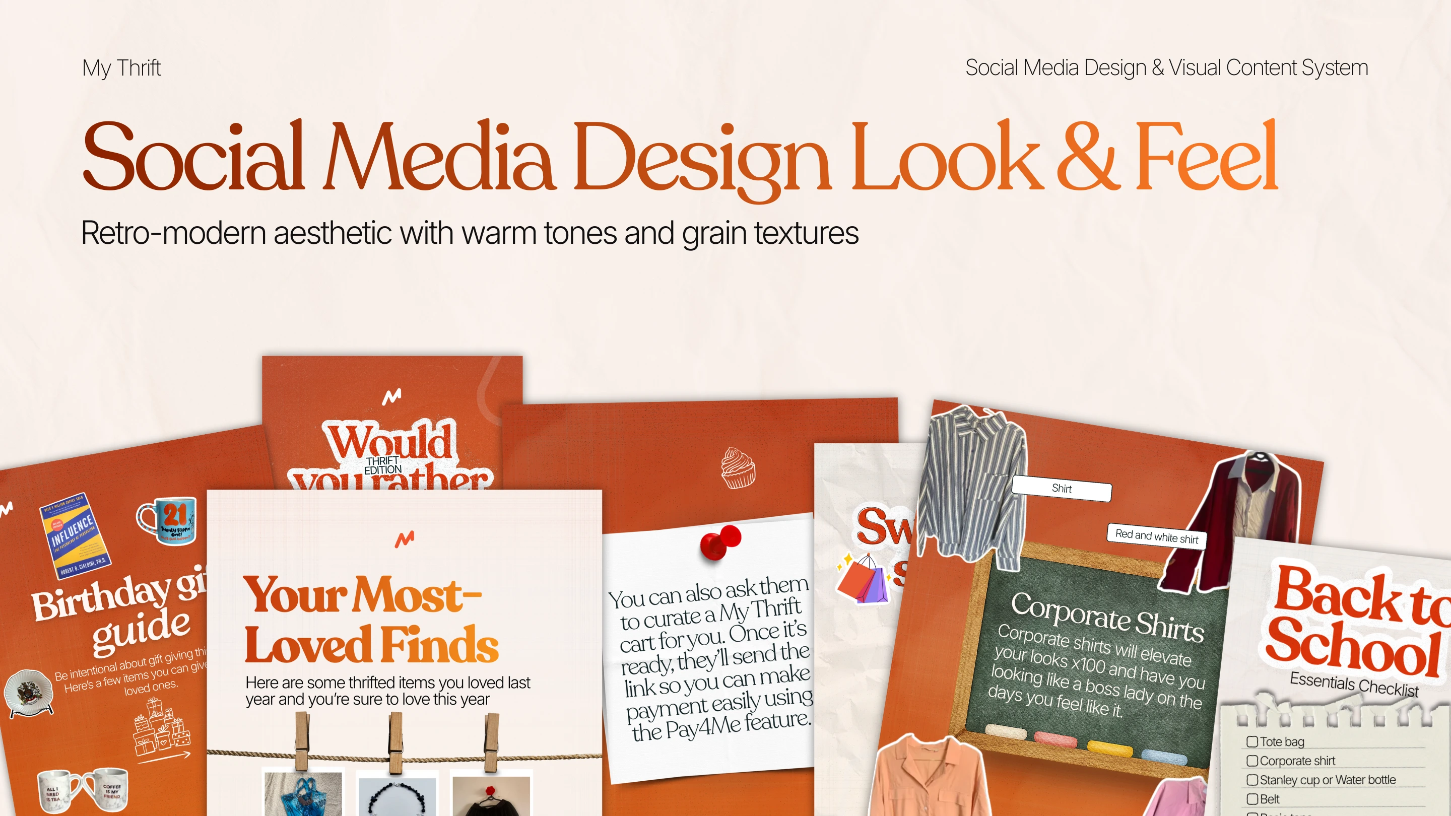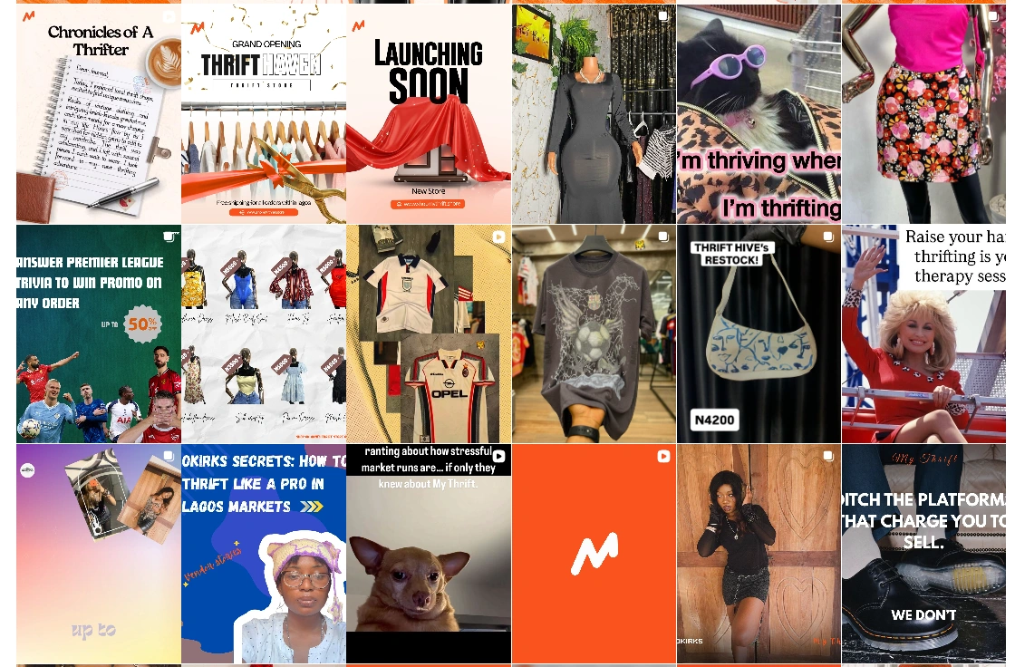My Thrift had established its brand positioning but needed a consistent visual presence across social platforms. My challenge was to translate the brand's retro-modern aesthetic into scroll-stopping social content that would resonate with Gen Z Nigerian women across Instagram, TikTok, Twitter, and Facebook.