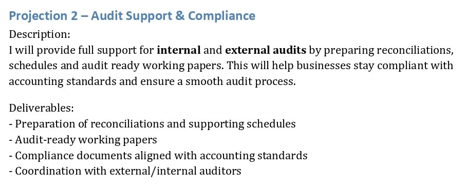 - Reconciliations and supporting schedules - Audit ready working papers - Compliance documents aligned with accounting standards - Coordination with external