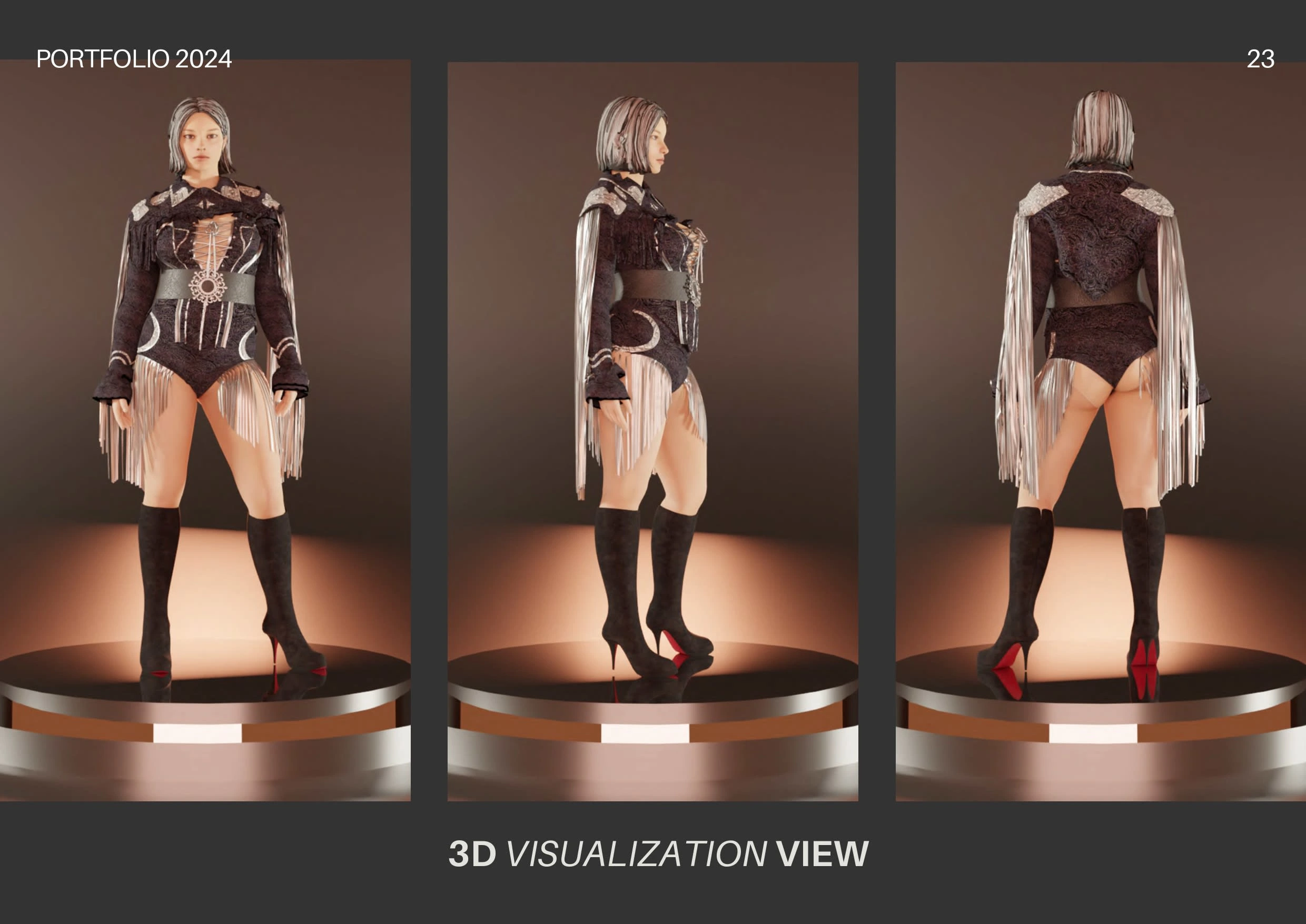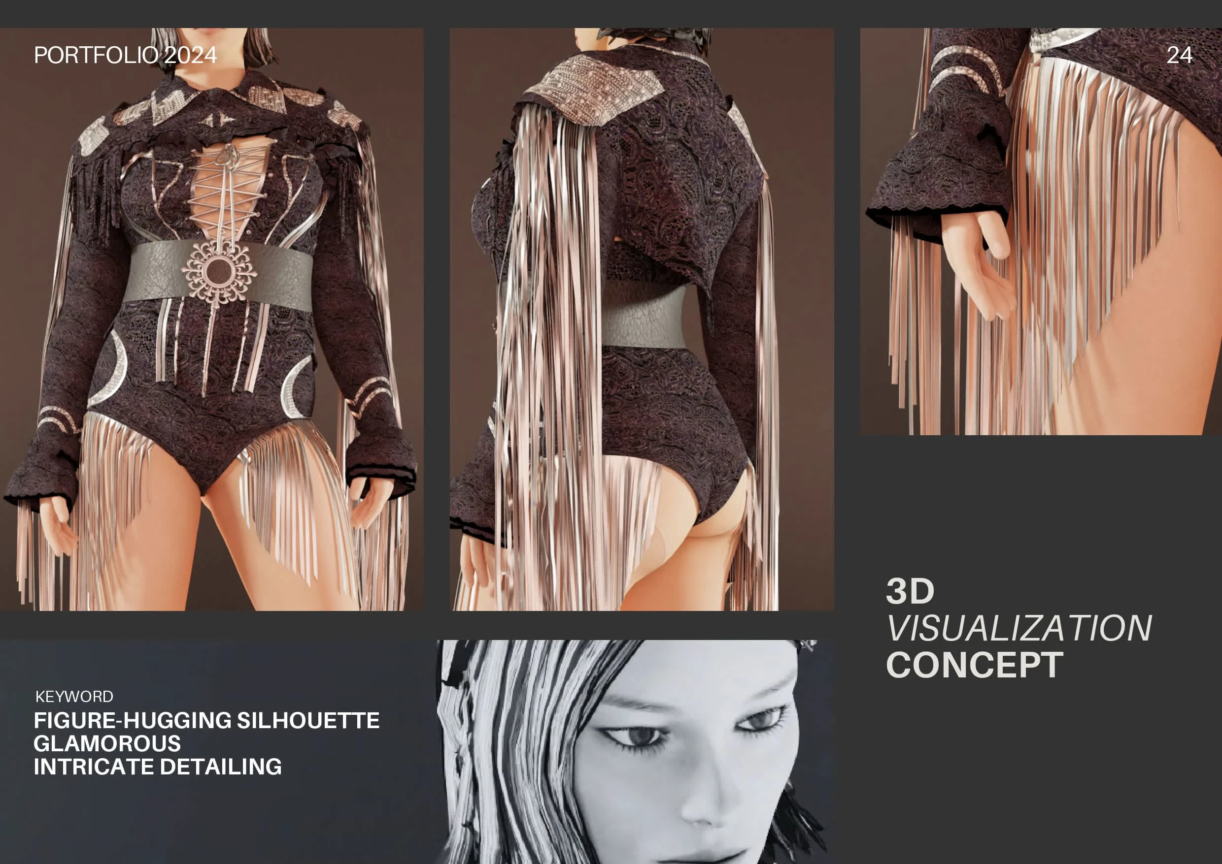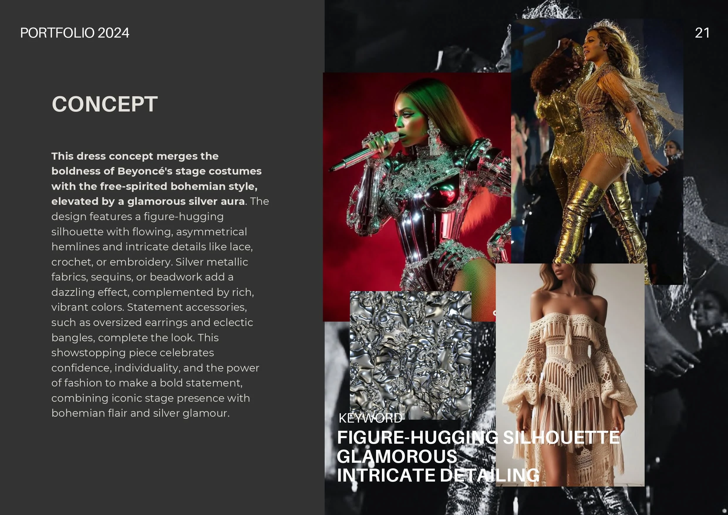 This dress concept merges the boldness of Beyoncé's stage costumes with the free-spirited bohemian style, elevated by a glamorous silver aura.