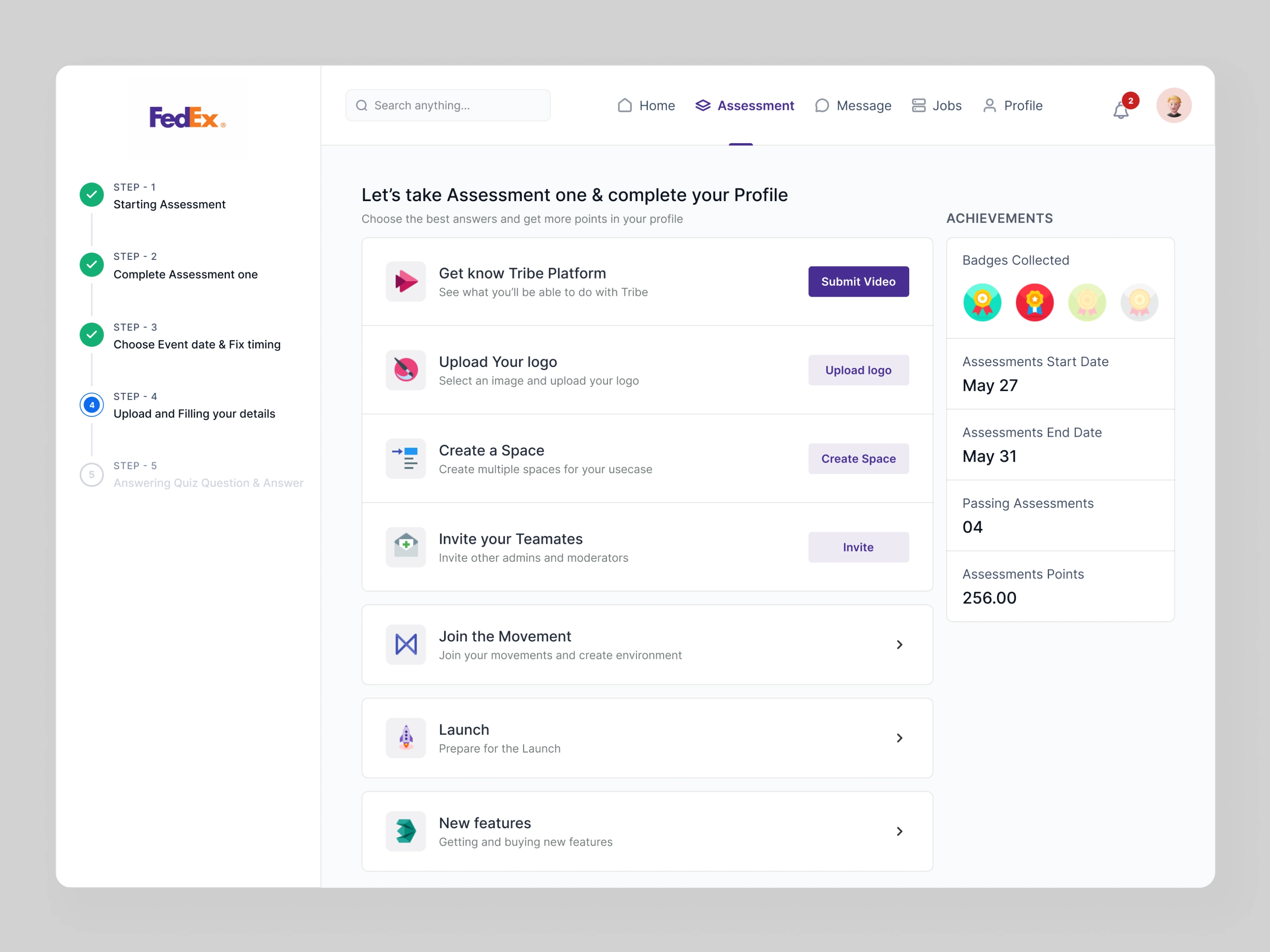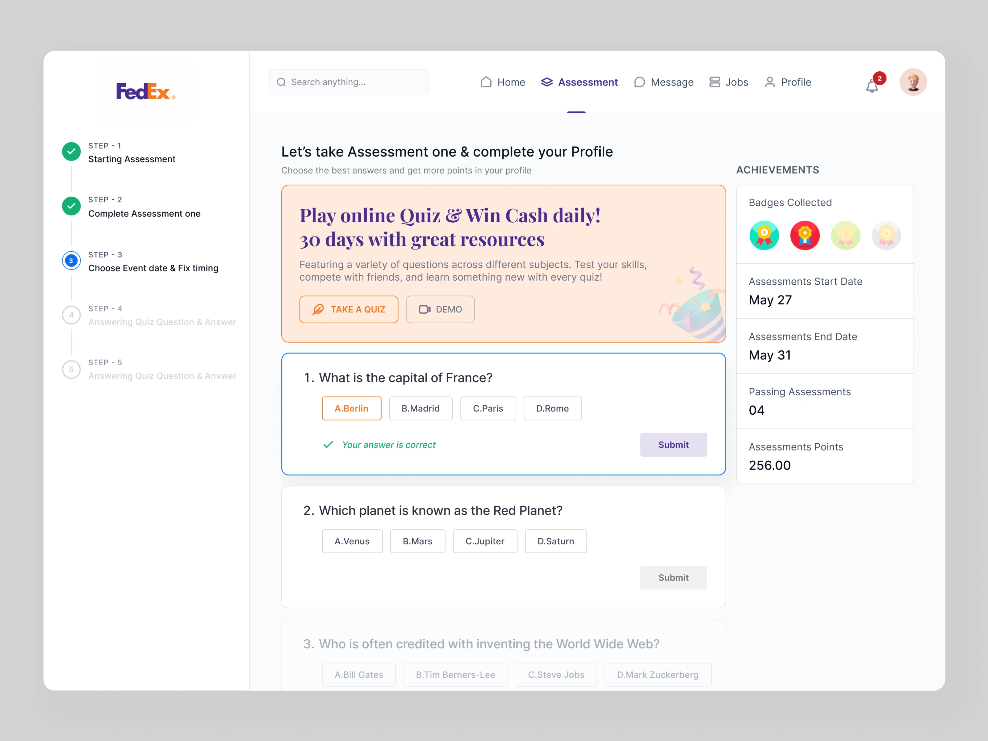 This project is a web-based assessment and quiz management dashboard designed for an enterprise learning and evaluation platform. The interface guides users through a structured assessment flow—from onboarding to quiz completion—while tracking progress, achievements, and performance.