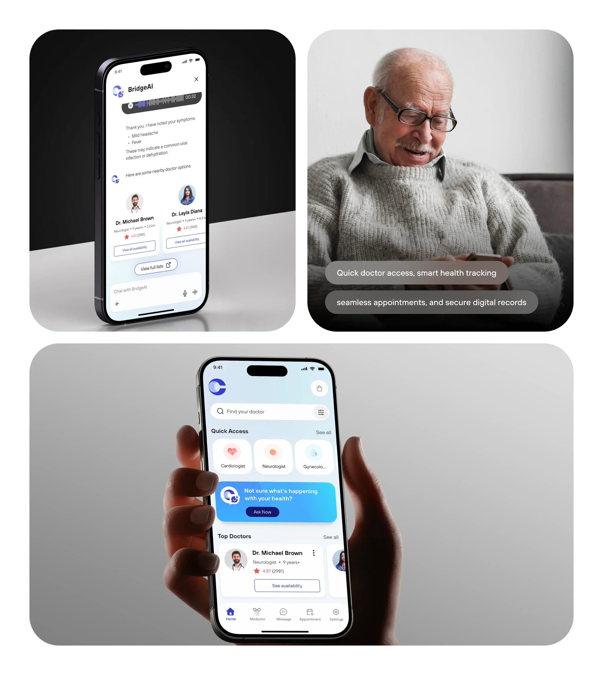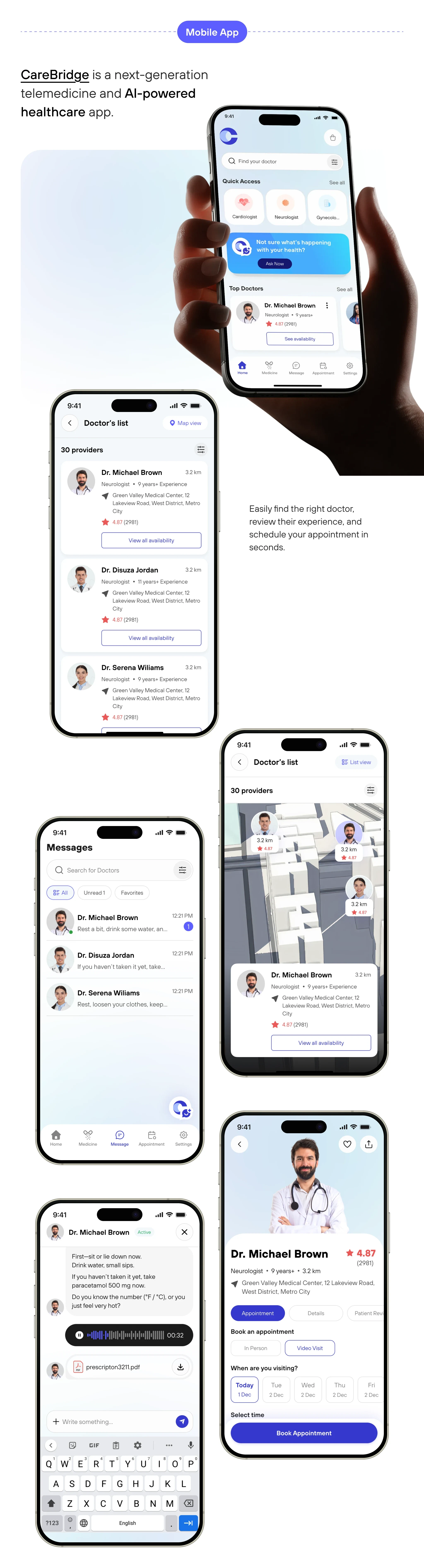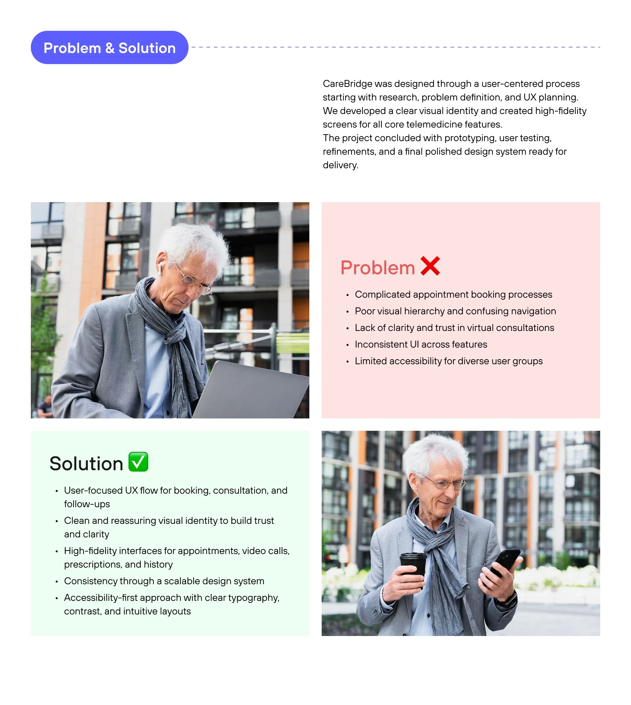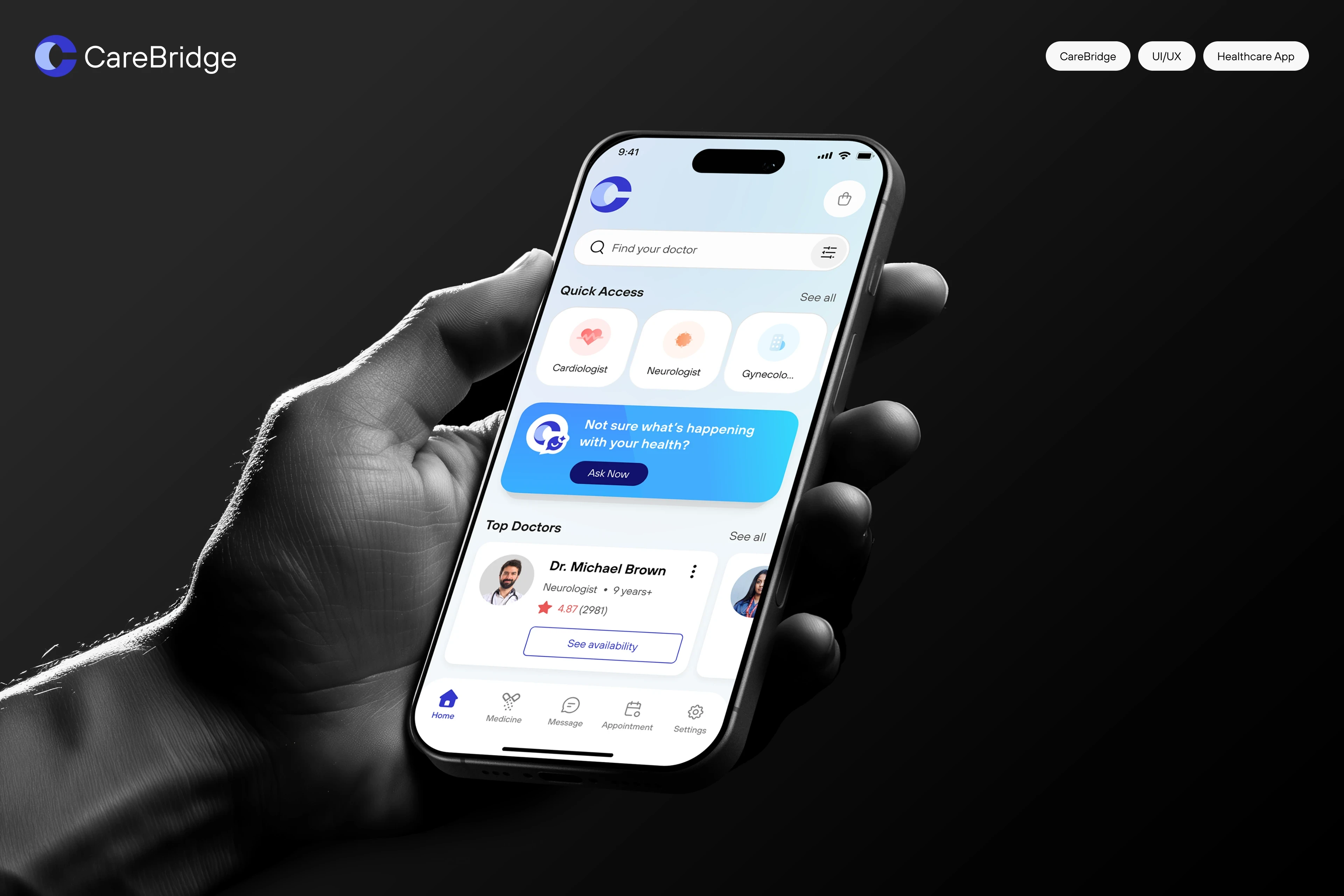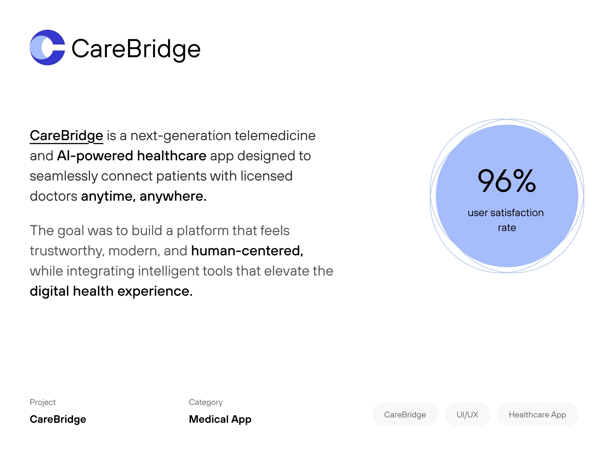 CareBridge project was designed through a user-centered process starting with research, problem definition, and UX planning. We developed a clear visual identi…