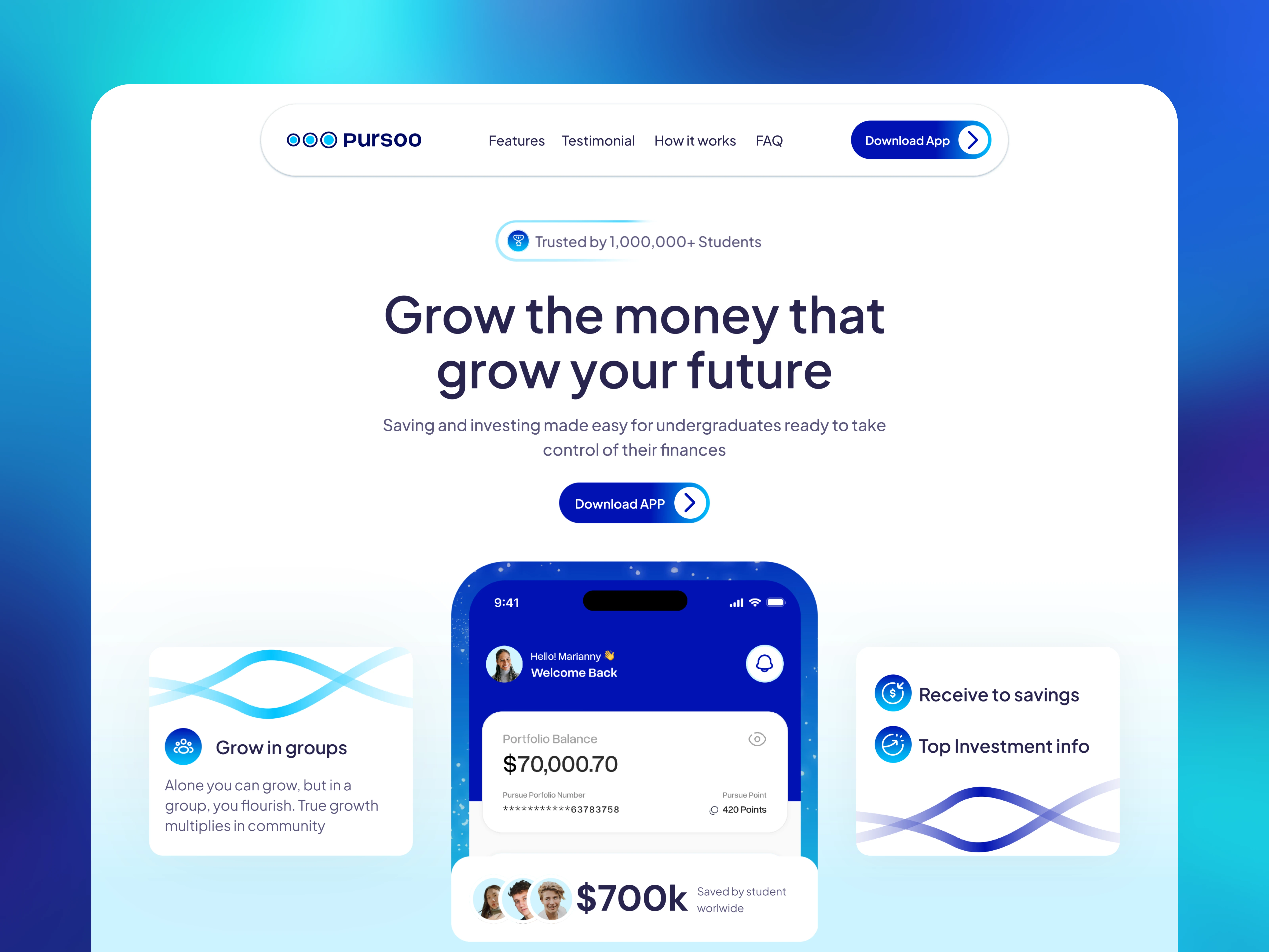 Pursoo is a modern fintech platform designed to empower students to track, manage, and grow their financial goals with ease. Built with simplicity, trust, and clarity at its core, Pursoo turns complex financial decisions into simple, actionable steps. Whether you're saving, investing, or budgeting, Pursoo gives you the tools to take control of your financial journey.
