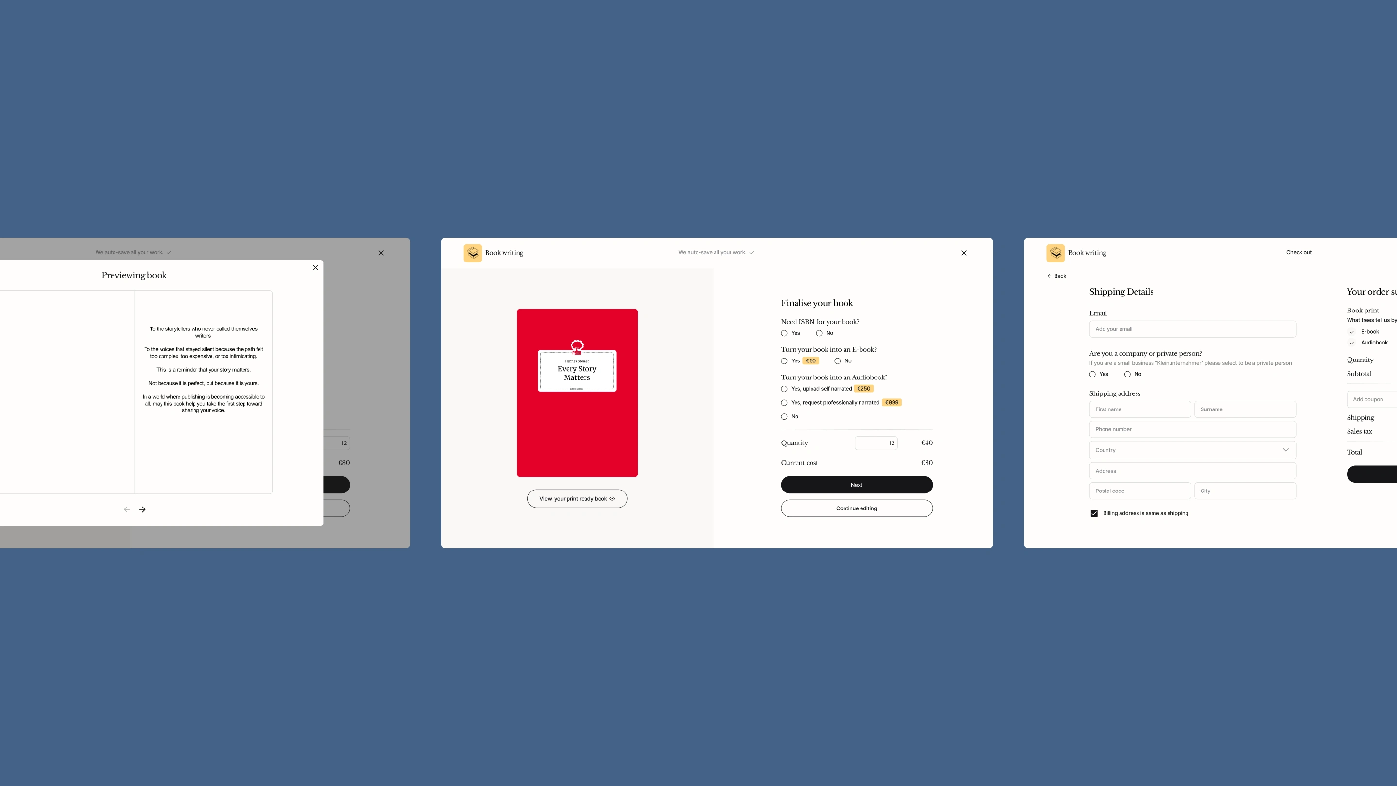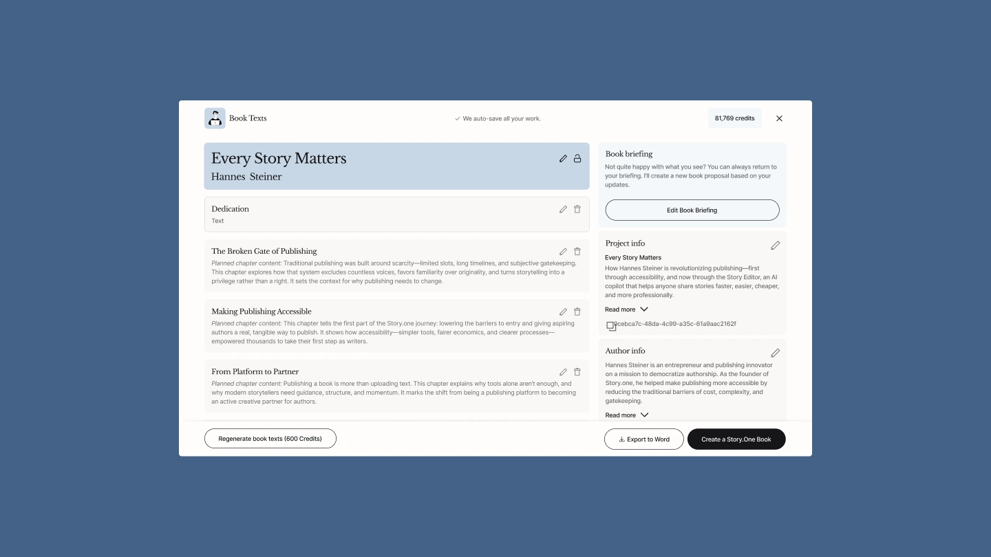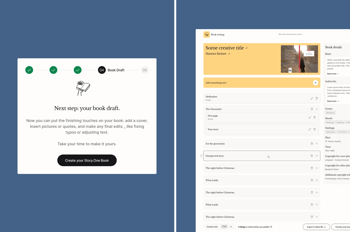Story.one is a platform that makes publishing more accessible by turning book creation into an intuitive, high-quality experience, enabling more people to write, shape, and publish their stories.