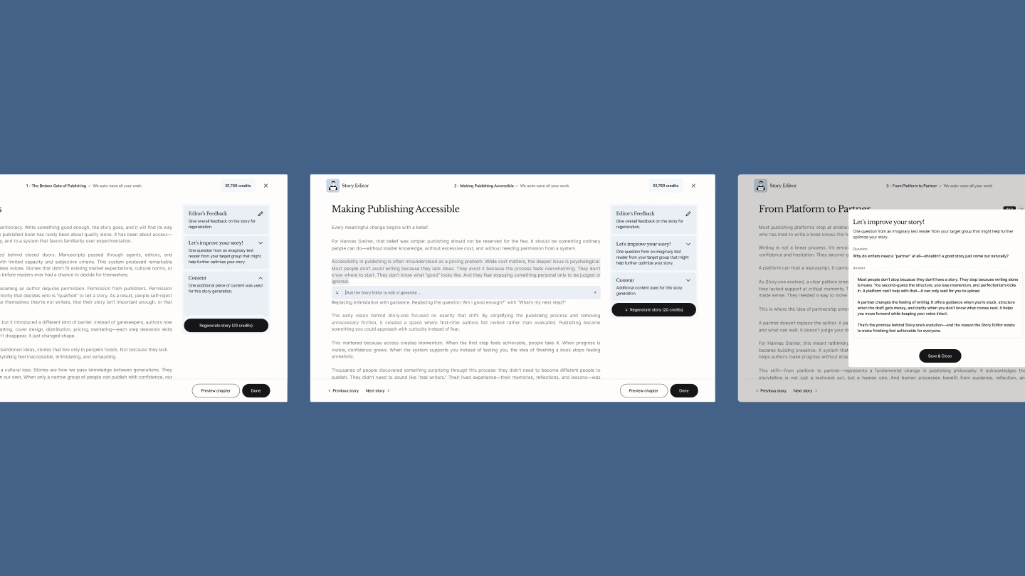 Story.one team to design the Story Editor, an AI-supported tool that guides authors from raw content to a publish-ready structure. The editor is built for speed, clarity, and creative control, helping writers organize chapters, refine narrative flow, and receive smart suggestions while remaining fully in charge of their work.