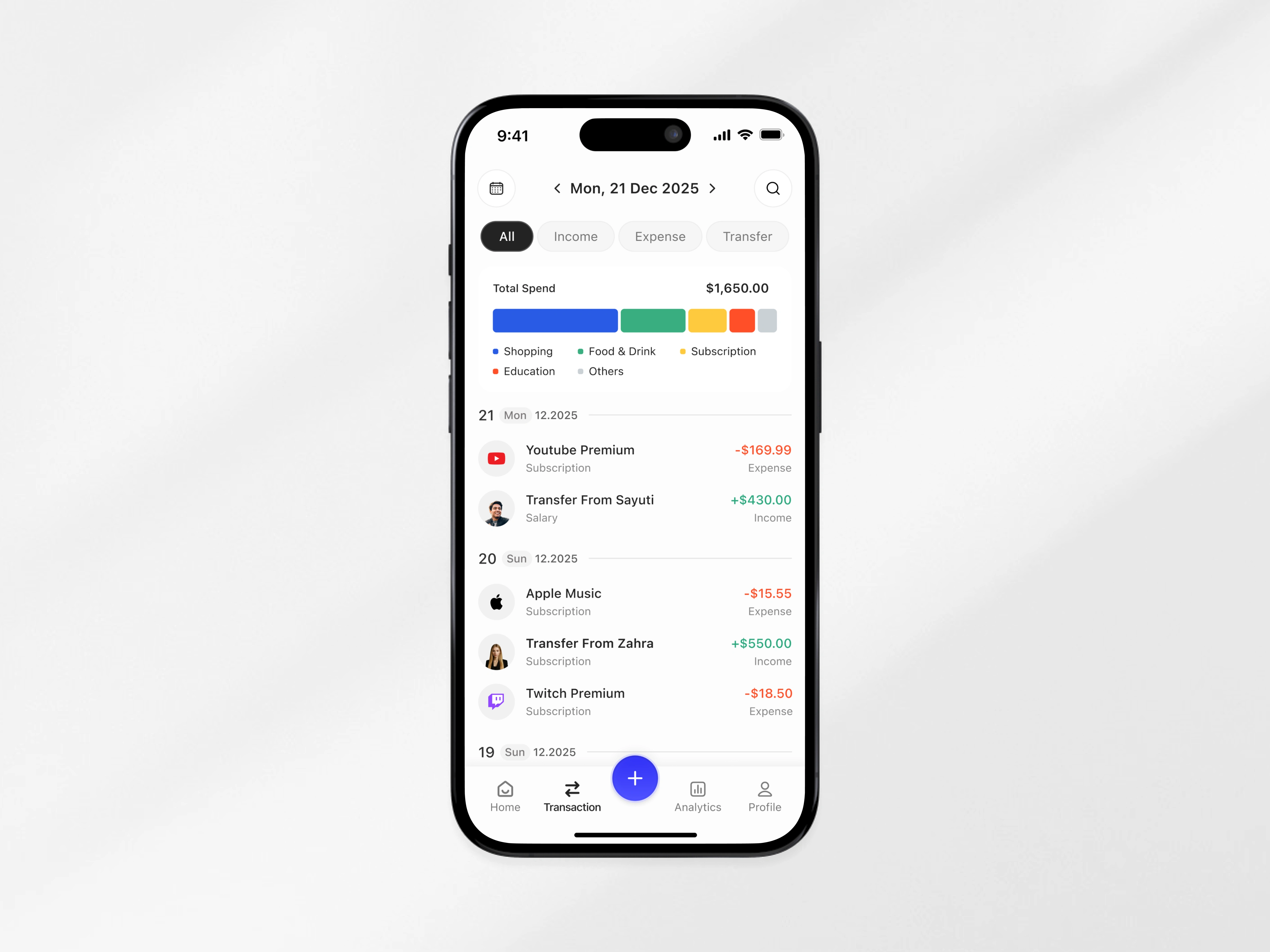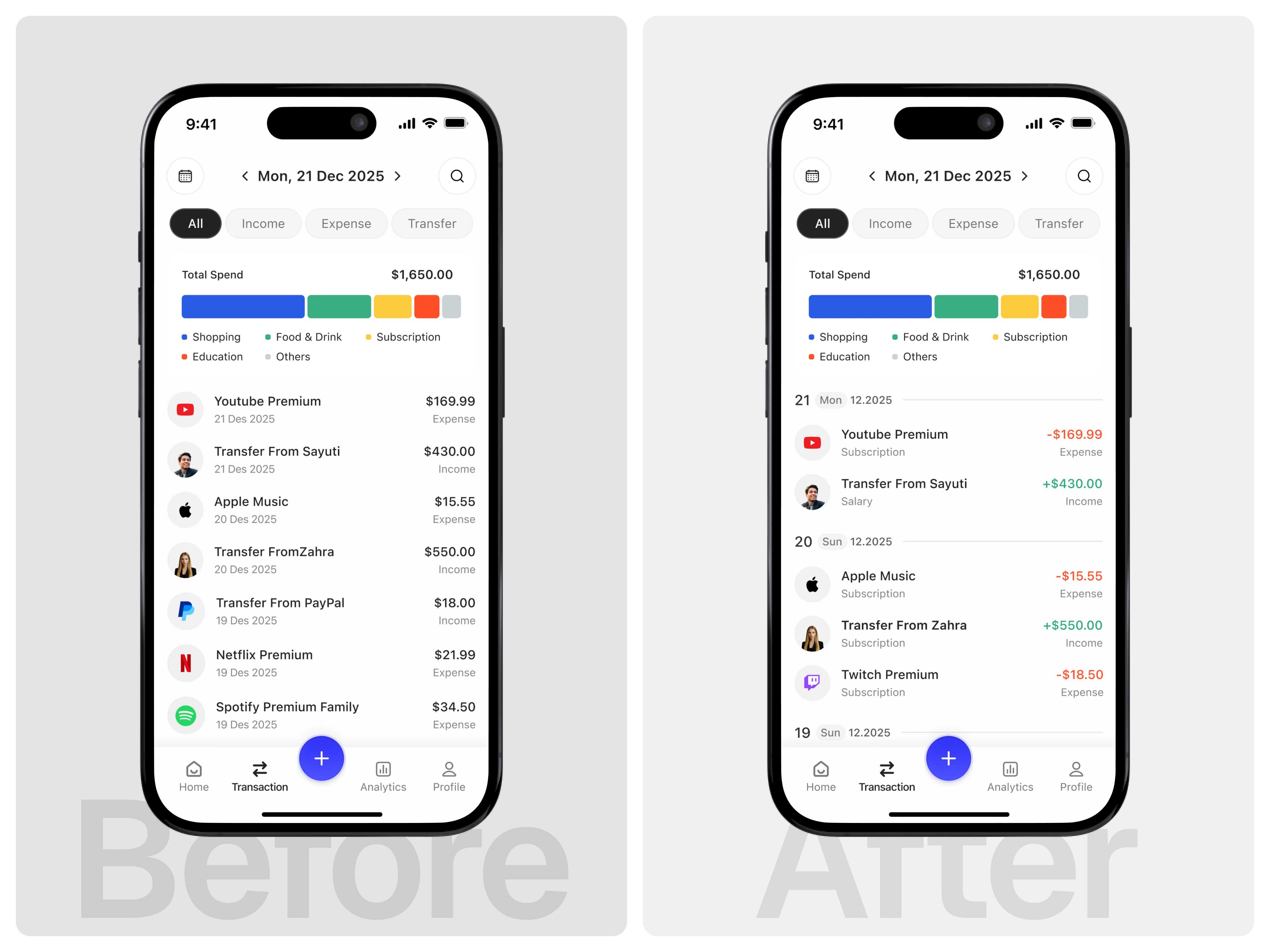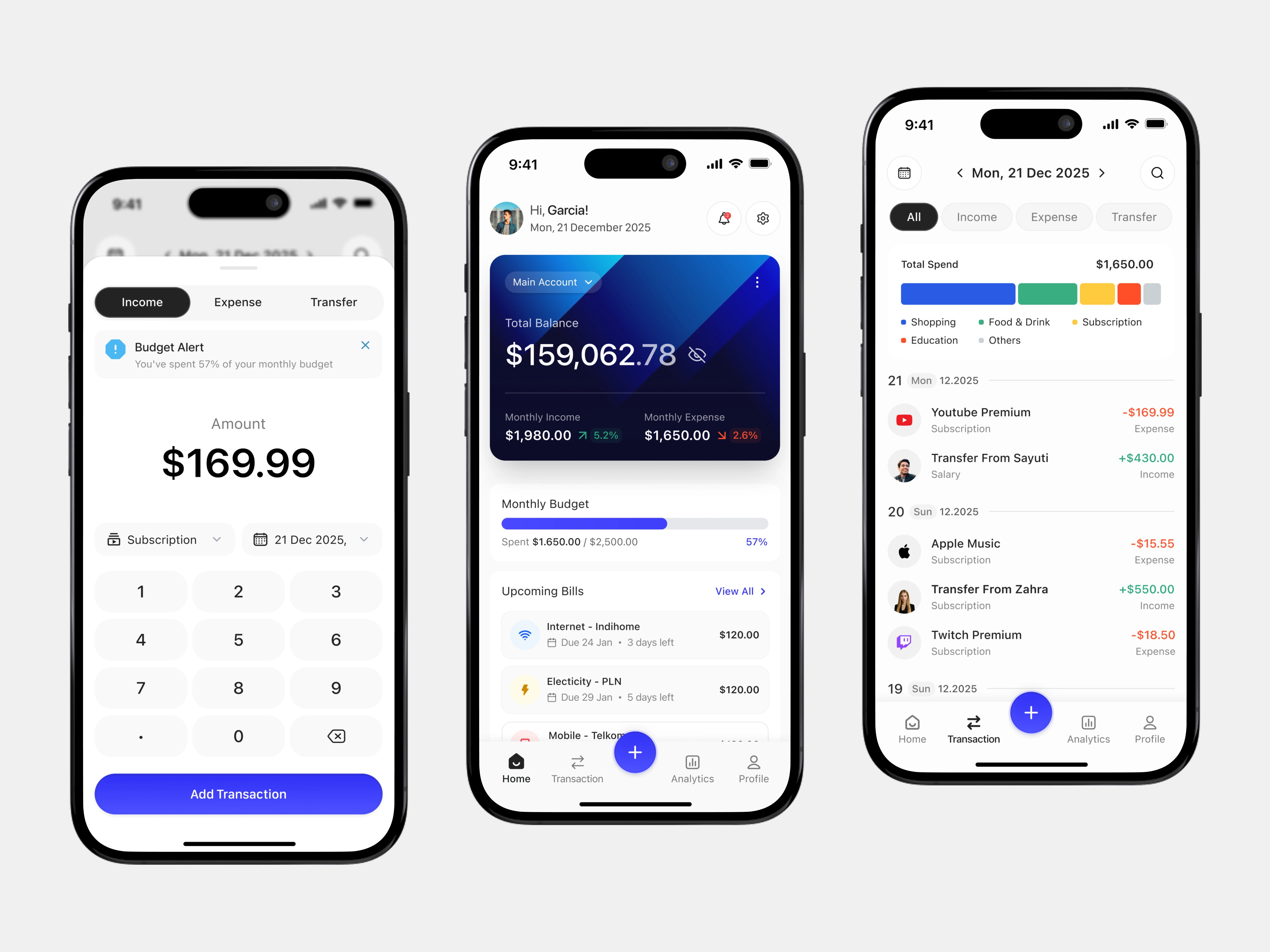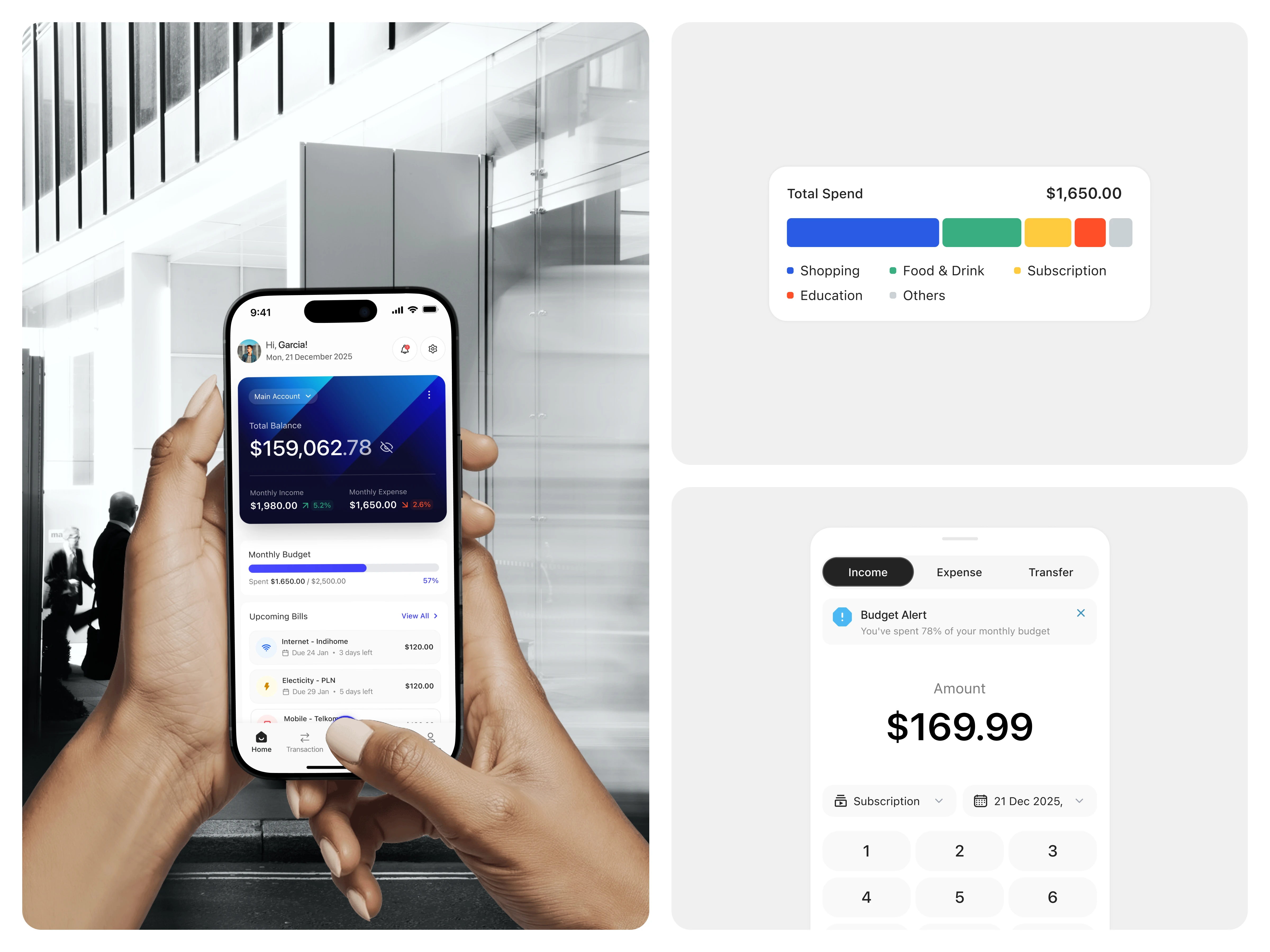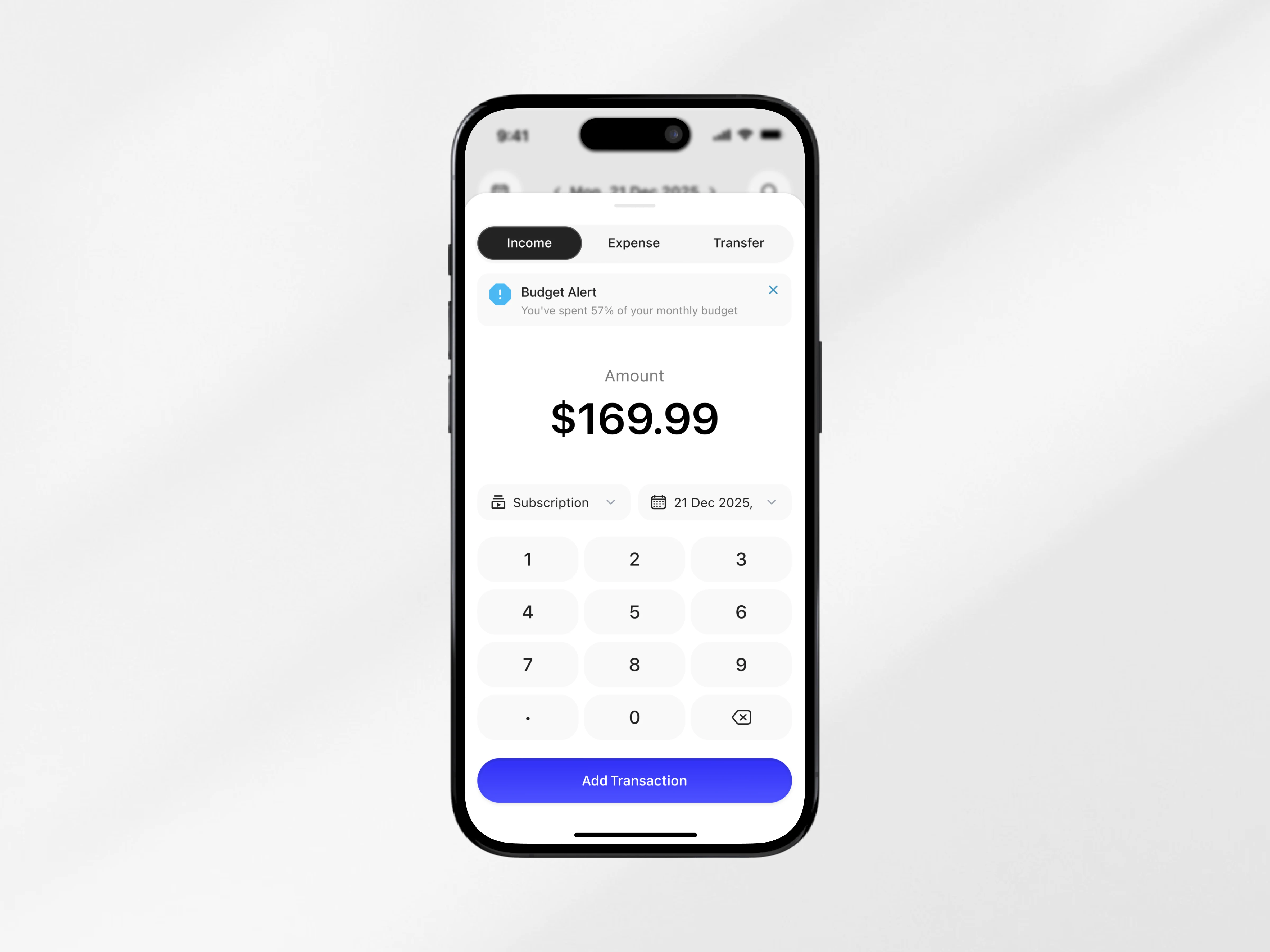 We designed the app with a mobile-first mindset, focusing on clarity, accessibility, and quick interactions. Key financial information such as total balance, monthly income, expenses, and budget usage is surfaced immediately. Clear categorization, subtle alerts, and friendly visual cues guide users through daily transactions without friction.