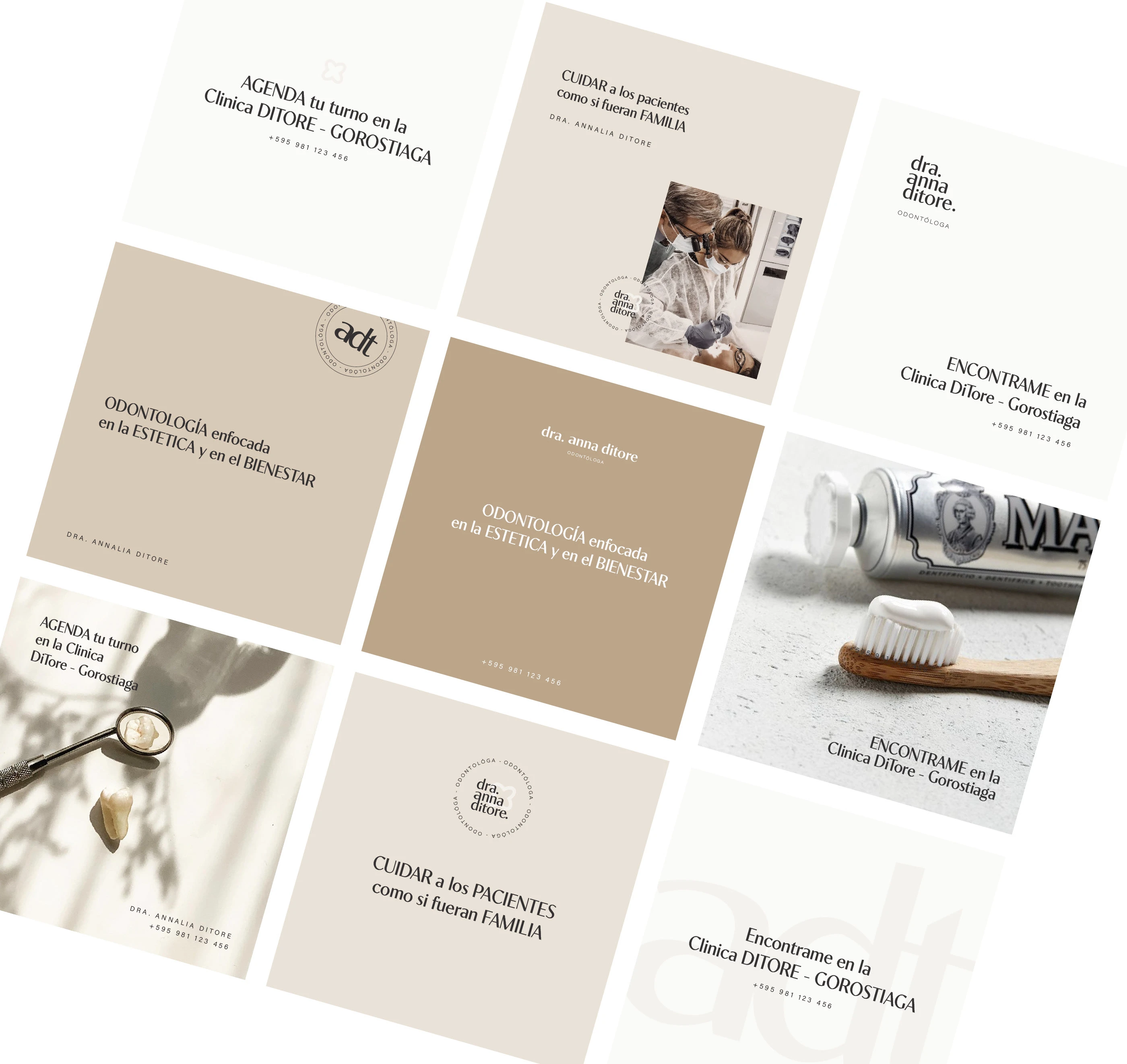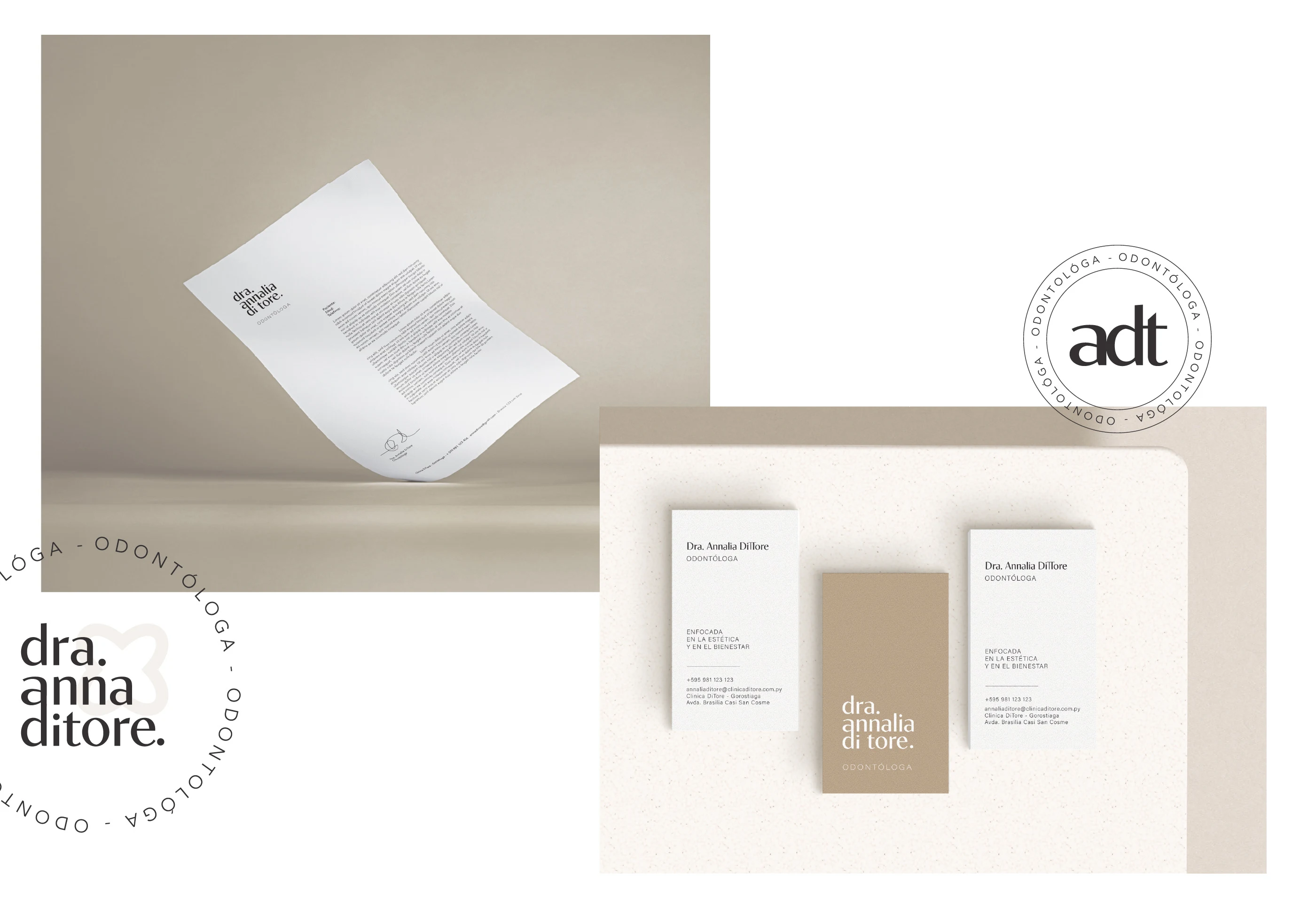 Design of the visual identity for Annalia DiTore, a dentist specialized in orthodontics and dental aesthetics, who has been working for more than 18 years at the DiTore Gorostiaga Clinic. Our goal was to create a strong and coherent brand that reflected Annalia's key values: caring for patients as if they were family, ethics, responsibility, and trust.